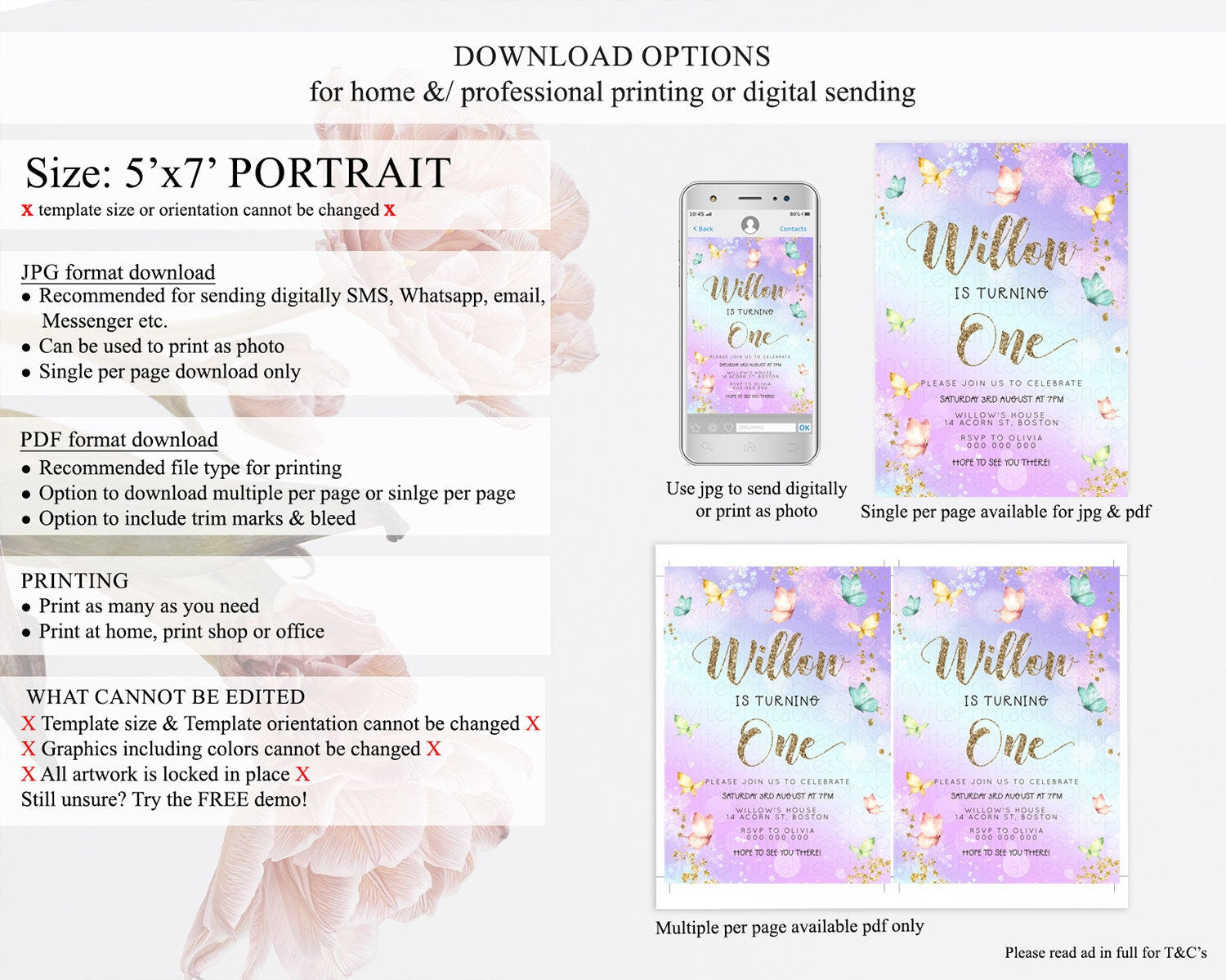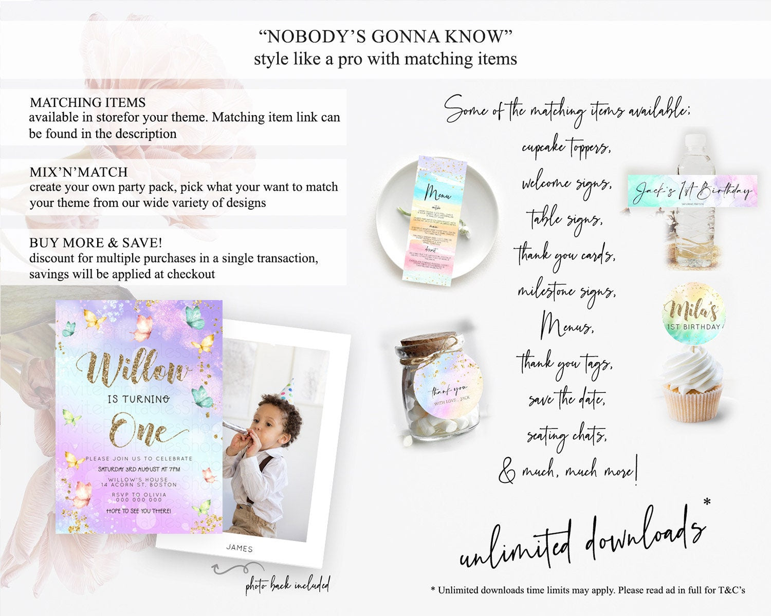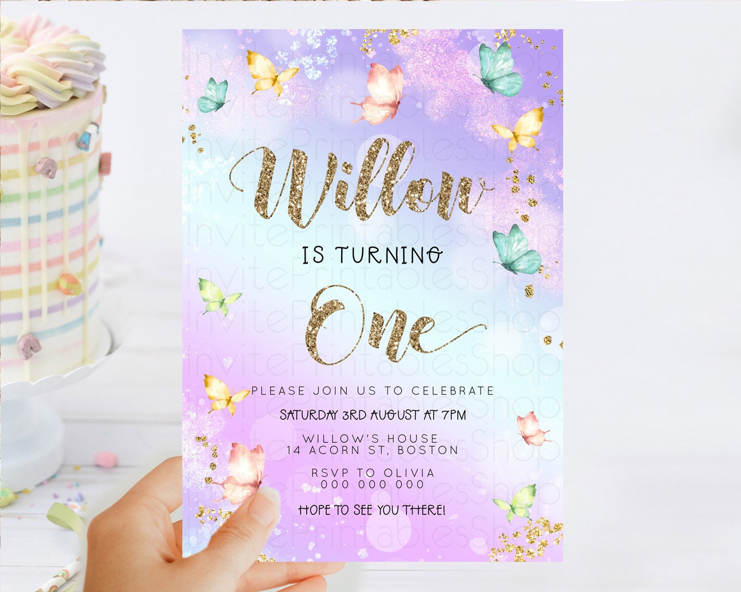 Pastel Butterfly Birthday Invitation Butterfly Birthday Invitation Colorful Splash Glitter Butterfly Garden 1st 2nd Birthday D23094