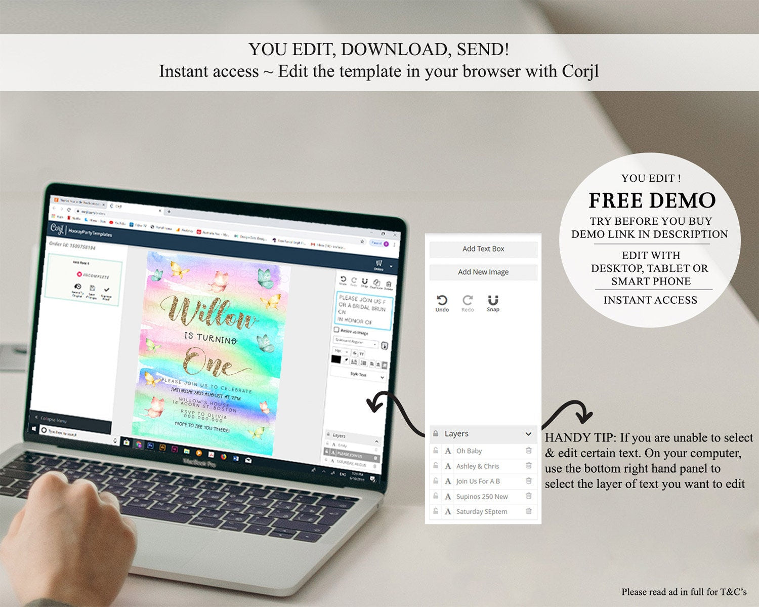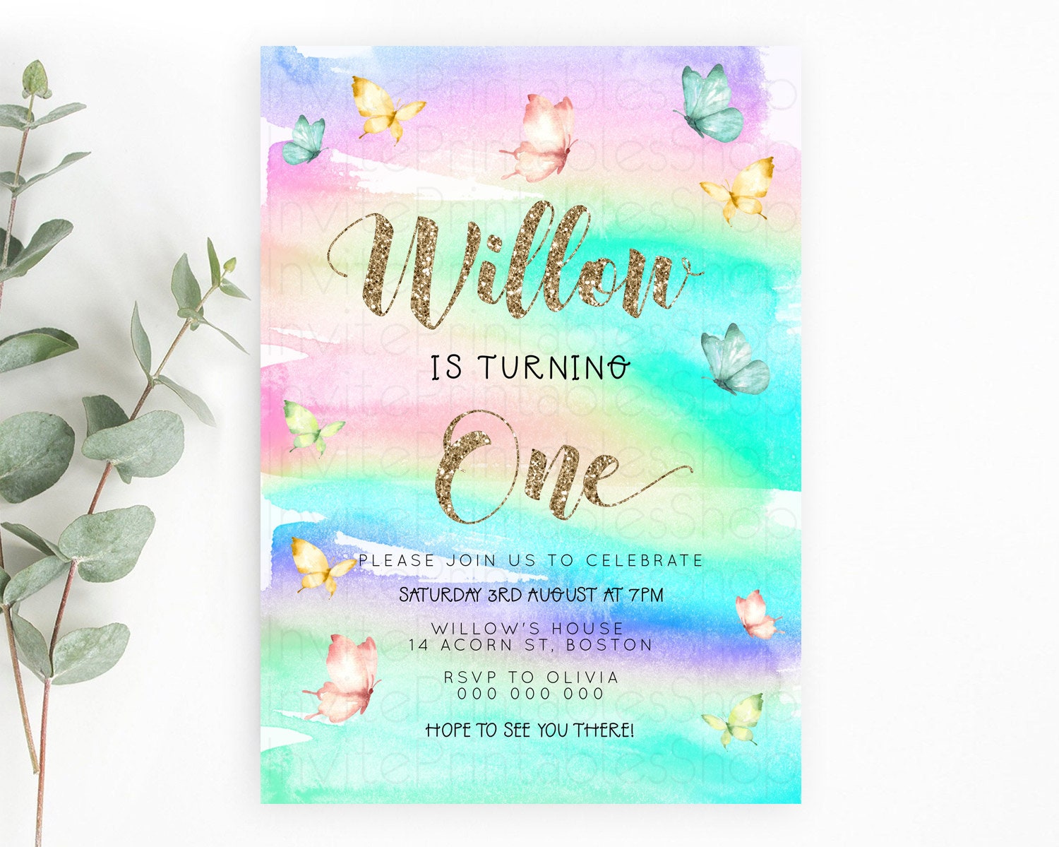 Pastel Butterfly Birthday Invitation Butterfly Birthday Invitation Colorful Splash Glitter Butterfly Garden 1st 2nd Birthday D23214
