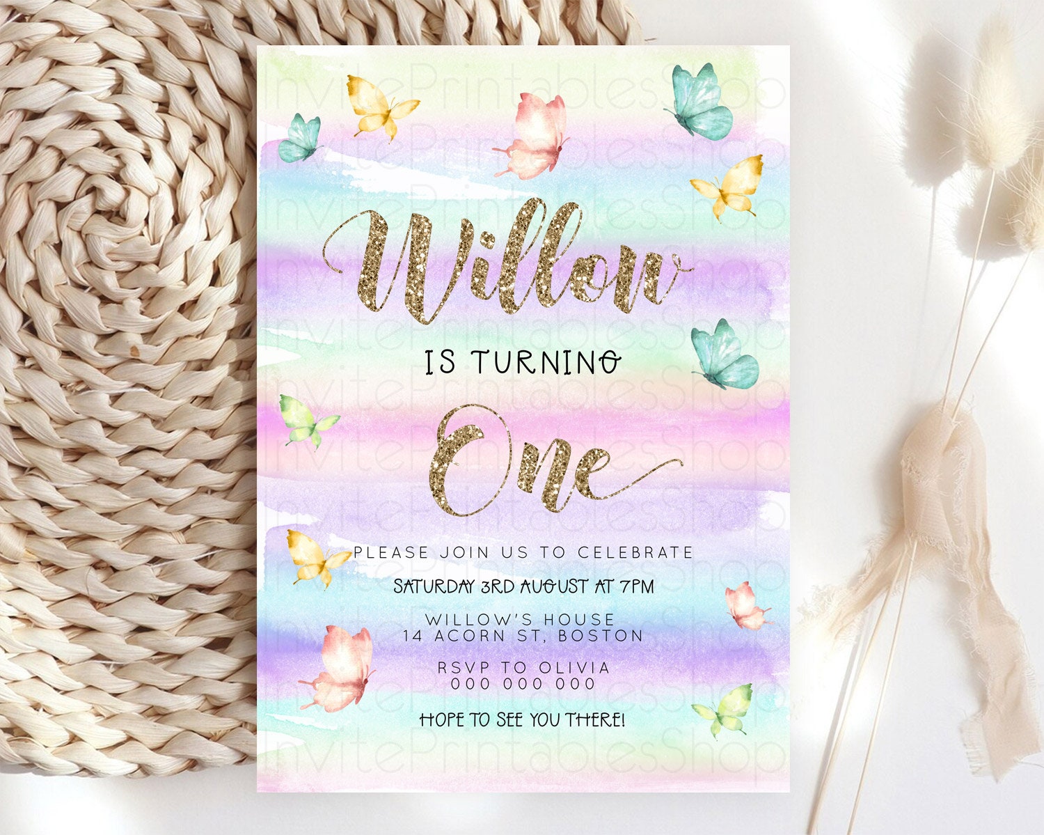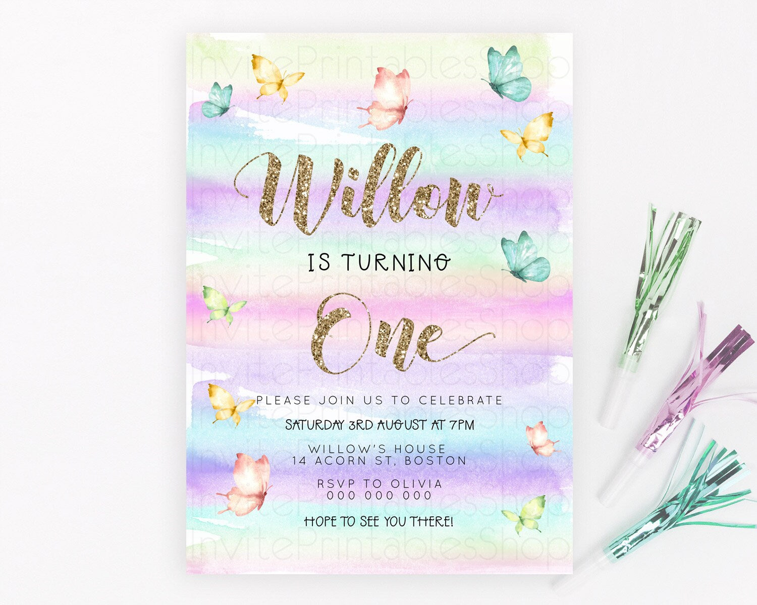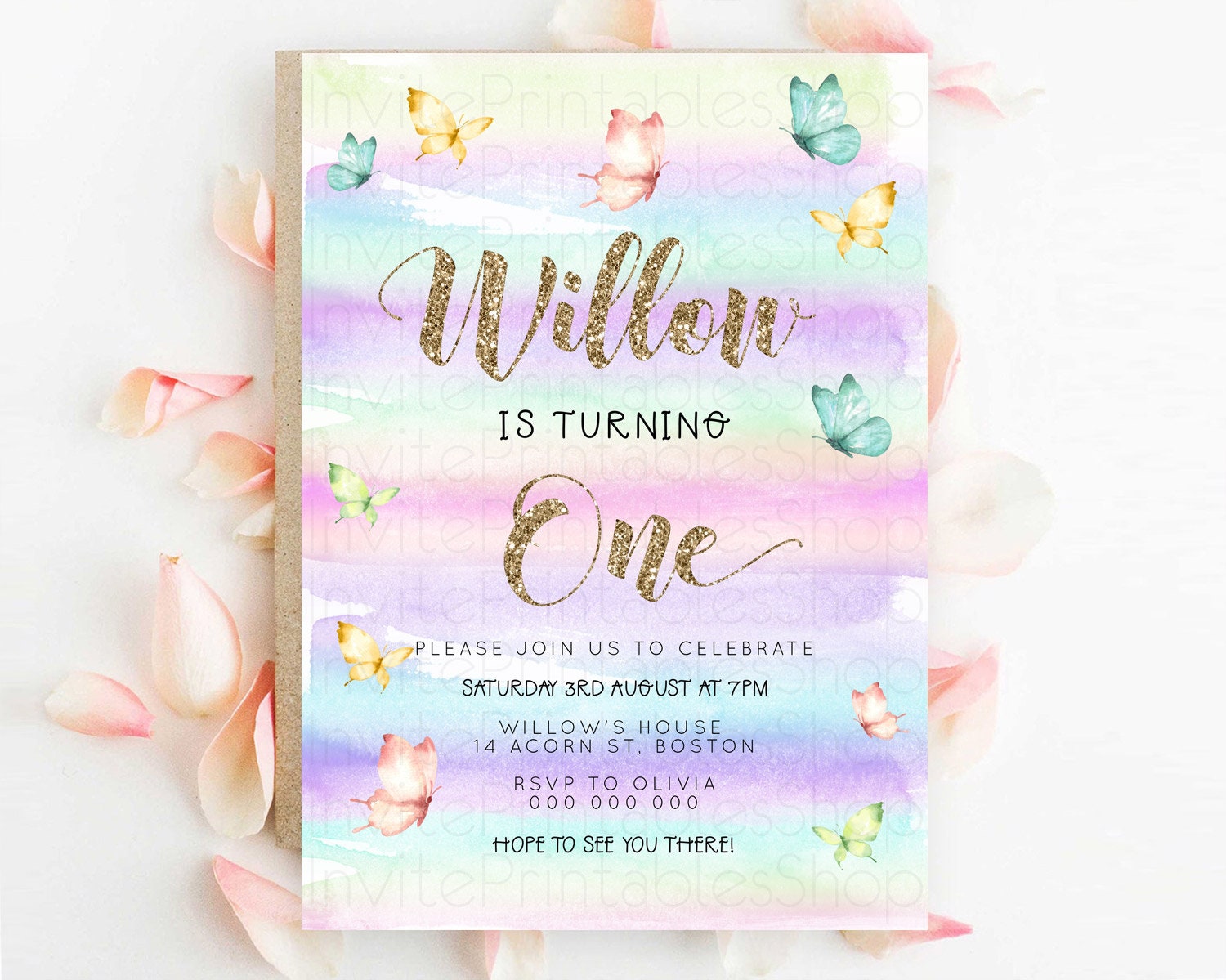 Pastel Butterfly Birthday Invitation Butterfly Birthday Invitation Colorful Splash Glitter Butterfly Garden 1st 2nd Birthday D23216