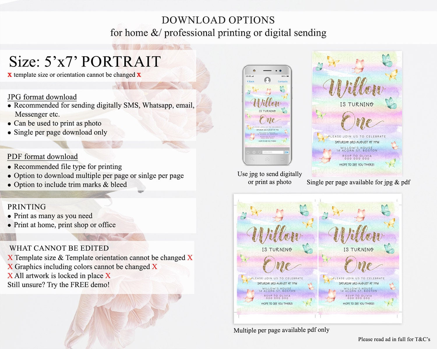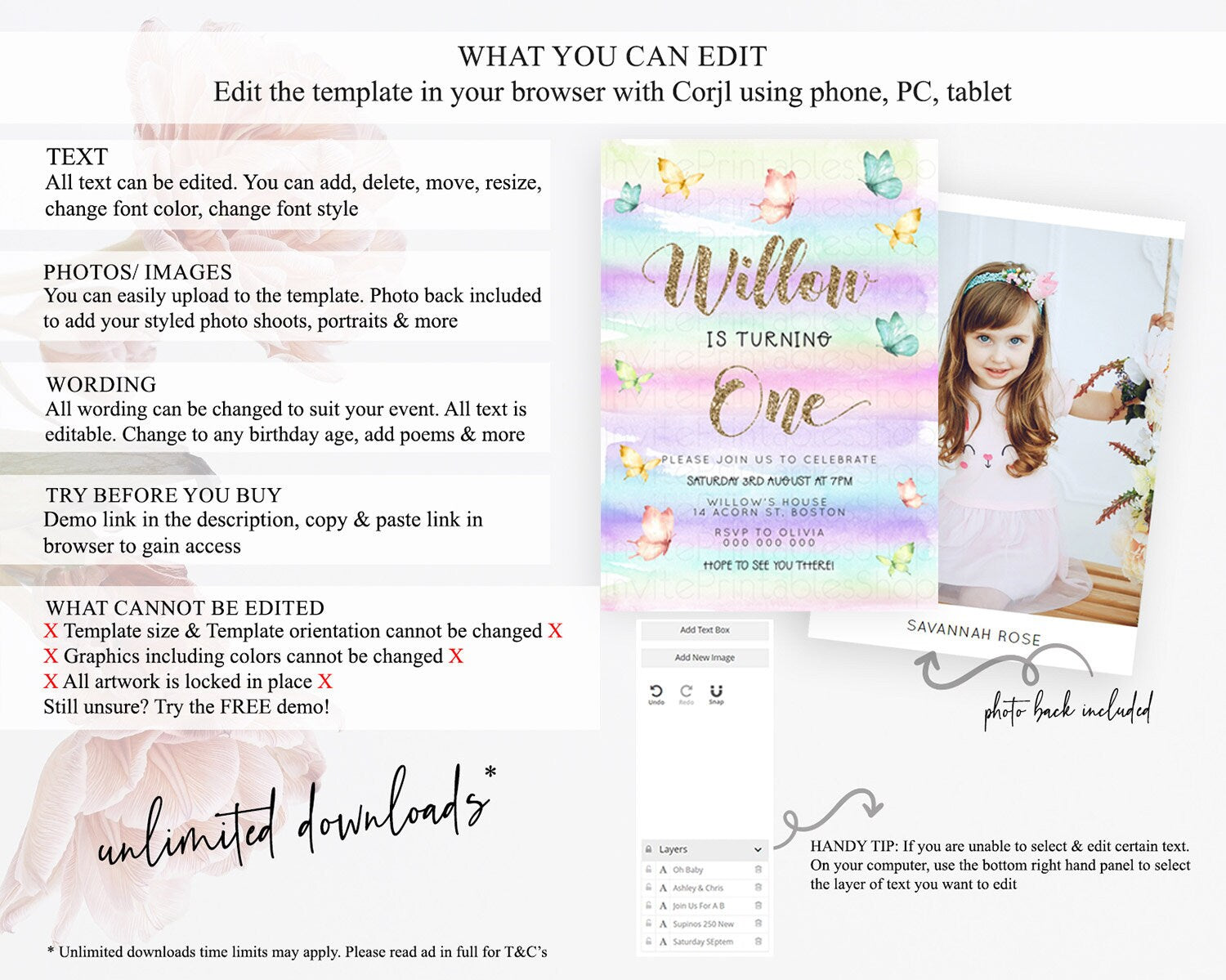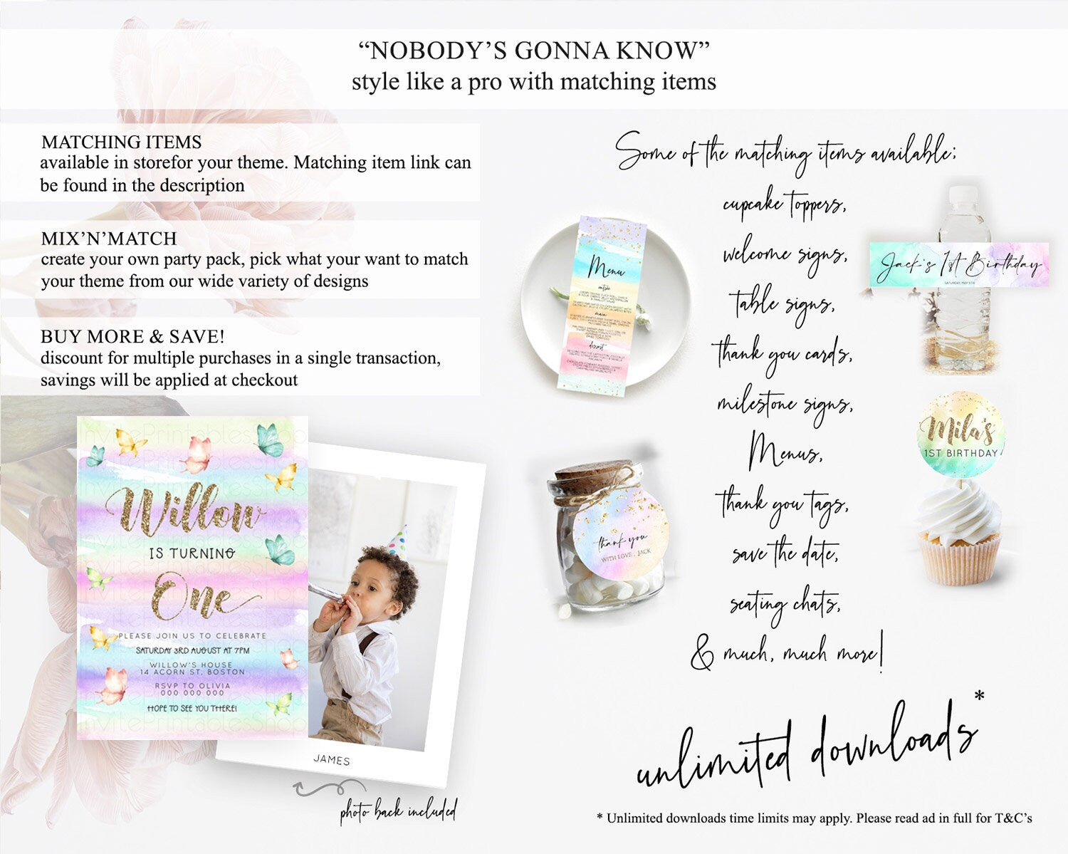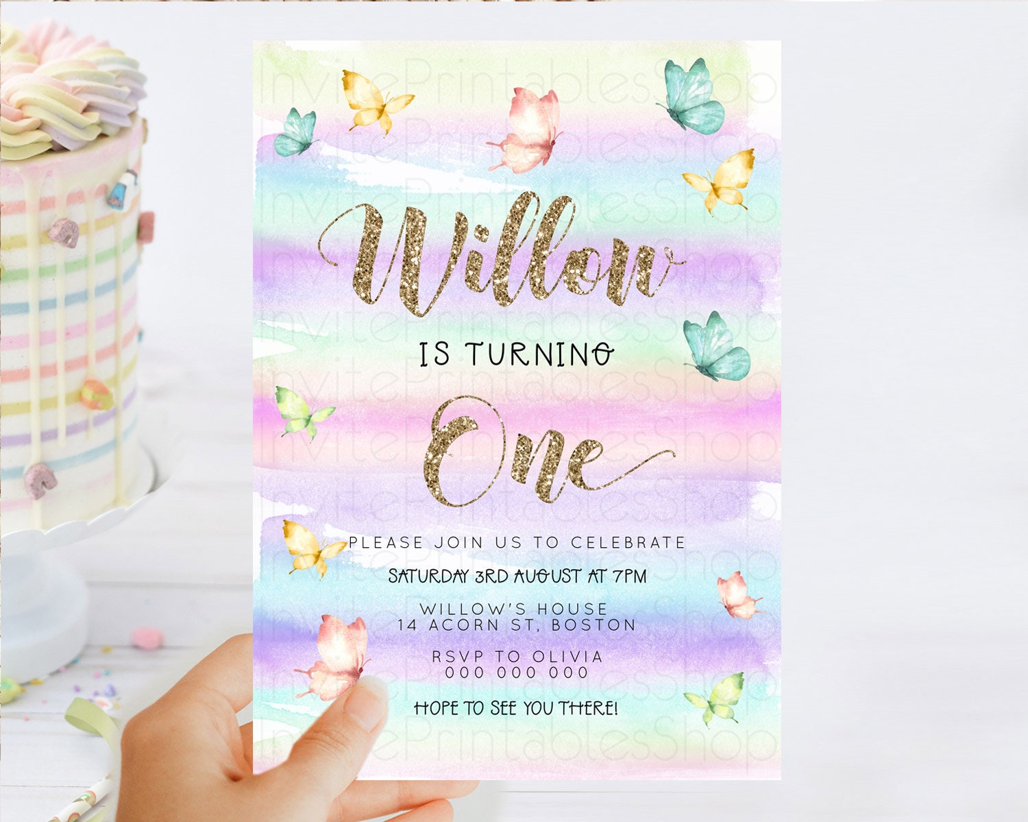 Pastel Butterfly Birthday Invitation Butterfly Birthday Invitation Colorful Splash Glitter Butterfly Garden 1st 2nd Birthday D23216