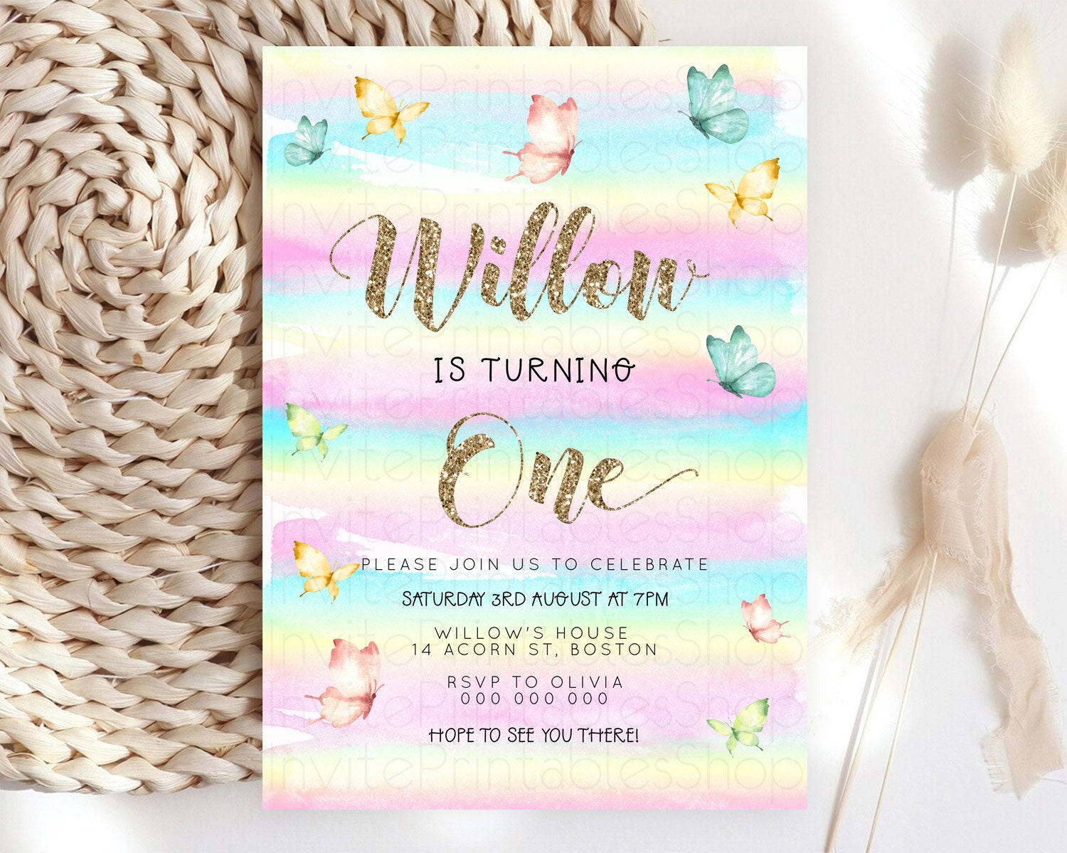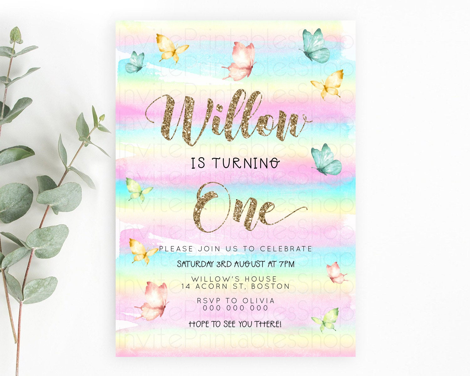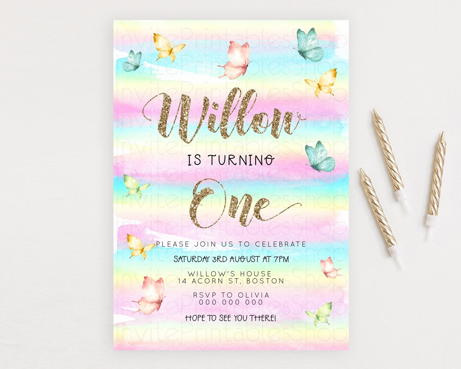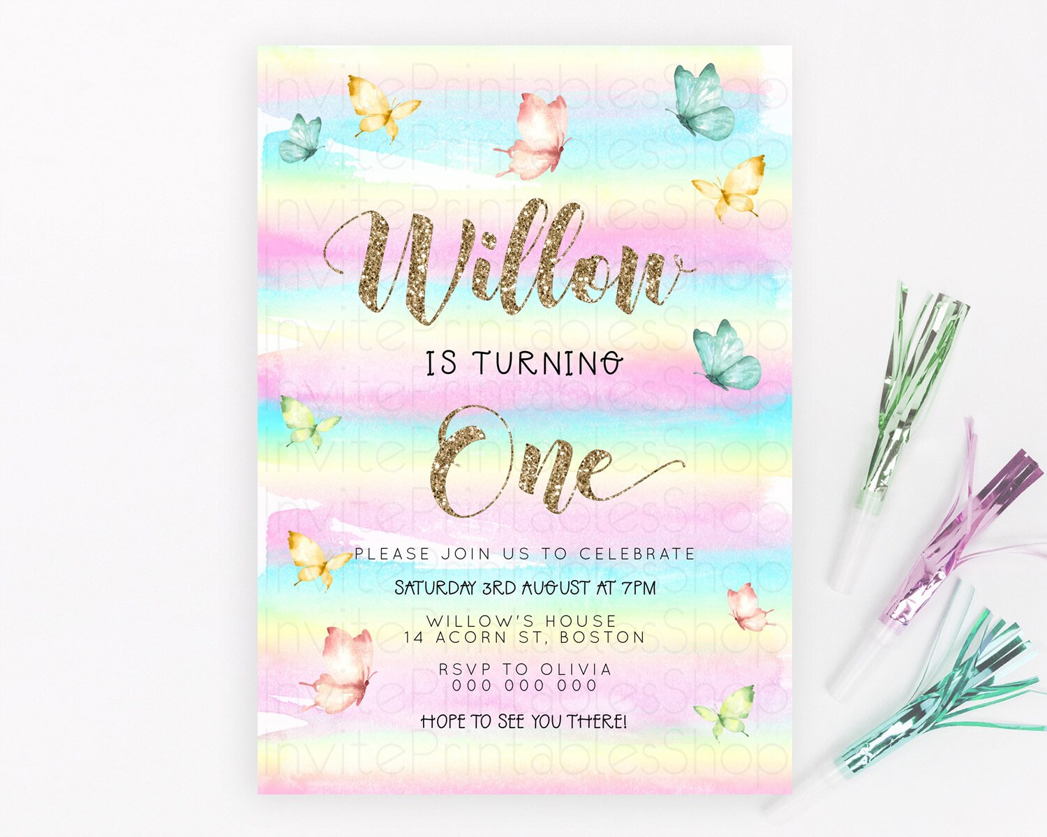 Pastel Butterfly Birthday Invitation Butterfly Birthday Invitation Colorful Splash Glitter Butterfly Garden 1st 2nd Birthday D23218