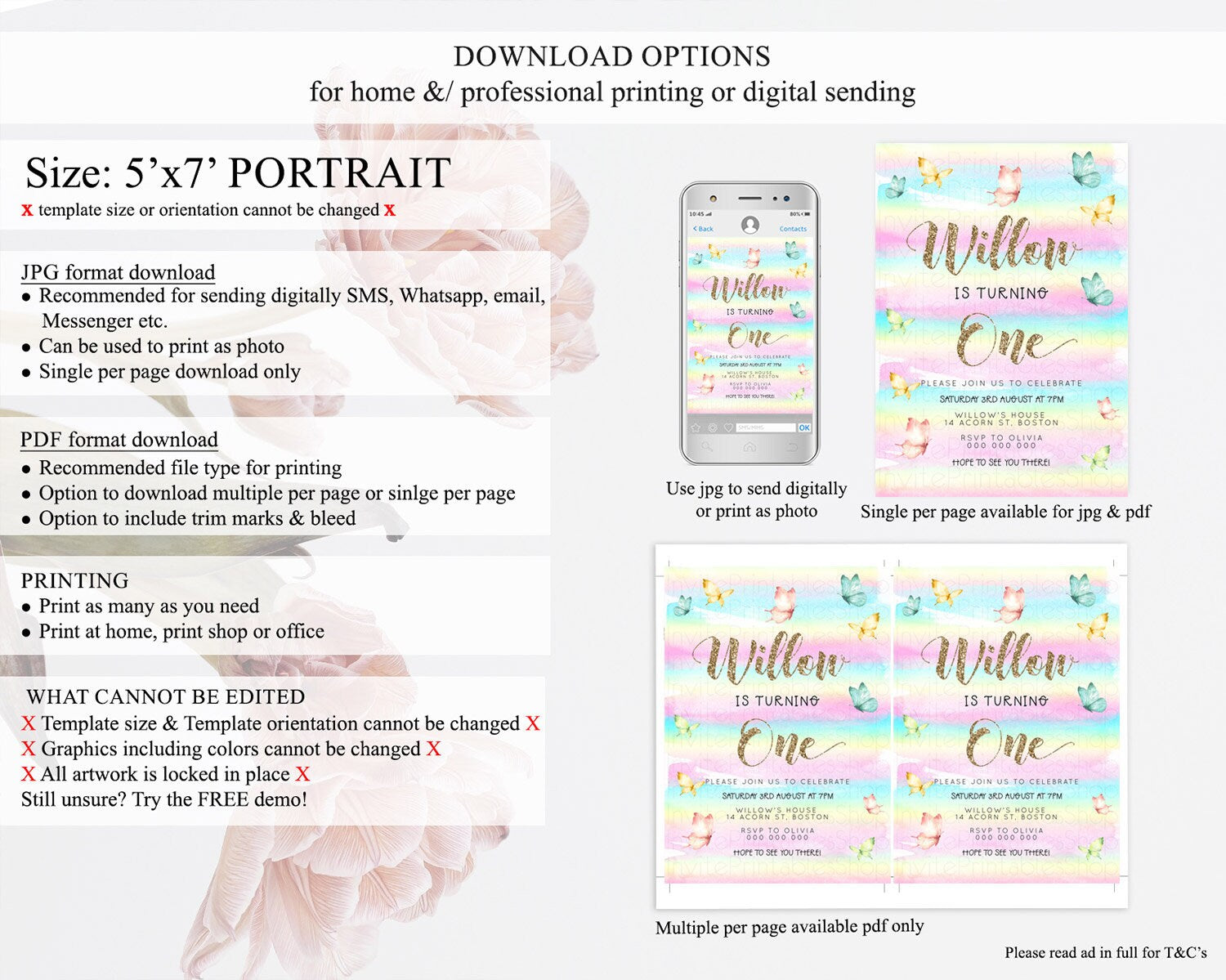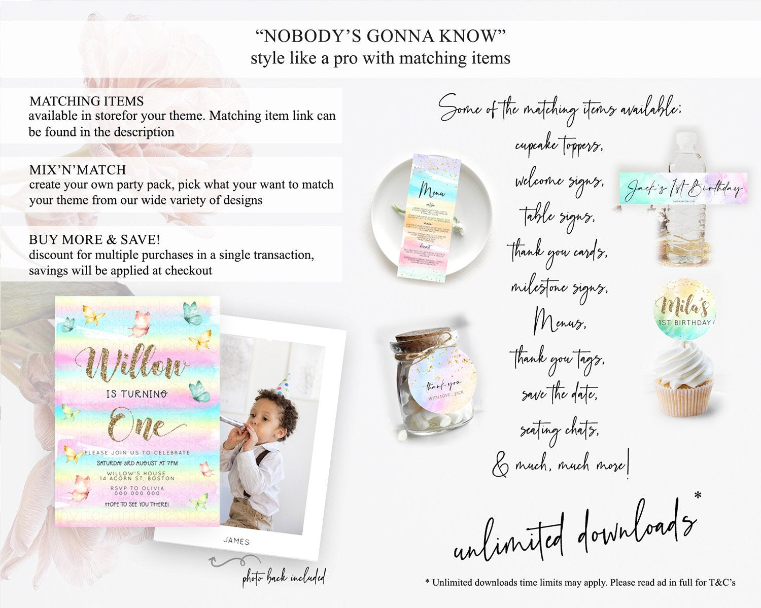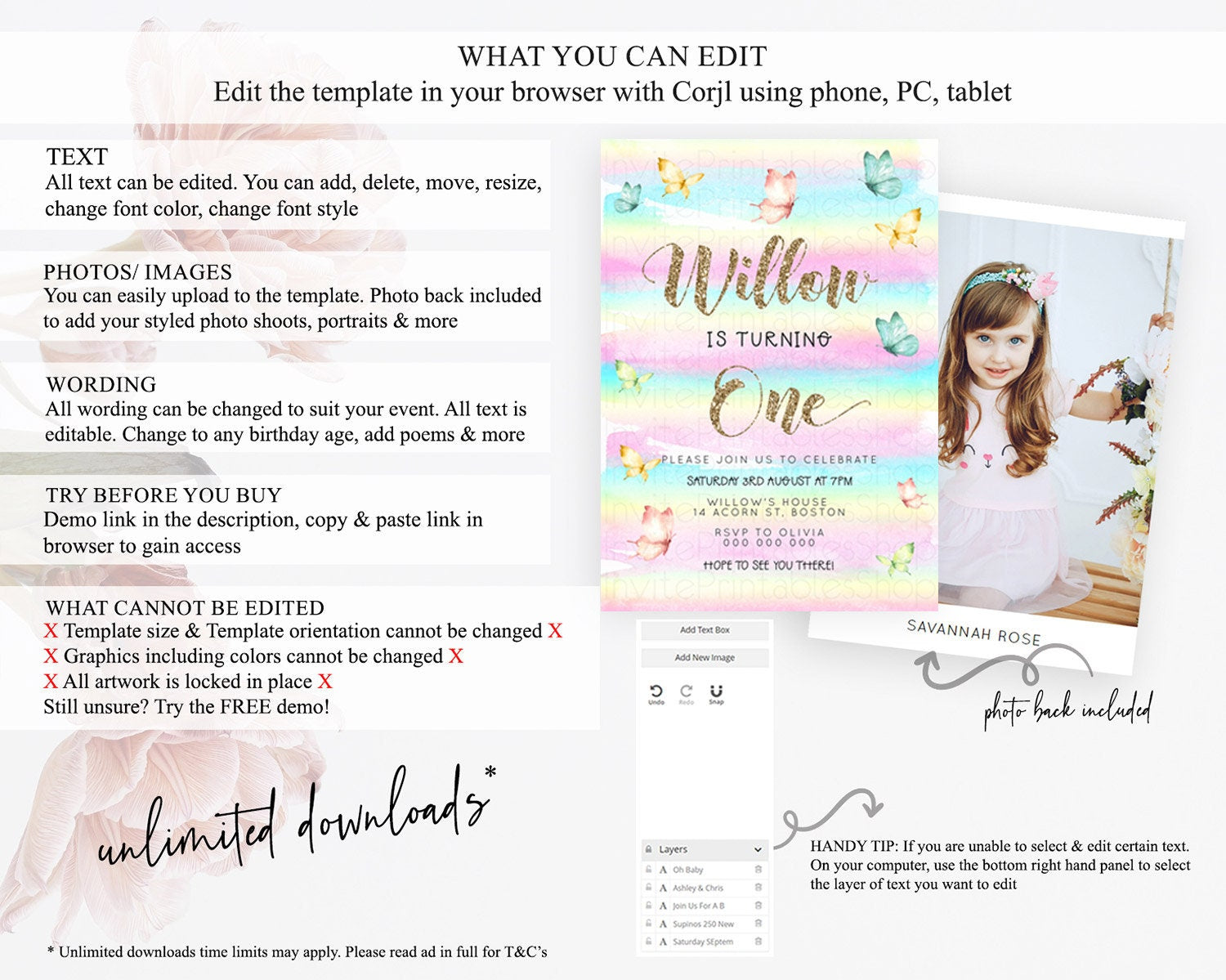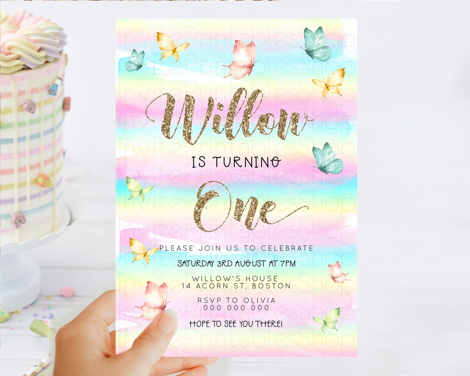 Pastel Butterfly Birthday Invitation Butterfly Birthday Invitation Colorful Splash Glitter Butterfly Garden 1st 2nd Birthday D23218
