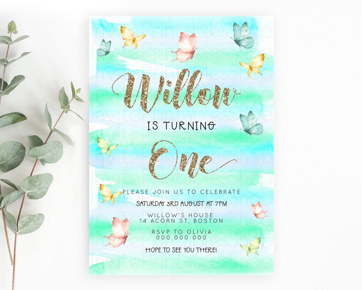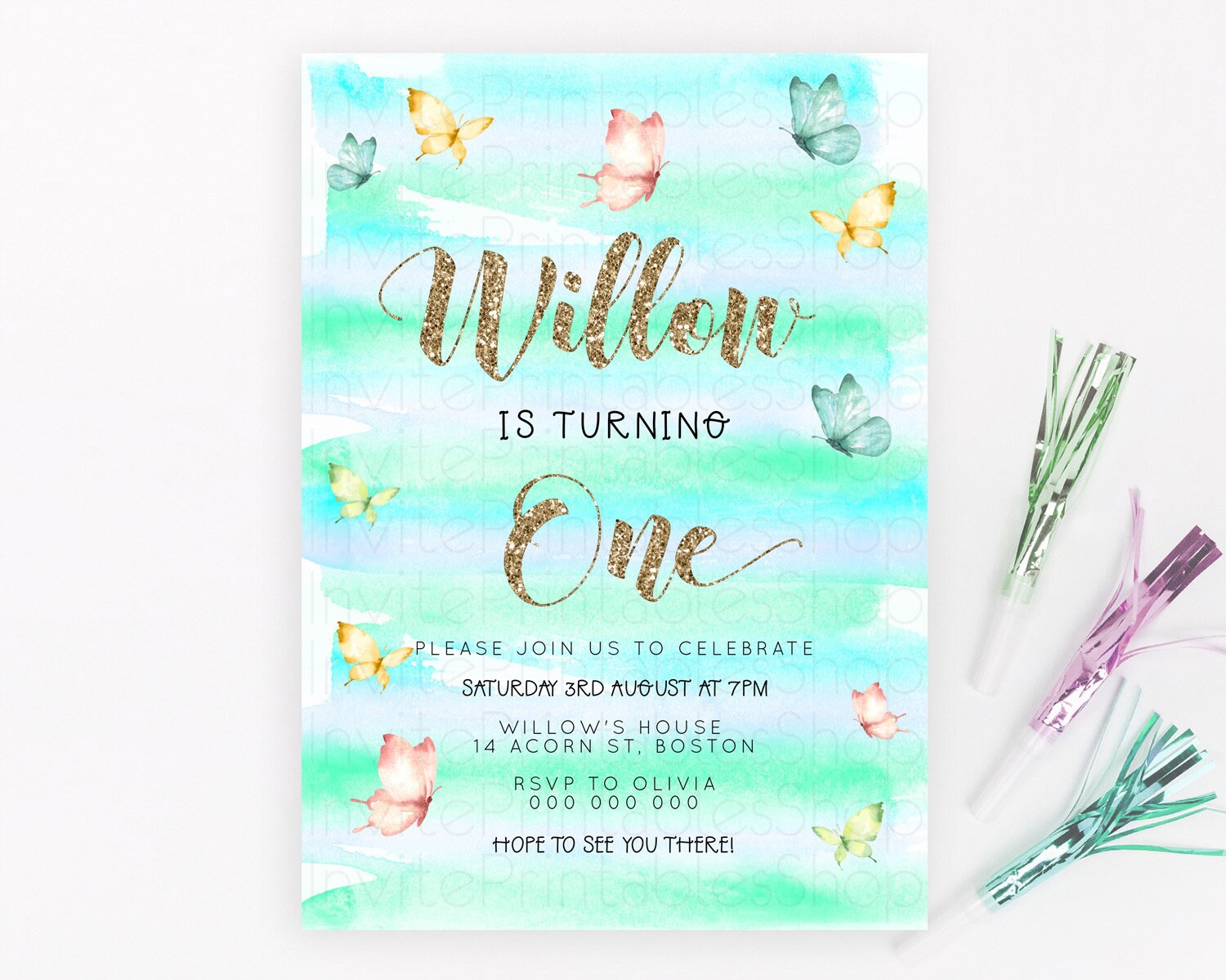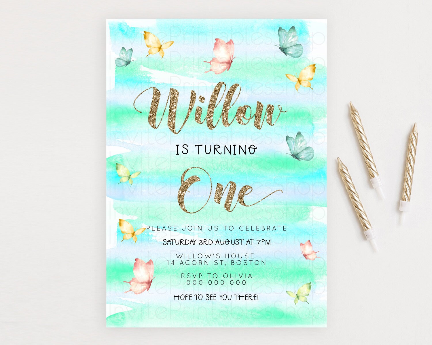 Pastel Butterfly Birthday Invitation Butterfly Birthday Invitation Colorful Splash Glitter Butterfly Garden 1st 2nd Birthday D23220