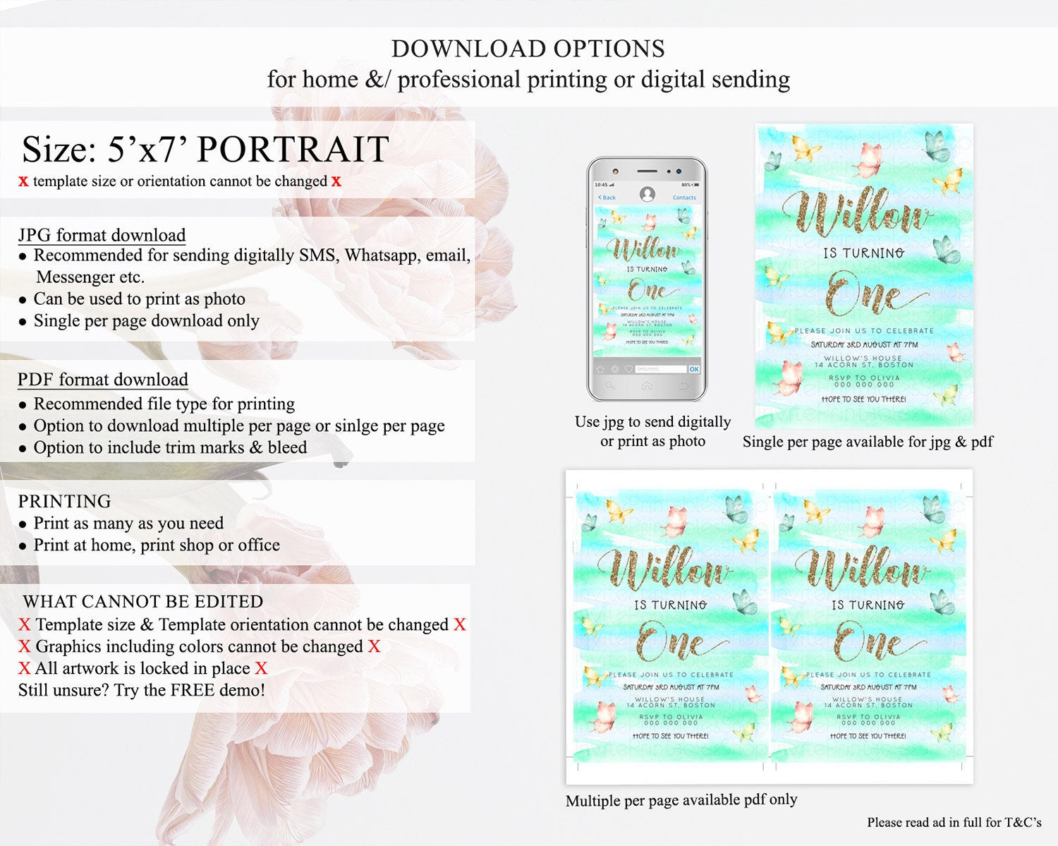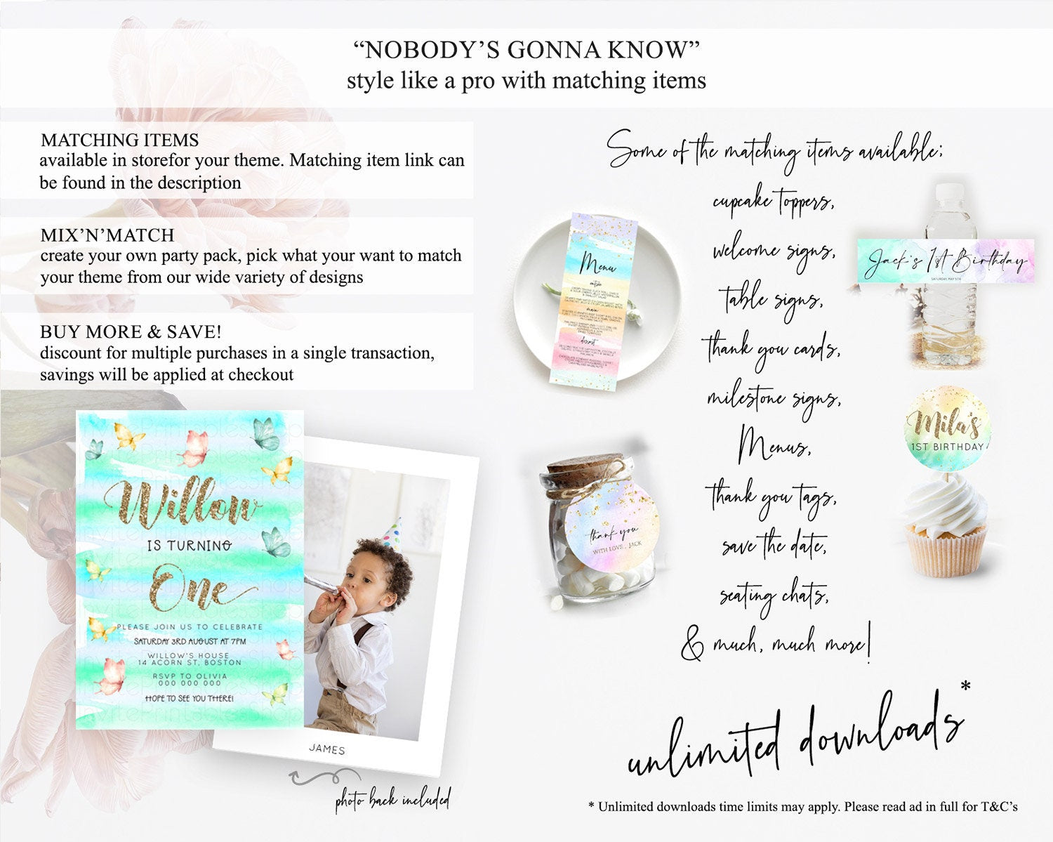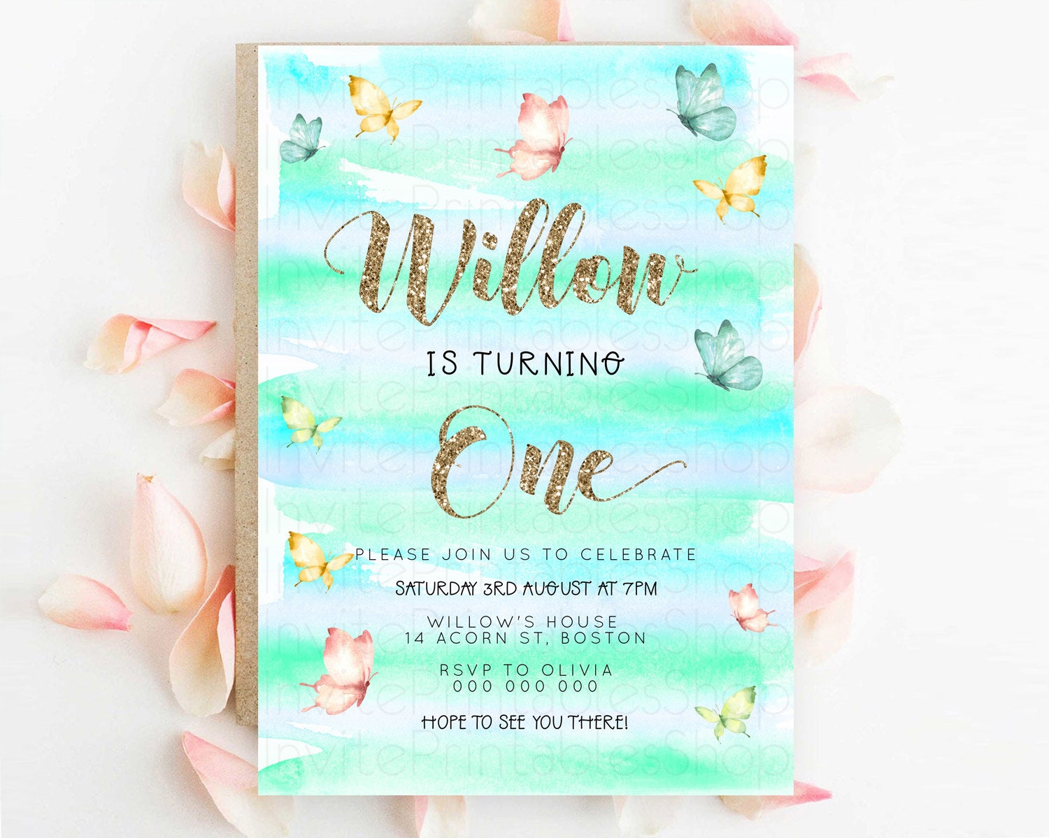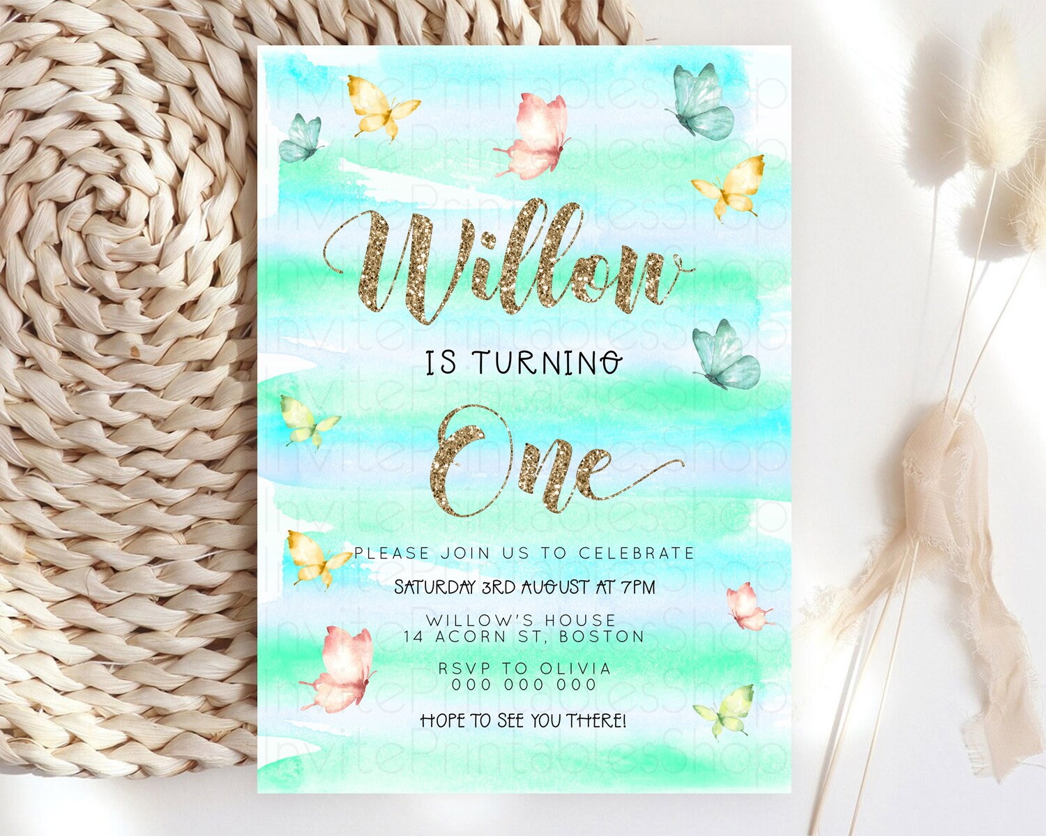 Pastel Butterfly Birthday Invitation Butterfly Birthday Invitation Colorful Splash Glitter Butterfly Garden 1st 2nd Birthday D23220
