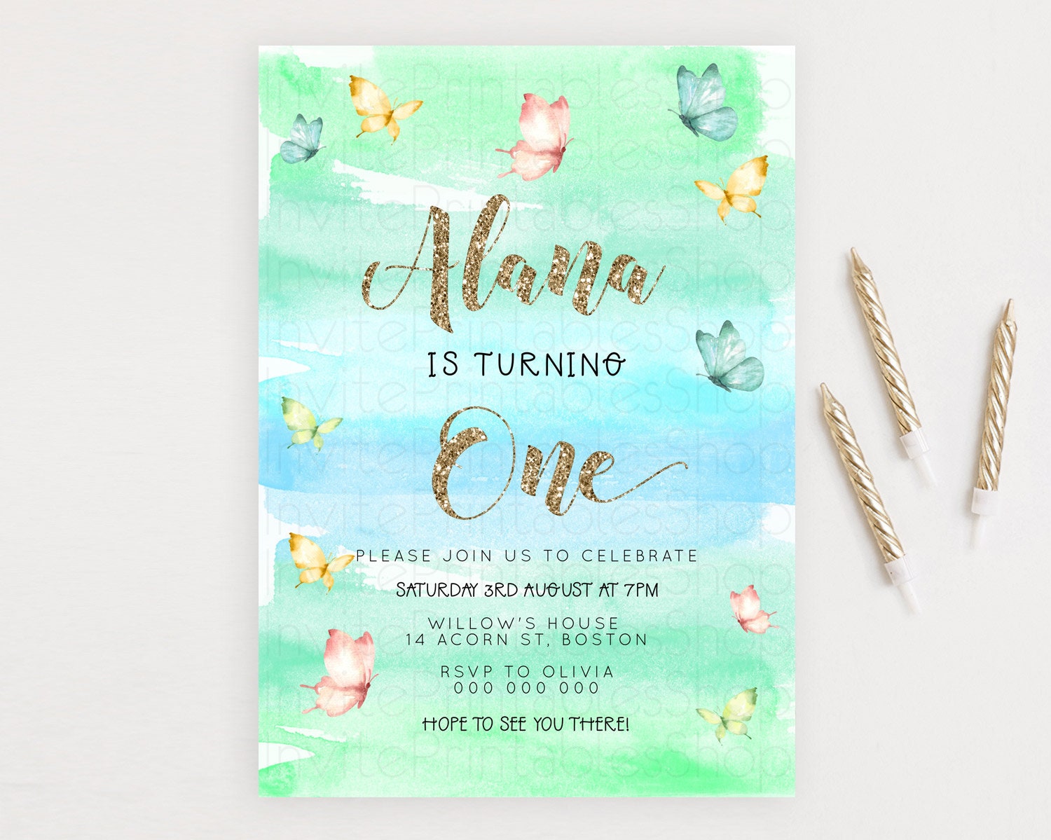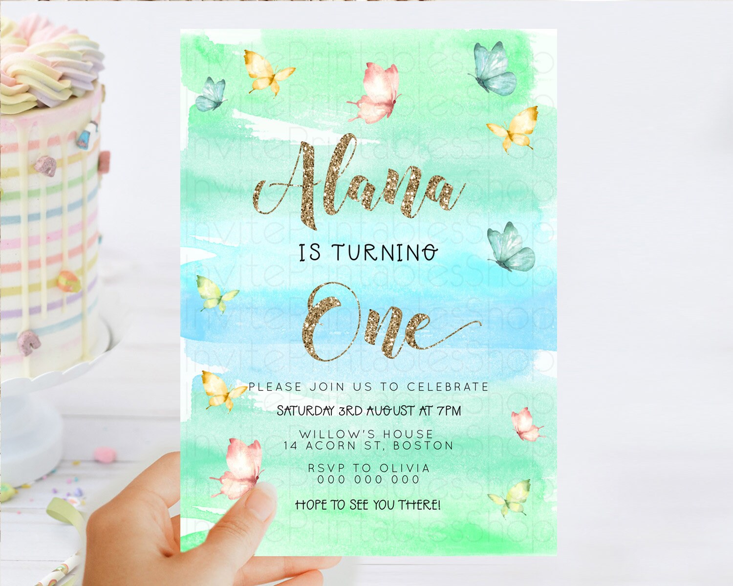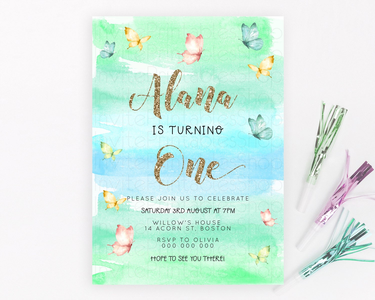 Pastel Butterfly Birthday Invitation Butterfly Birthday Invitation Colorful Splash Glitter Butterfly Garden 1st 2nd Birthday D23229