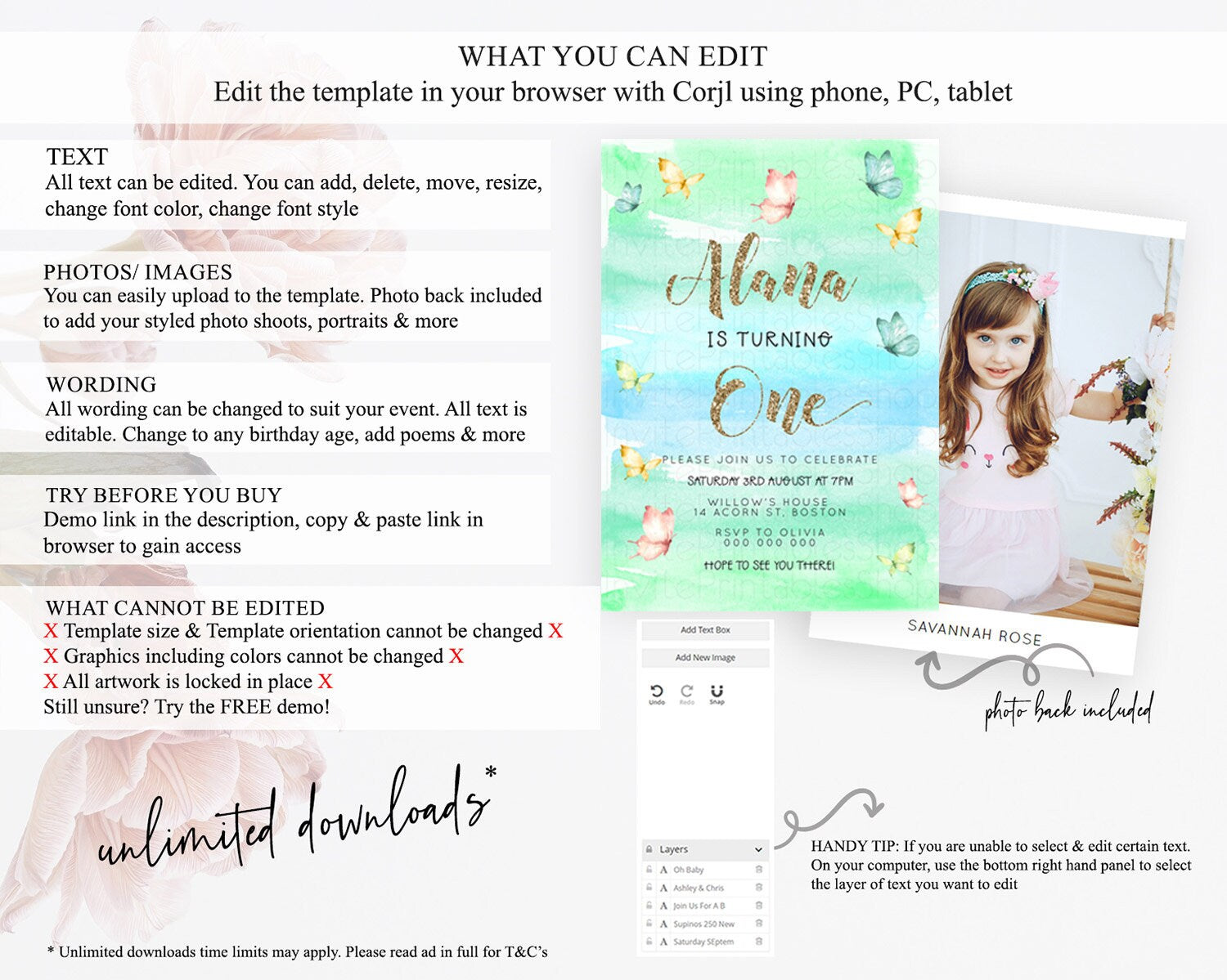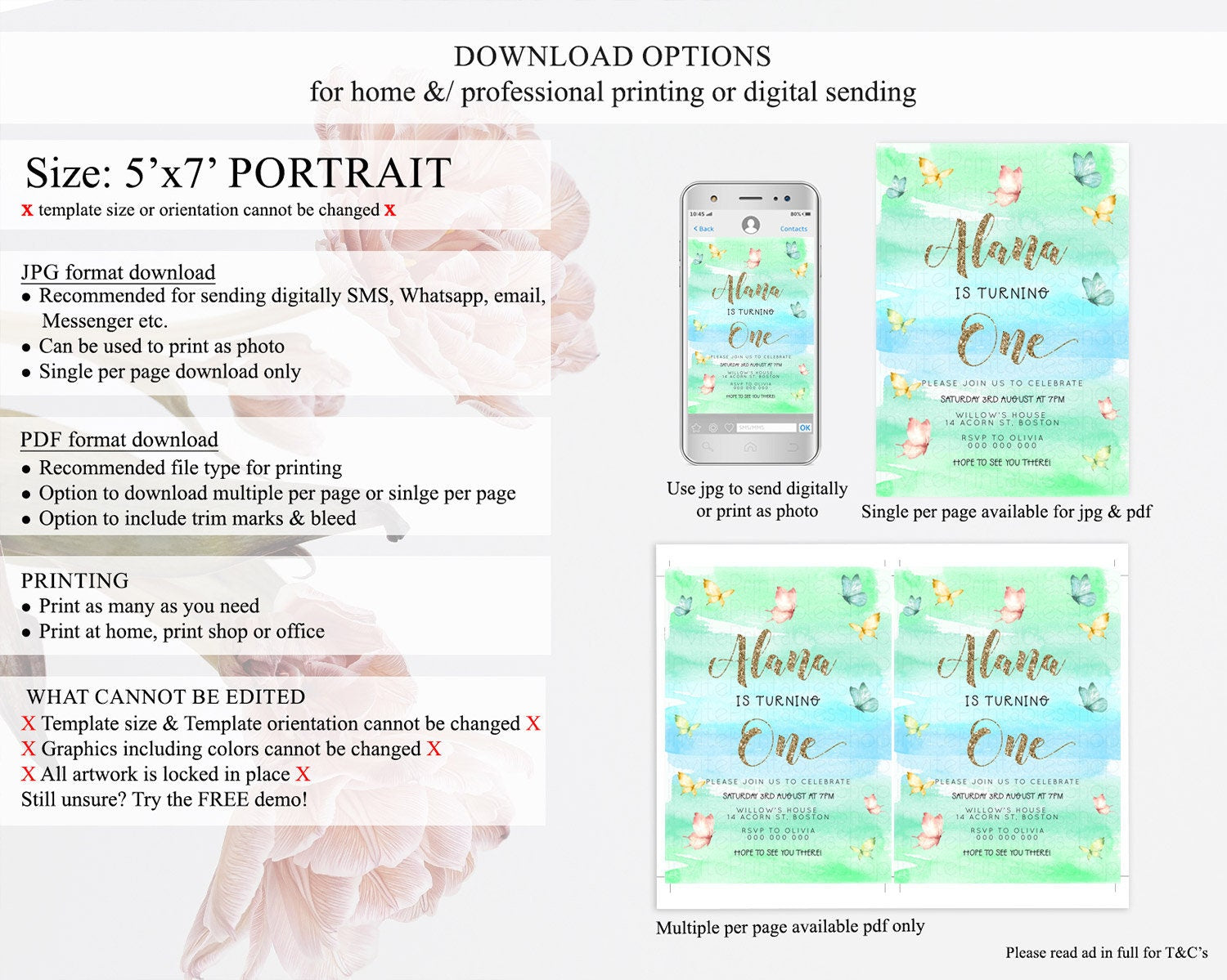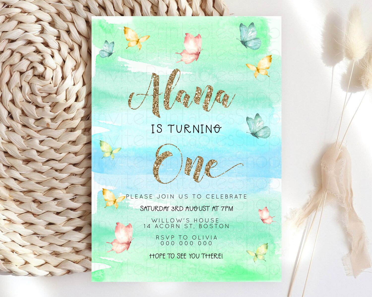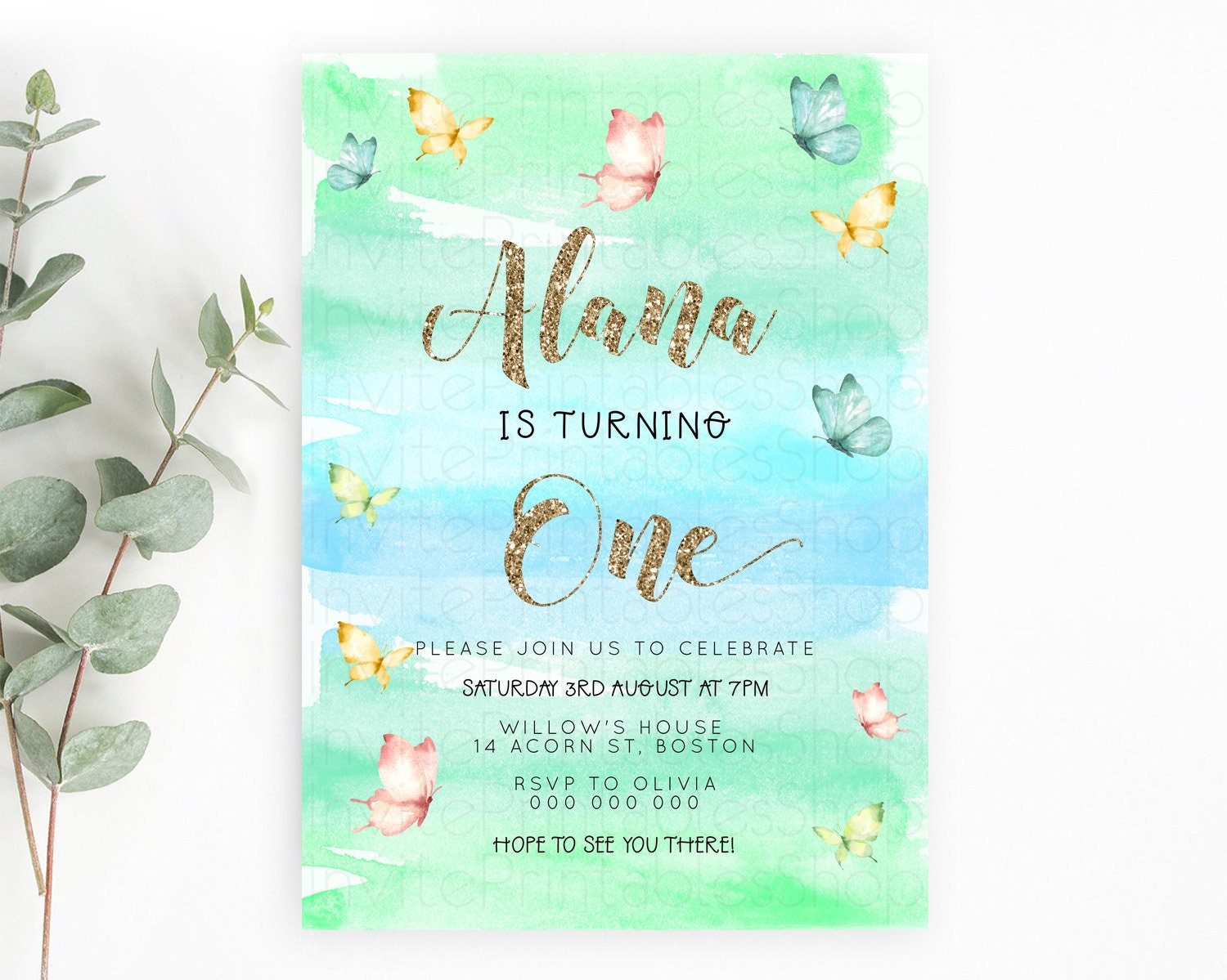 Pastel Butterfly Birthday Invitation Butterfly Birthday Invitation Colorful Splash Glitter Butterfly Garden 1st 2nd Birthday D23229