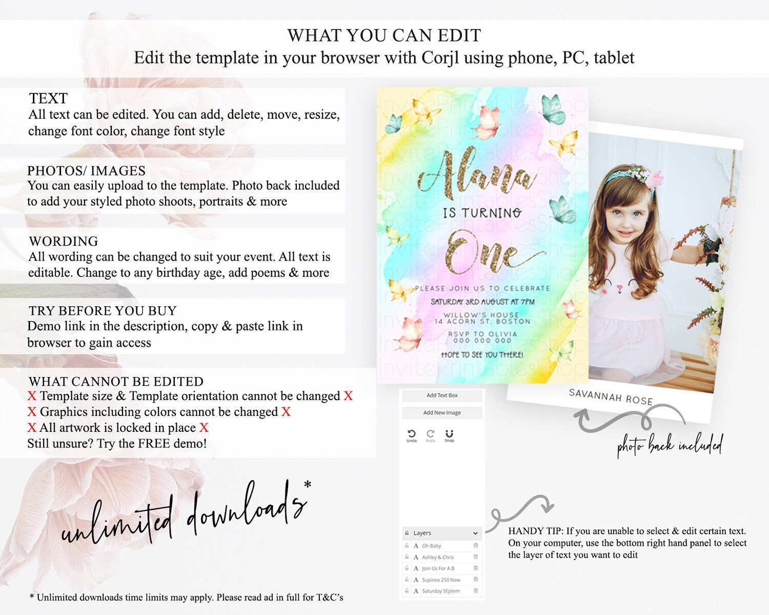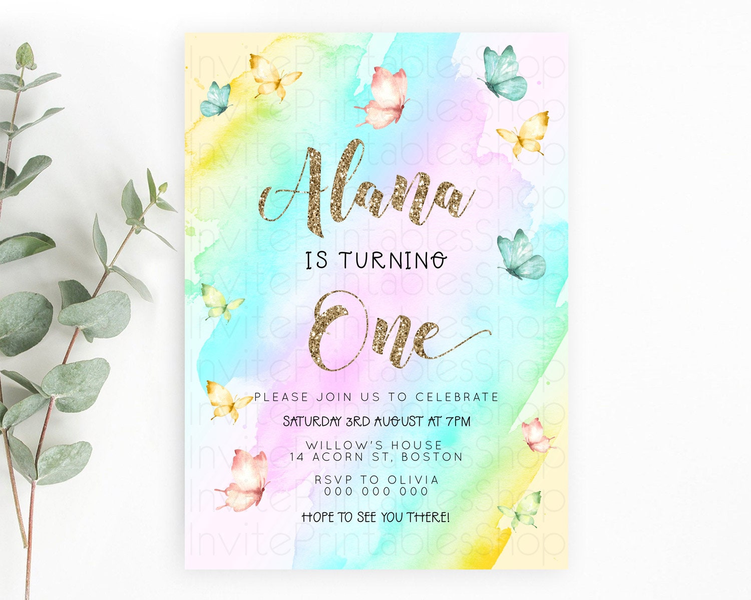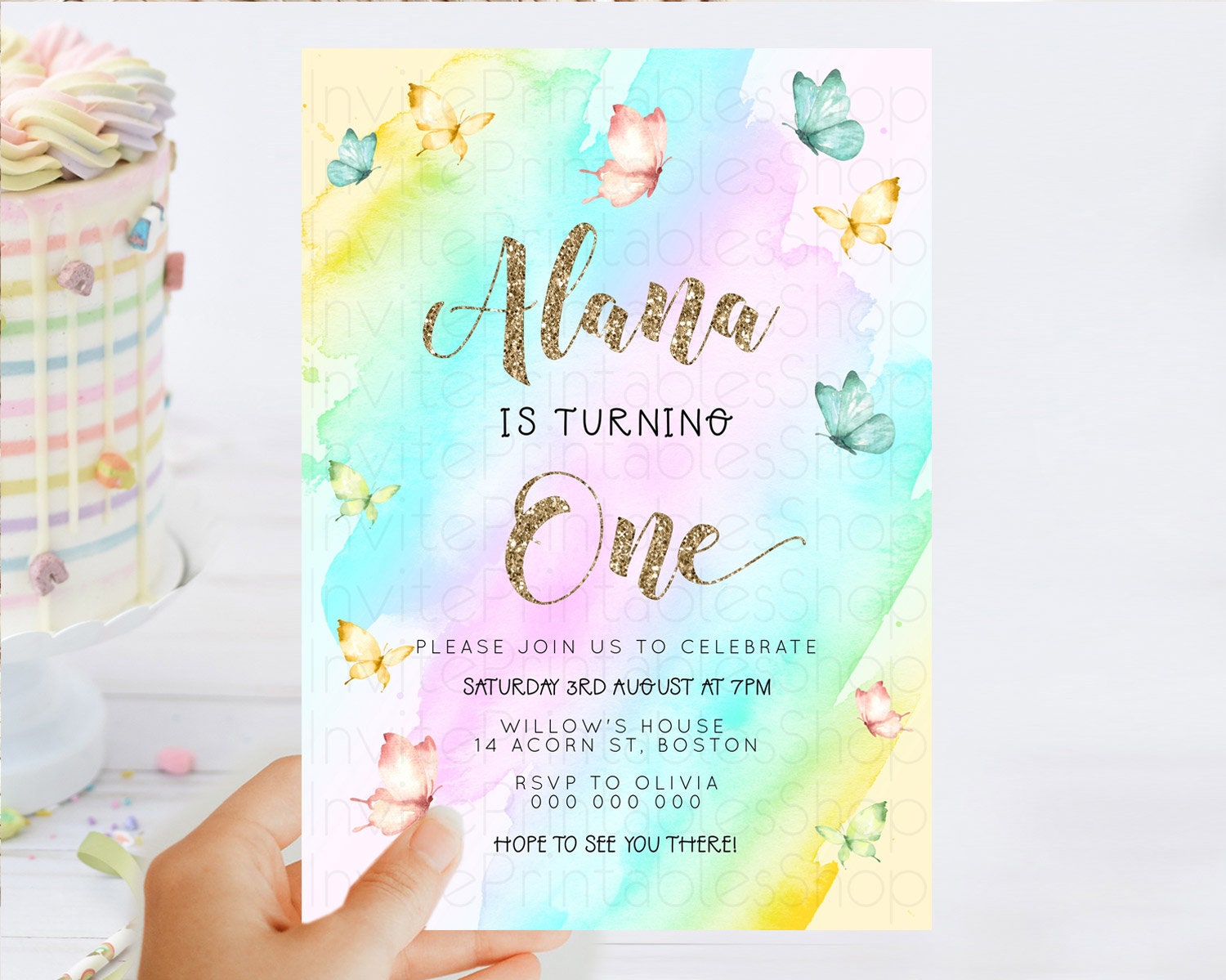 Pastel Butterfly Birthday Invitation Butterfly Birthday Invitation Colorful Splash Glitter Butterfly Garden 1st 2nd Birthday D23238