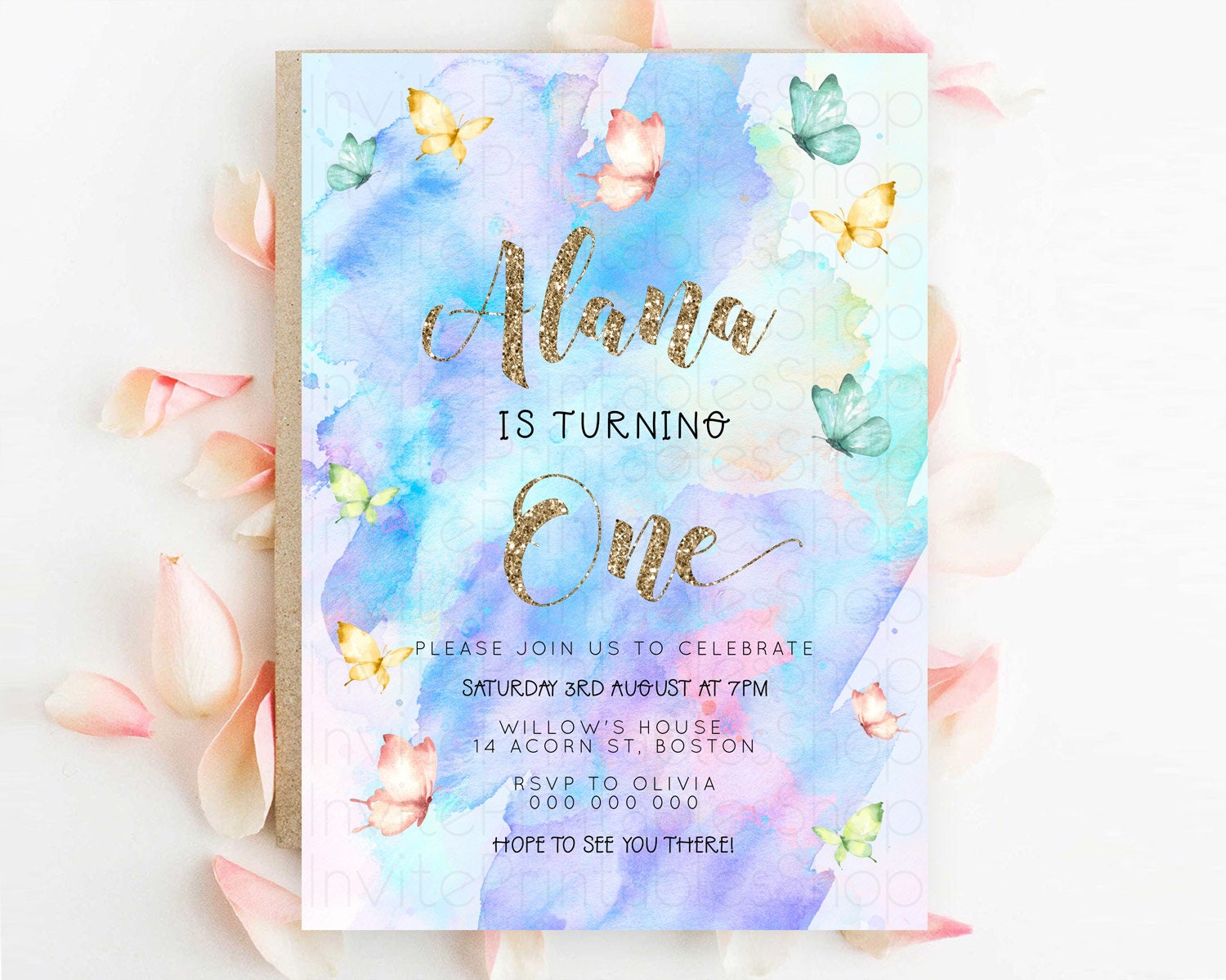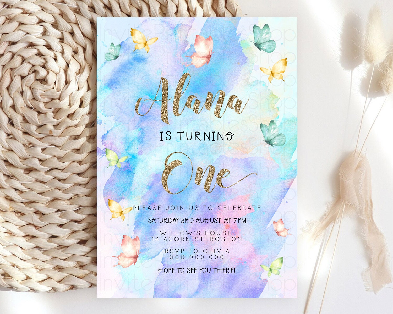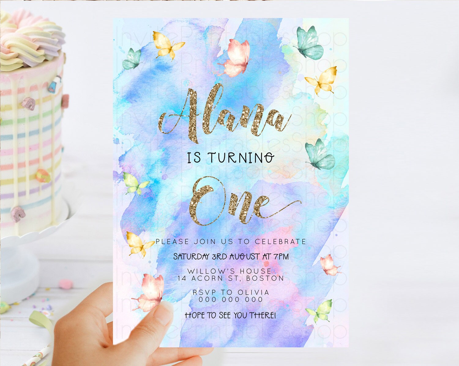Pastel Butterfly Birthday Invitation Butterfly Birthday Invitation Colorful Splash Glitter Butterfly Garden 1st 2nd Birthday D23245
