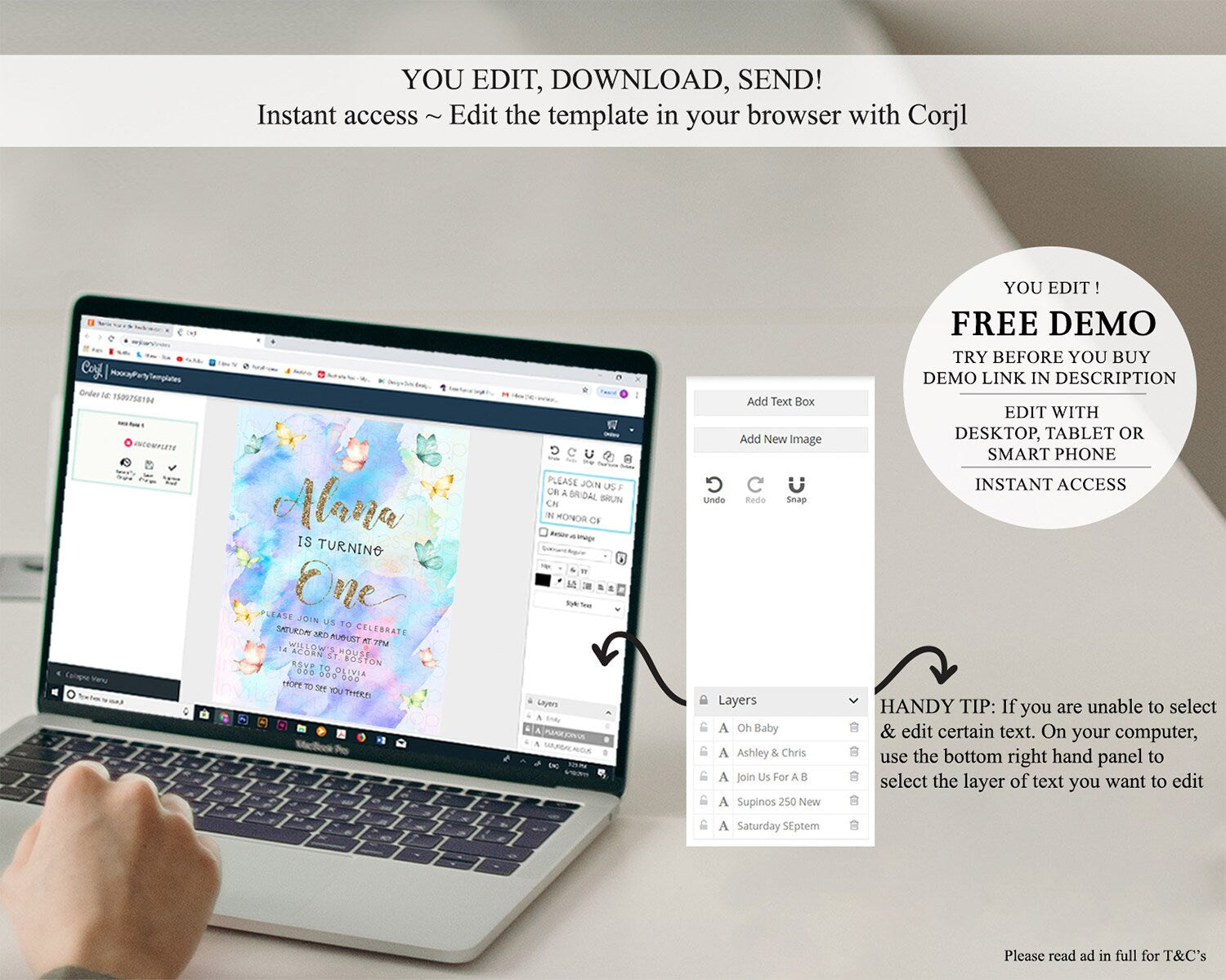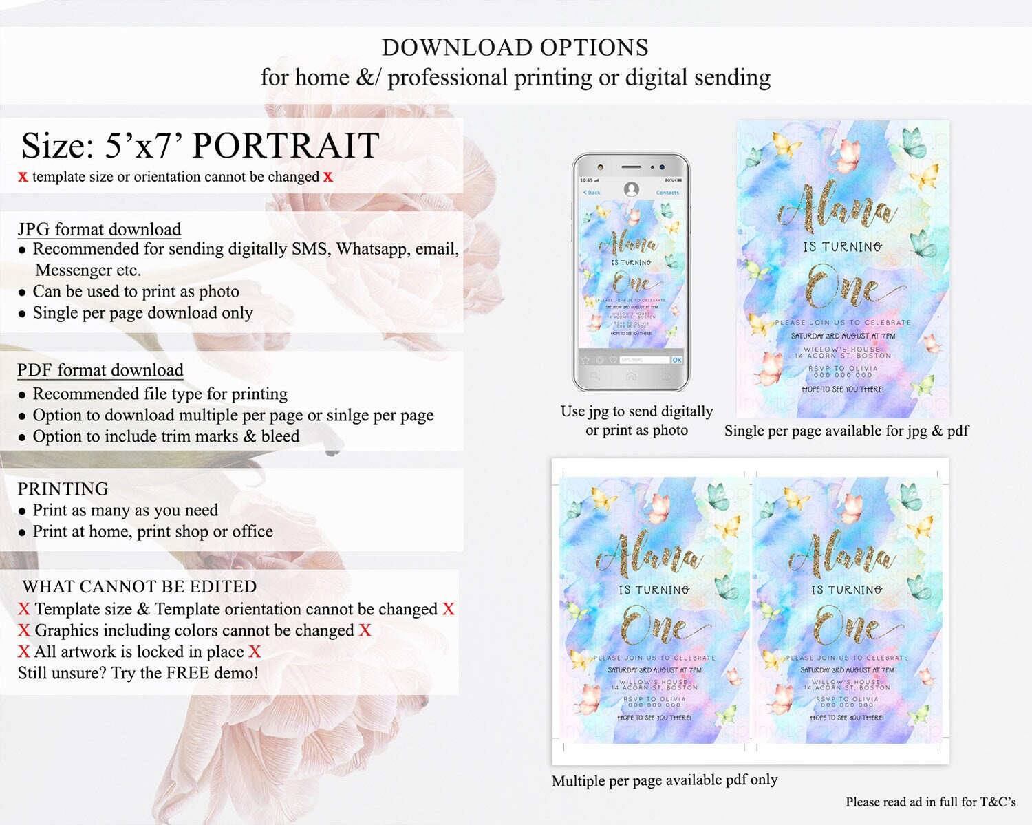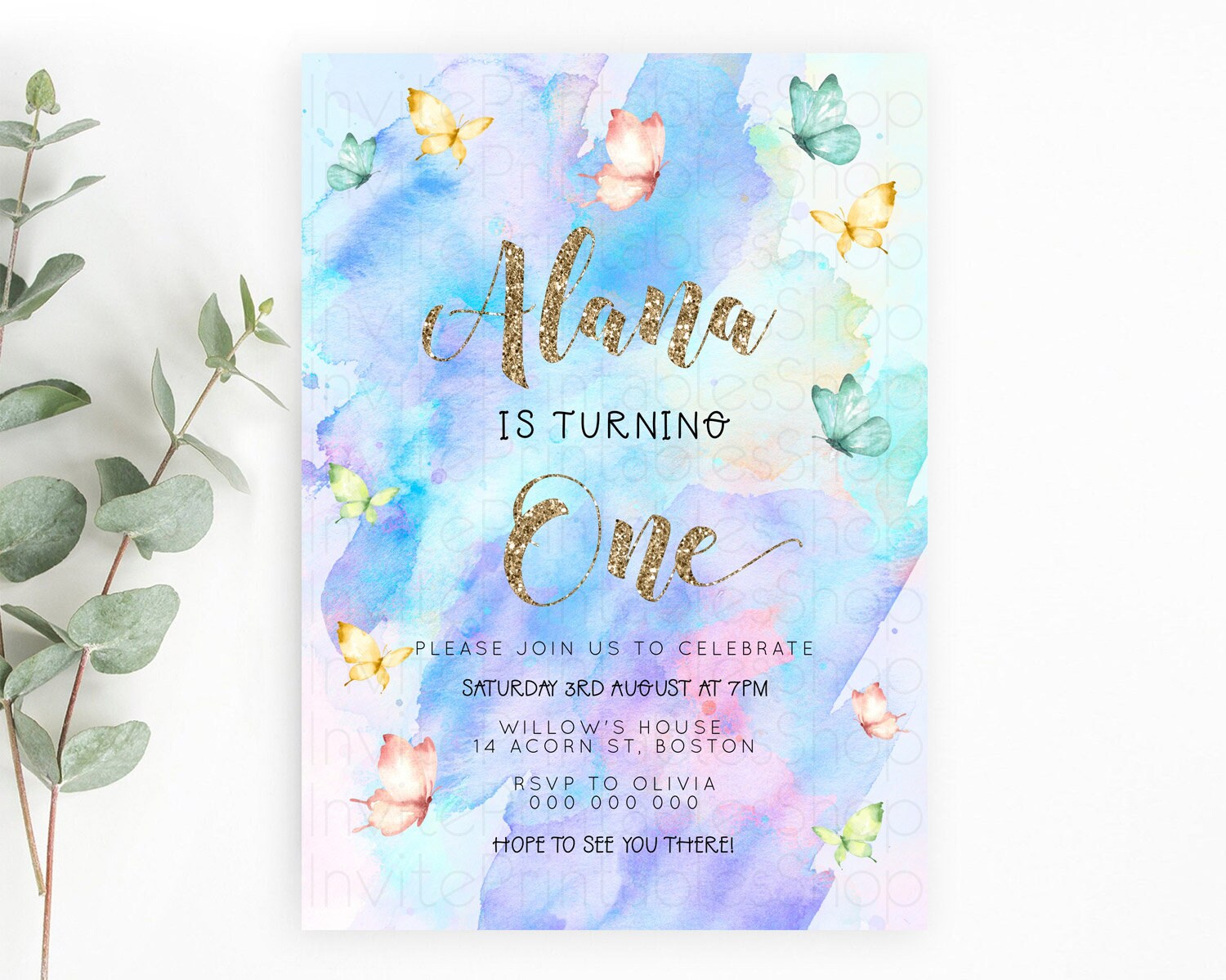 Pastel Butterfly Birthday Invitation Butterfly Birthday Invitation Colorful Splash Glitter Butterfly Garden 1st 2nd Birthday D23245