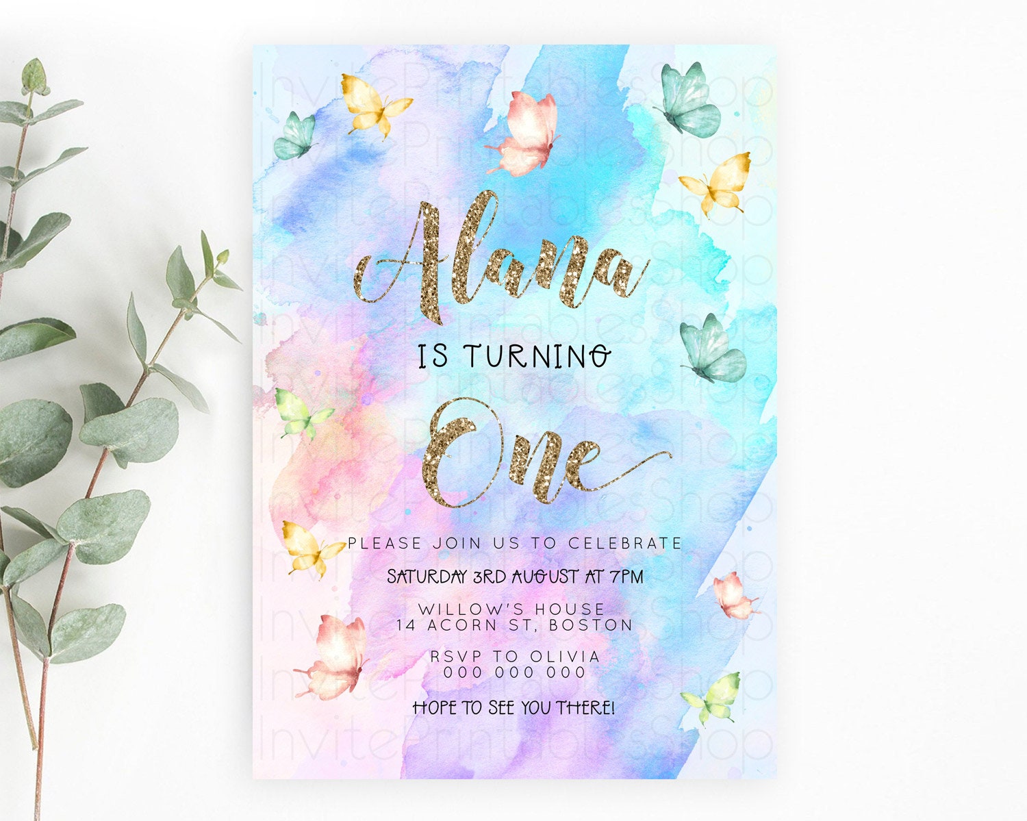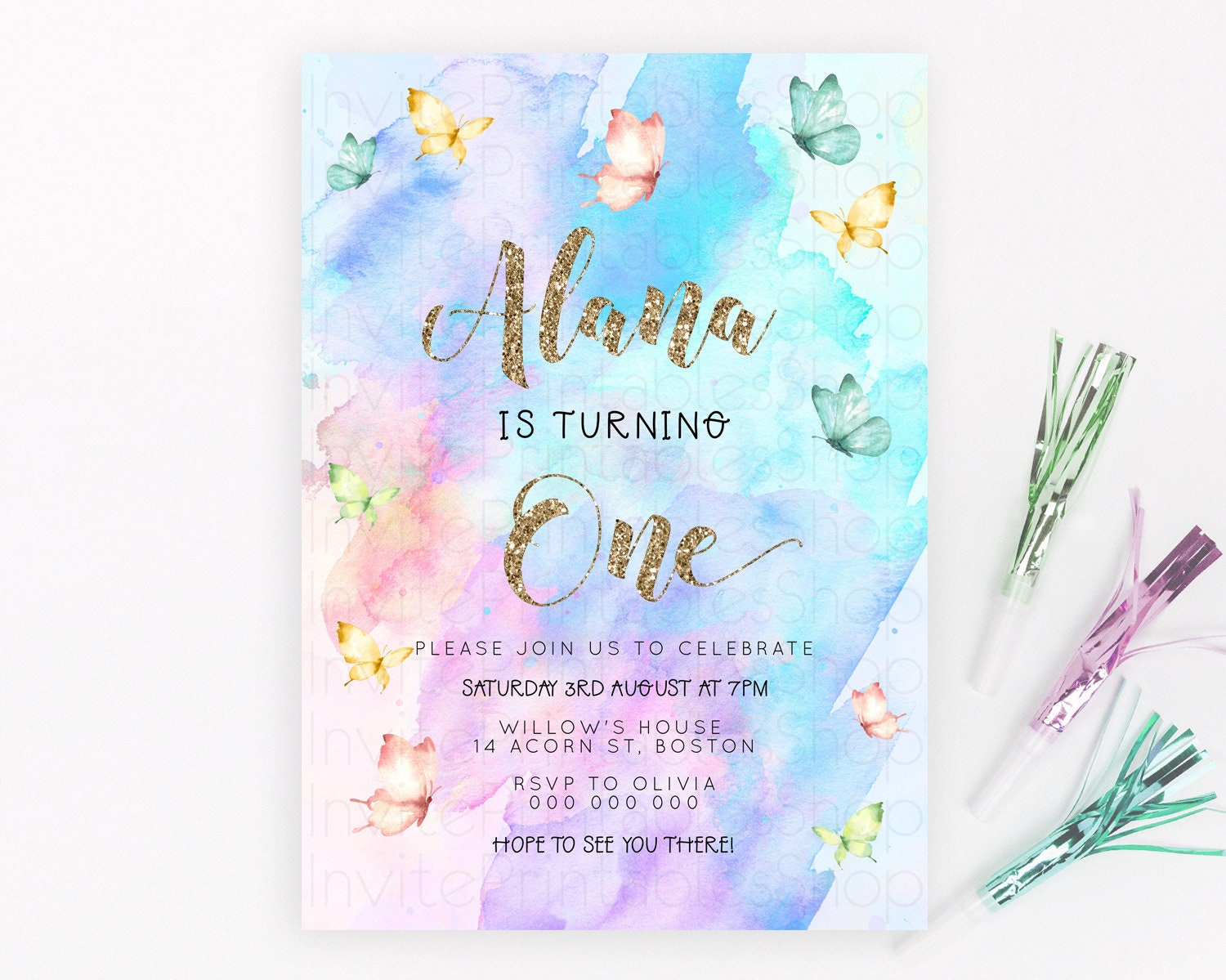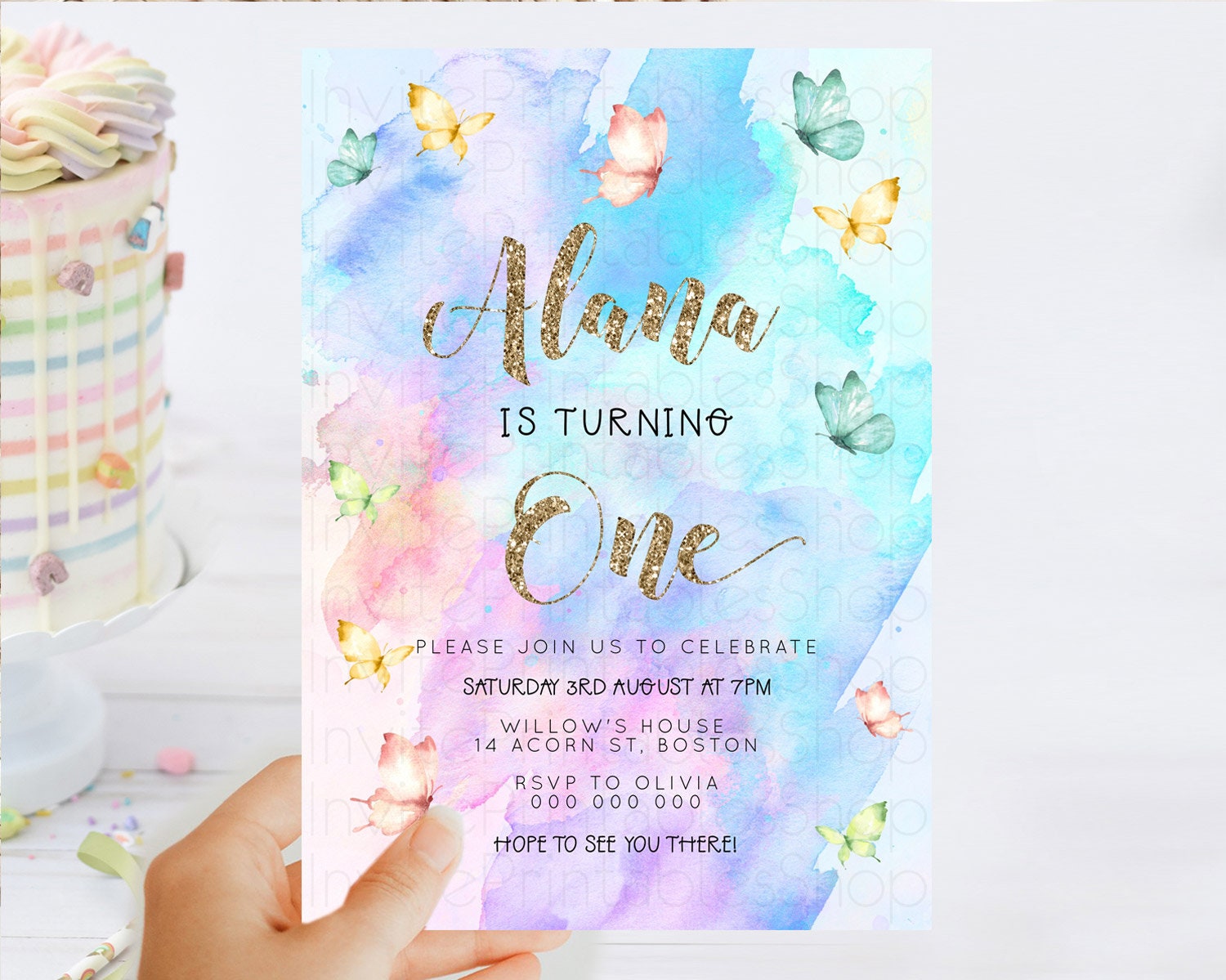 Pastel Butterfly Birthday Invitation Butterfly Birthday Invitation Colorful Splash Glitter Butterfly Garden 1st 2nd Birthday D23246