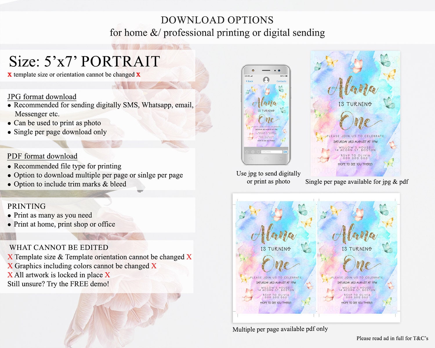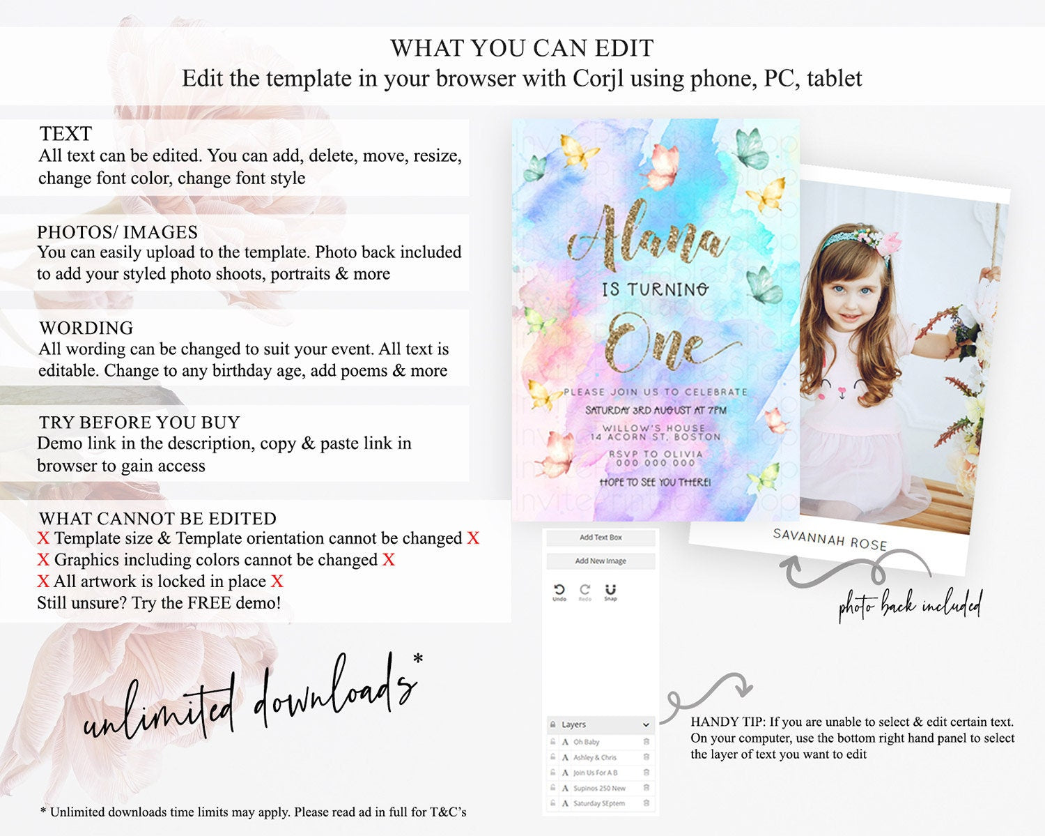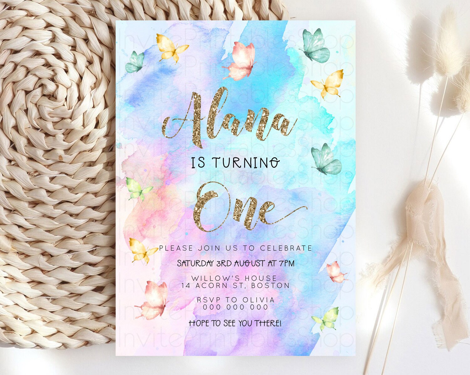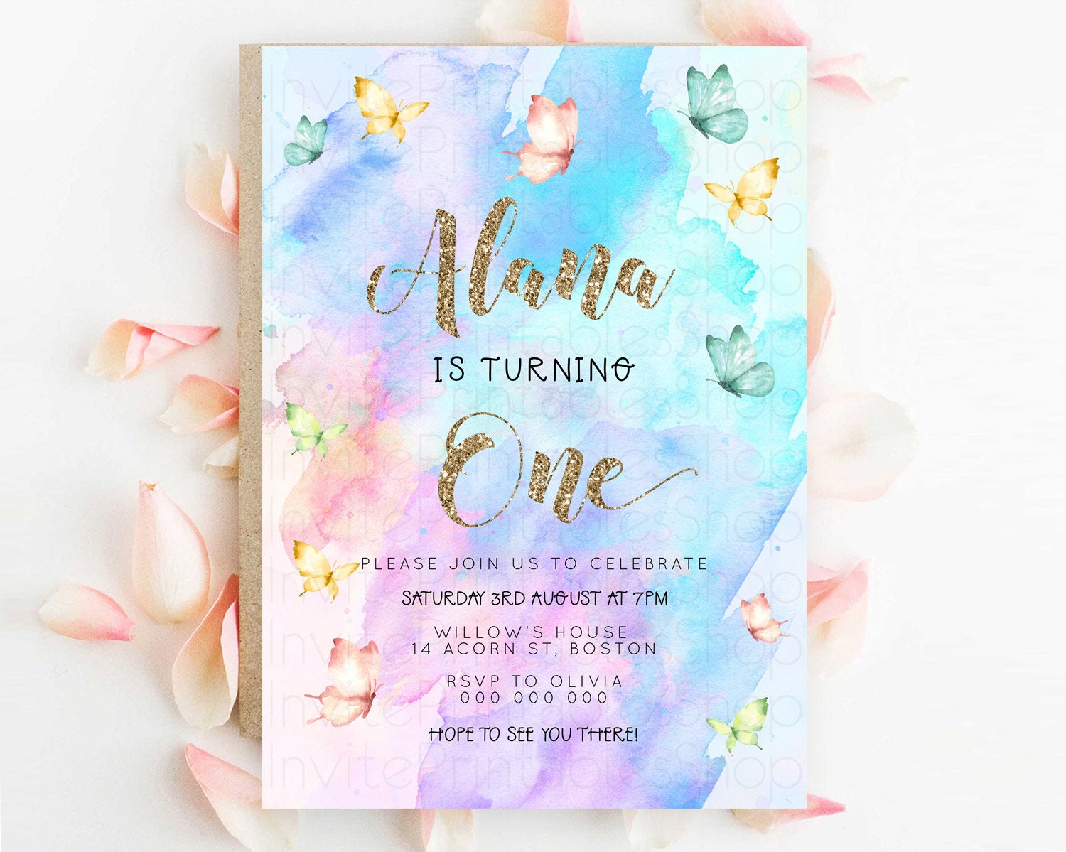 Pastel Butterfly Birthday Invitation Butterfly Birthday Invitation Colorful Splash Glitter Butterfly Garden 1st 2nd Birthday D23246