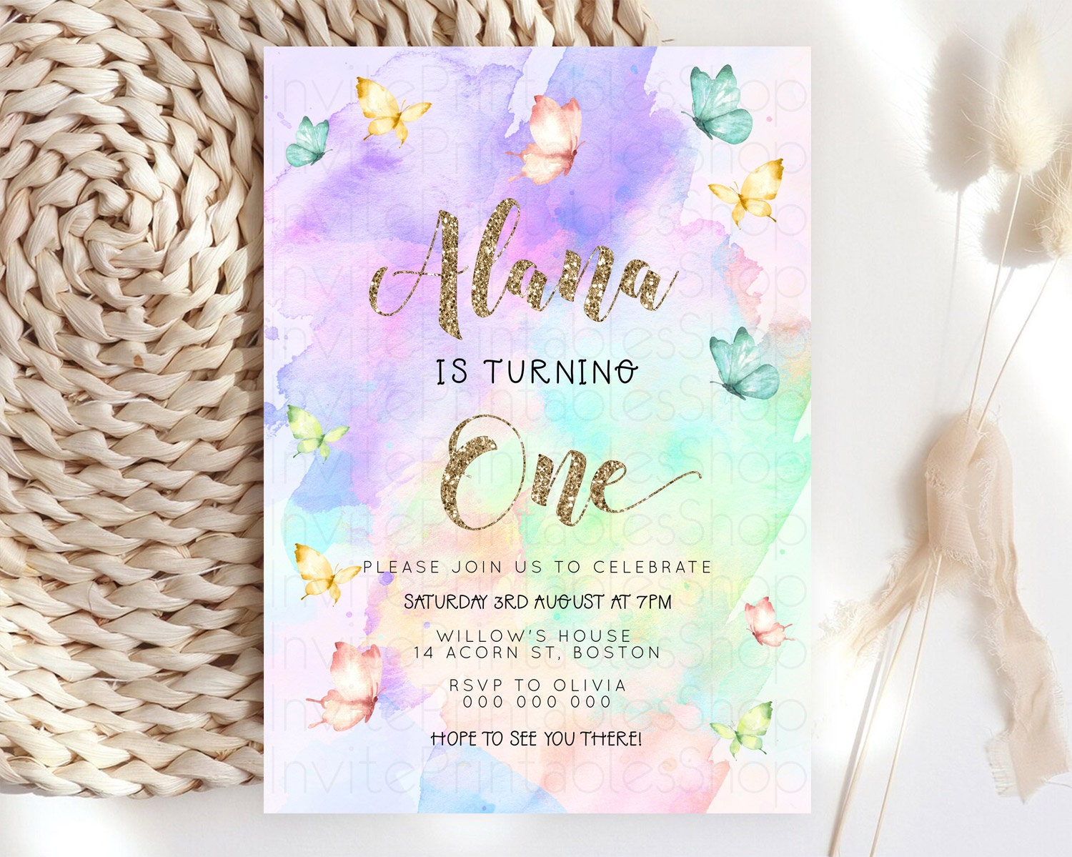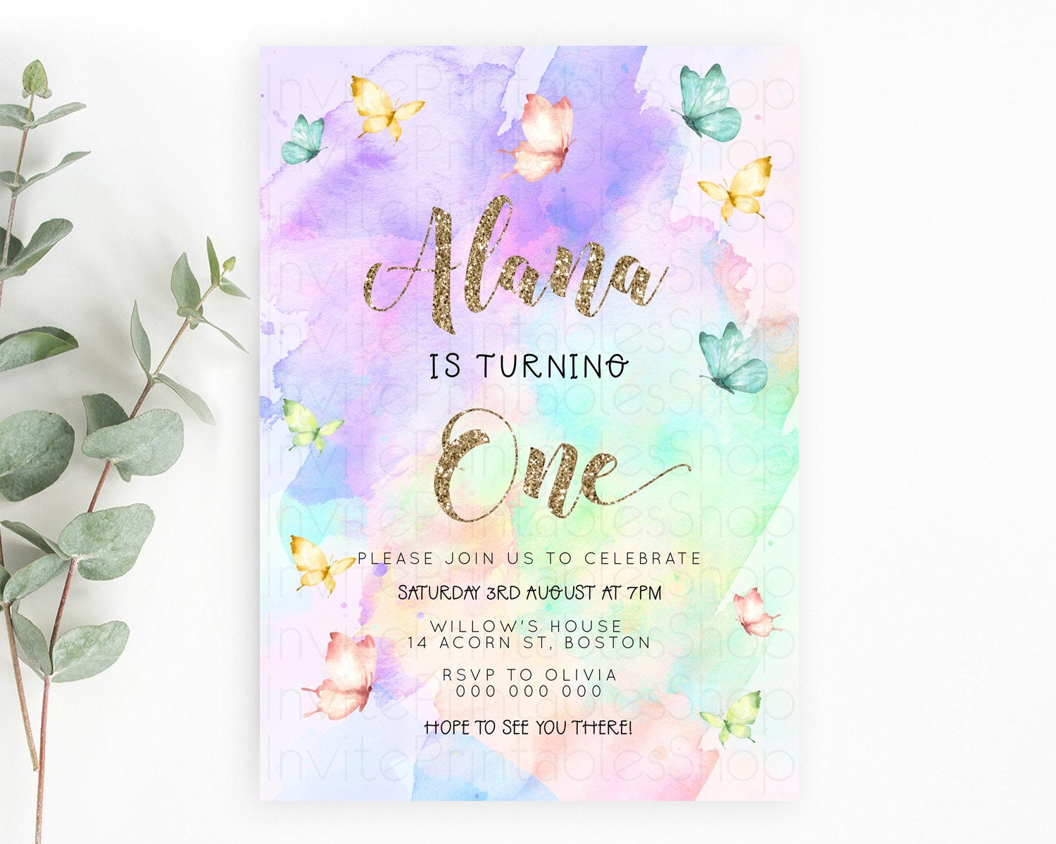 Pastel Butterfly Birthday Invitation Butterfly Birthday Invitation Colorful Splash Glitter Butterfly Garden 1st 2nd Birthday D23250