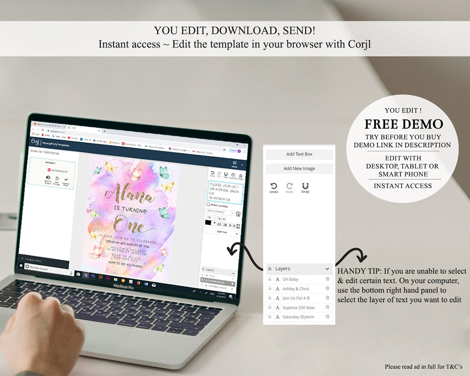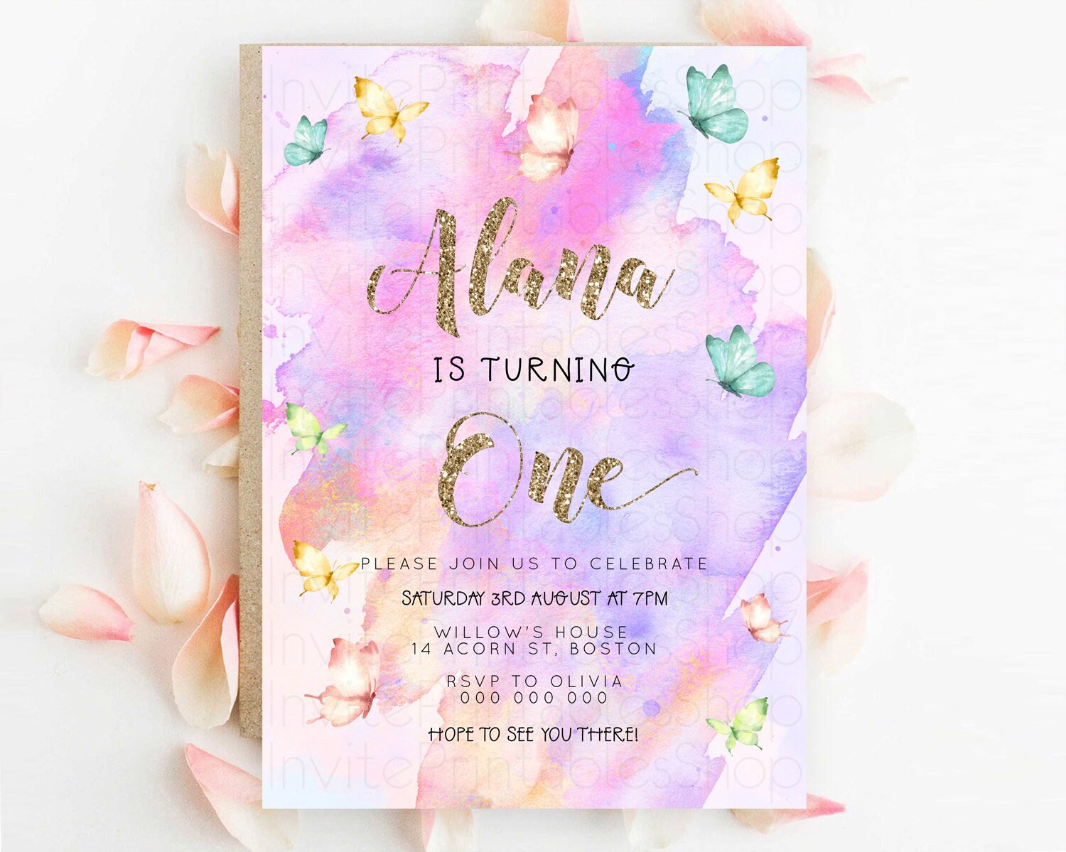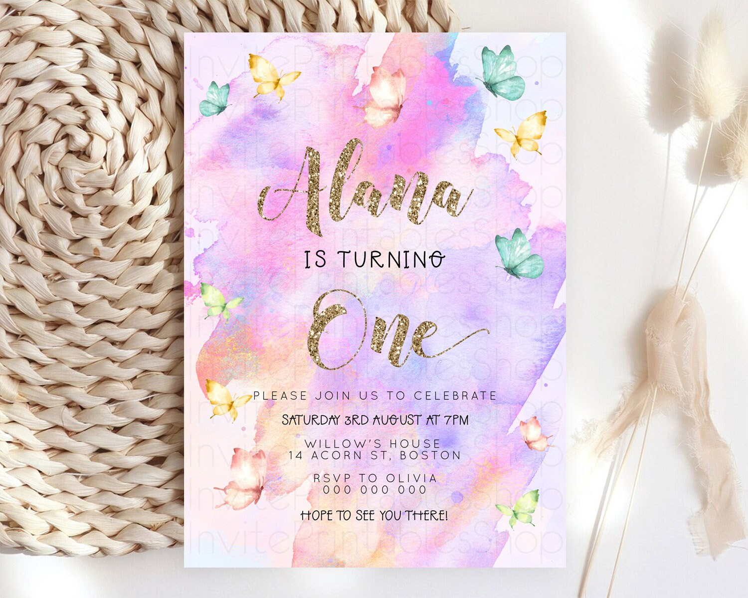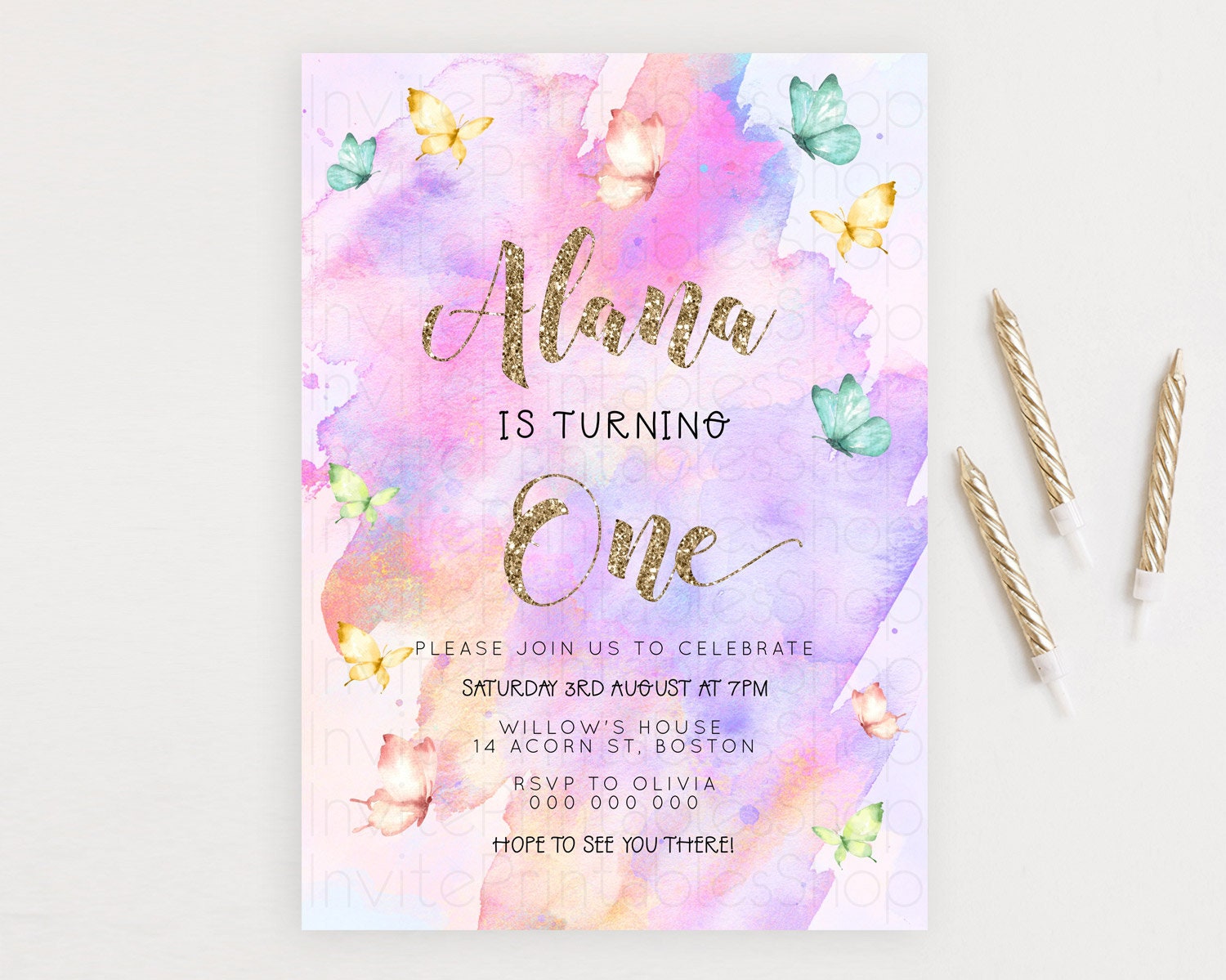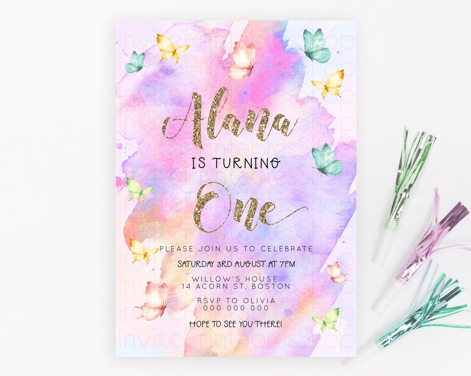 Pastel Butterfly Birthday Invitation Butterfly Birthday Invitation Colorful Splash Glitter Butterfly Garden 1st 2nd Birthday D23251