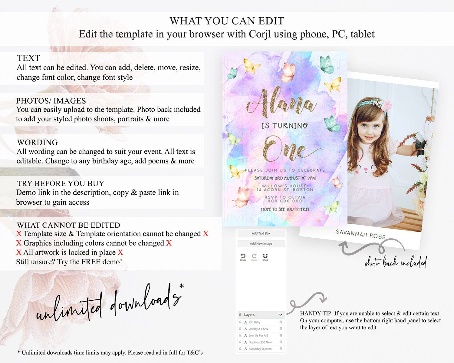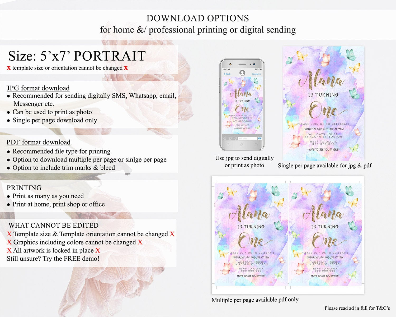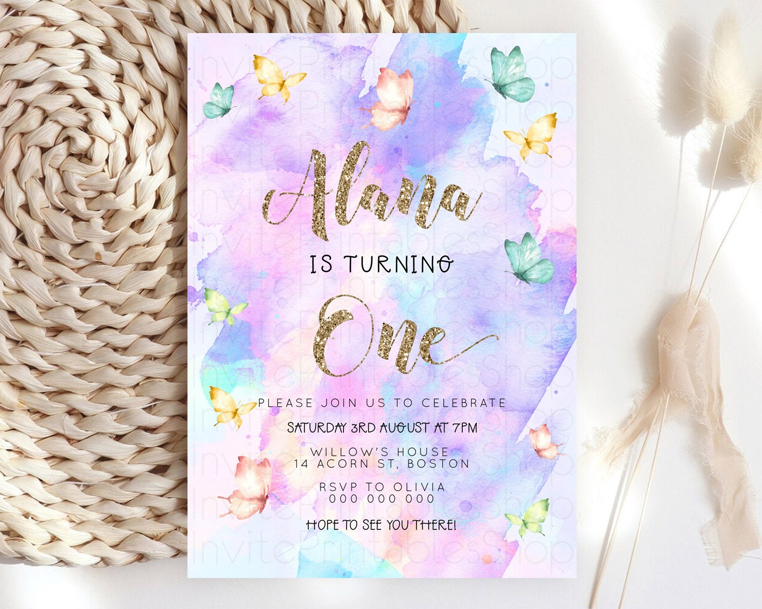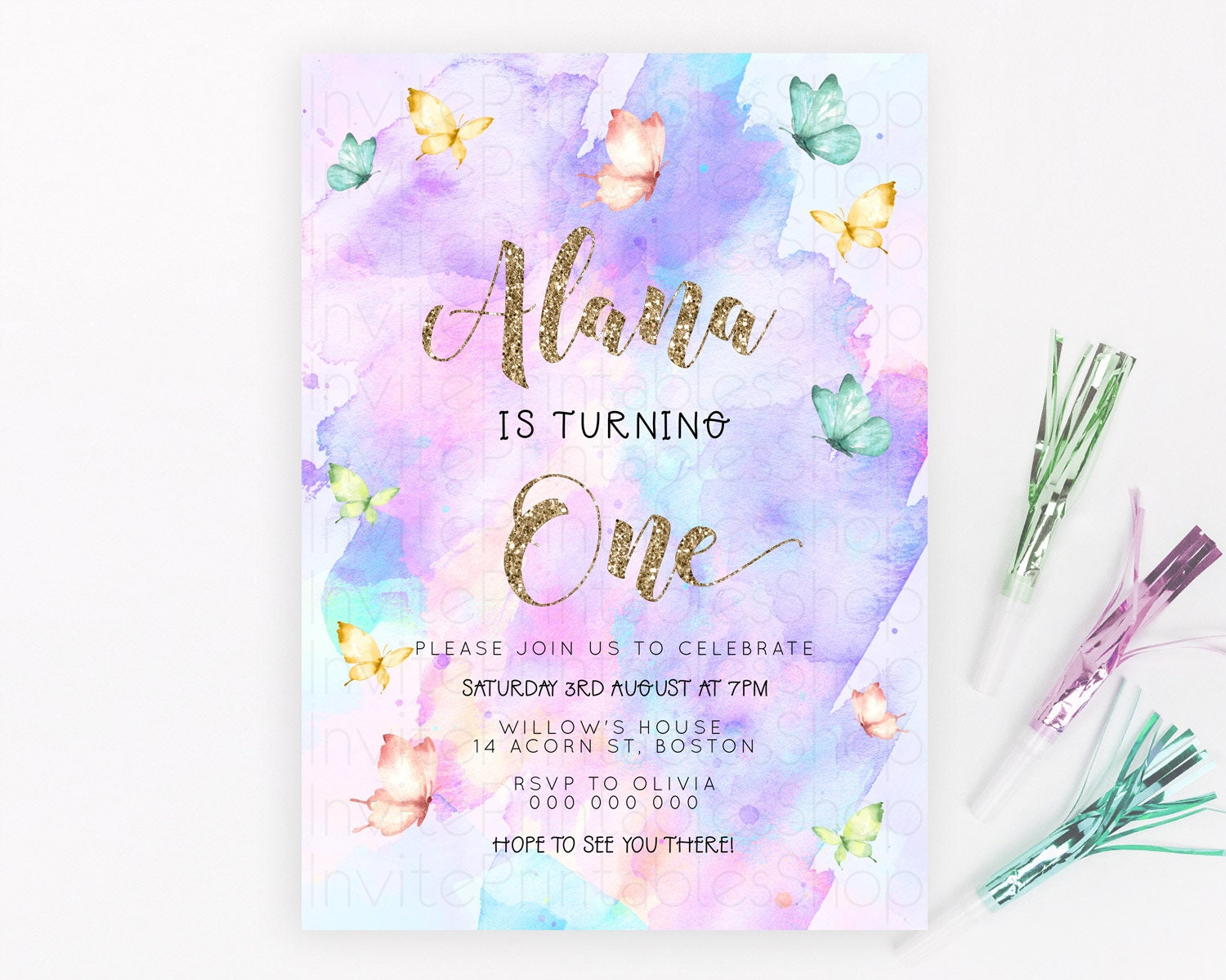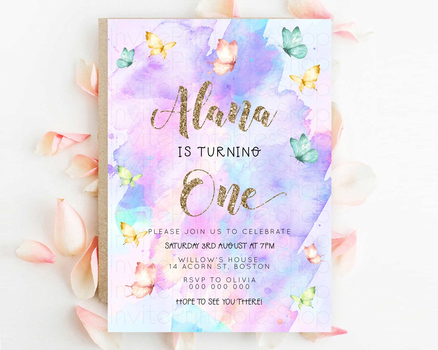 Pastel Butterfly Birthday Invitation Butterfly Birthday Invitation Colorful Splash Glitter Butterfly Garden 1st 2nd Birthday D23252