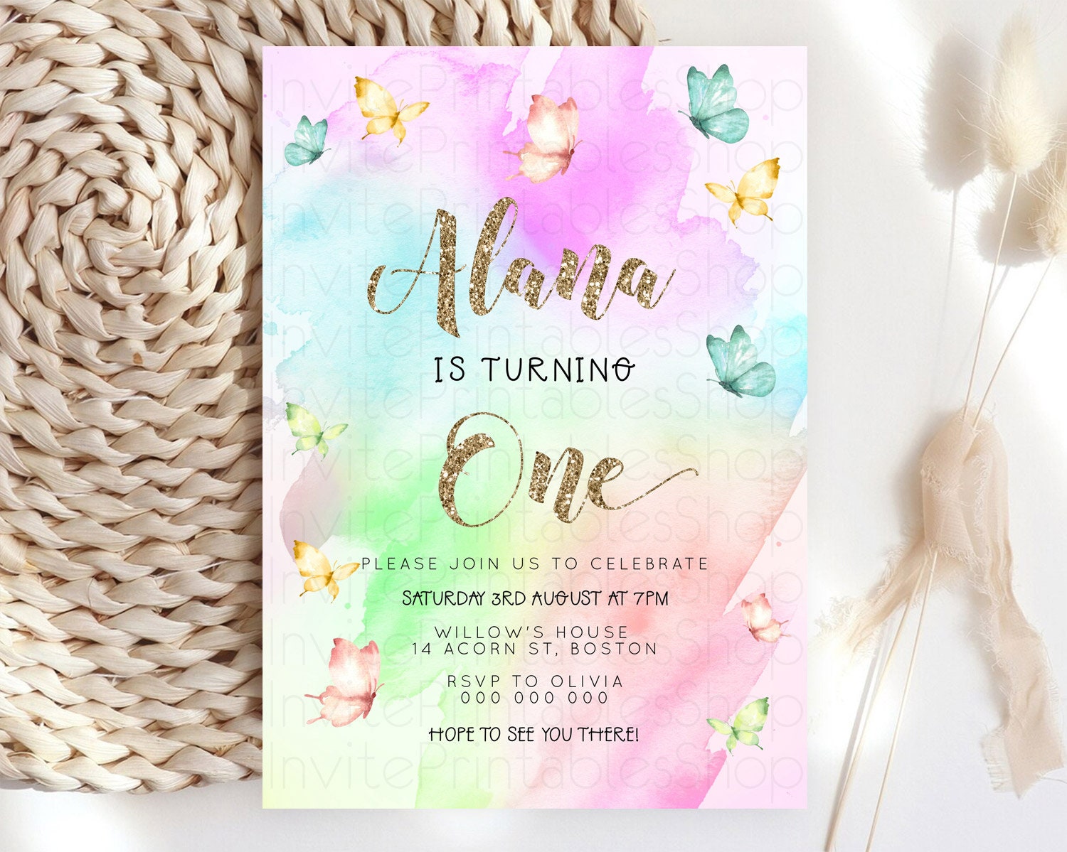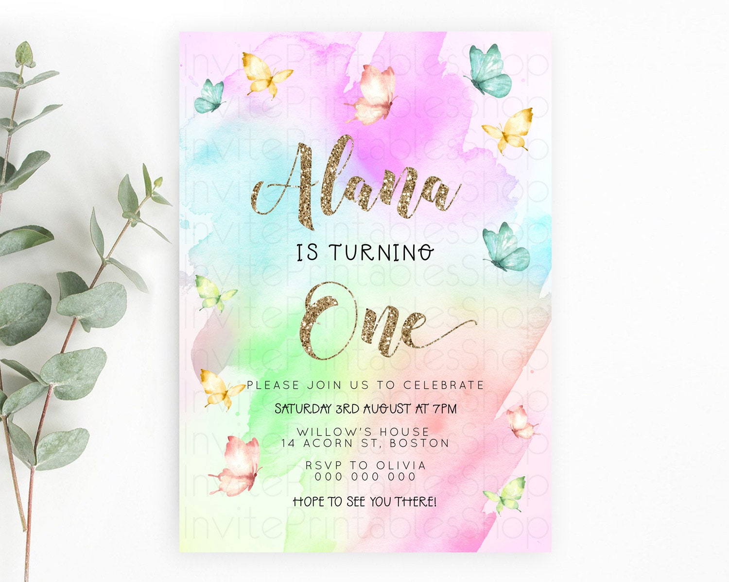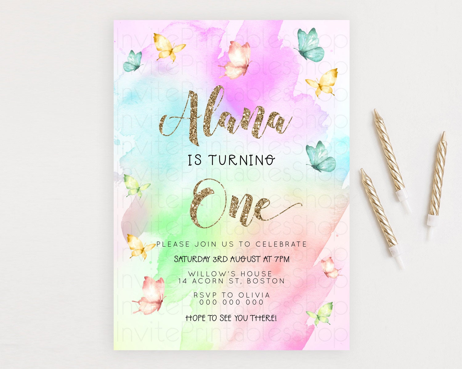 Pastel Butterfly Birthday Invitation Butterfly Birthday Invitation Colorful Splash Glitter Butterfly Garden 1st 2nd Birthday D23256