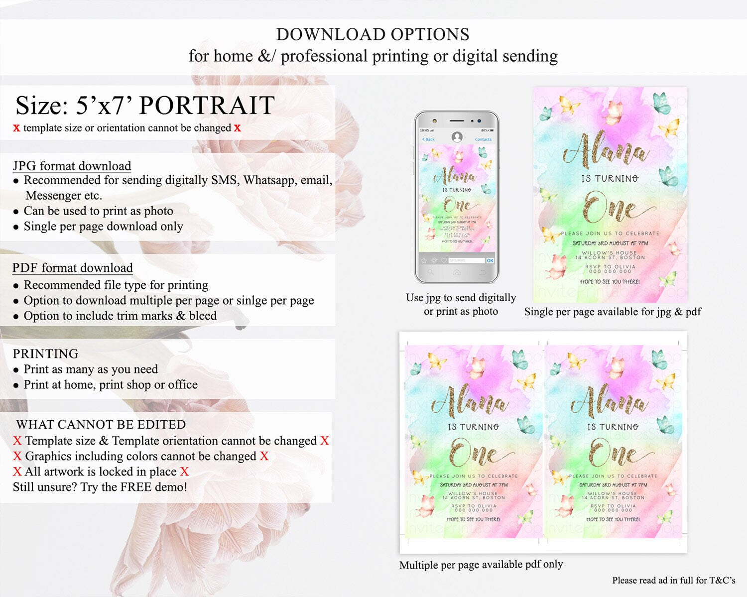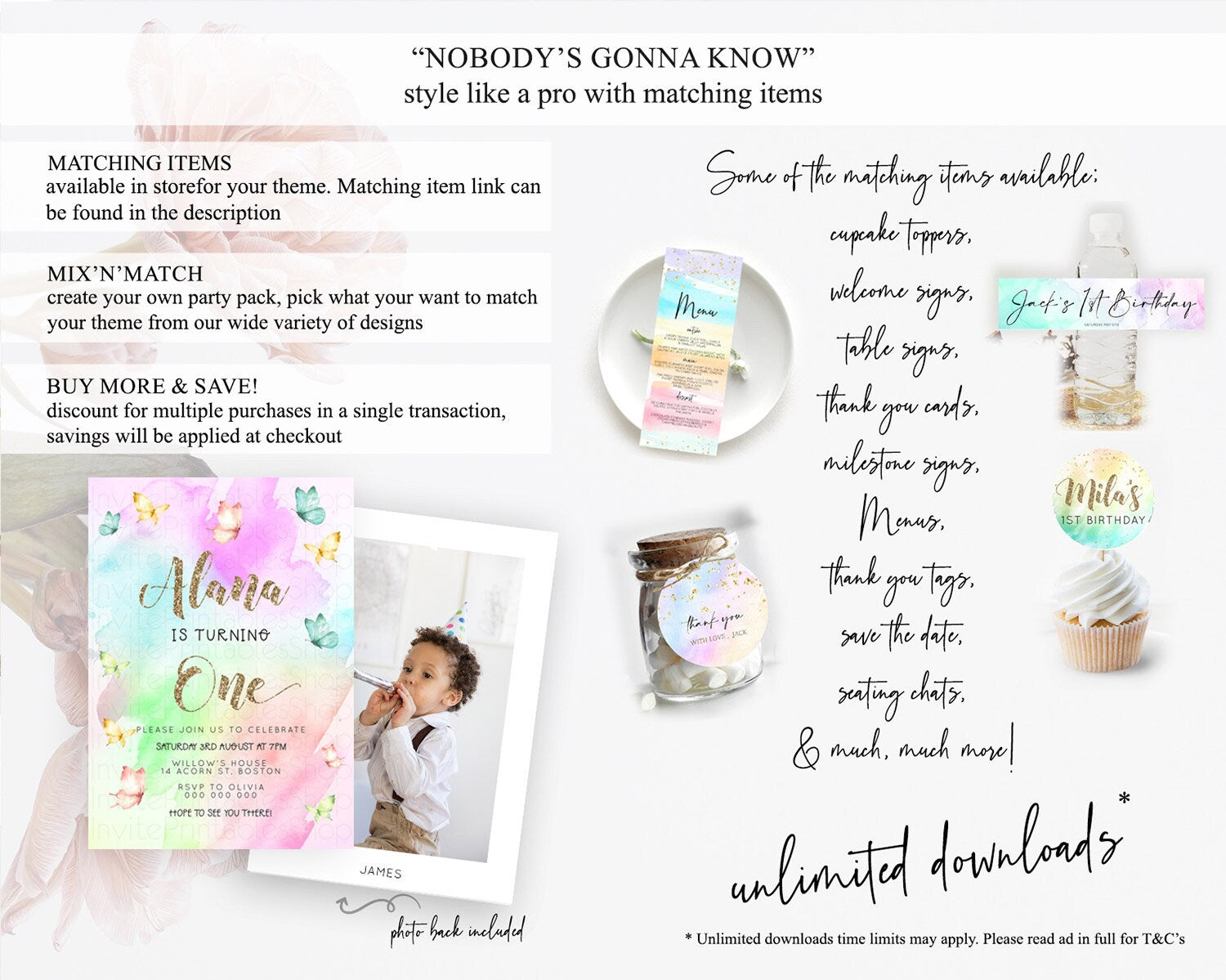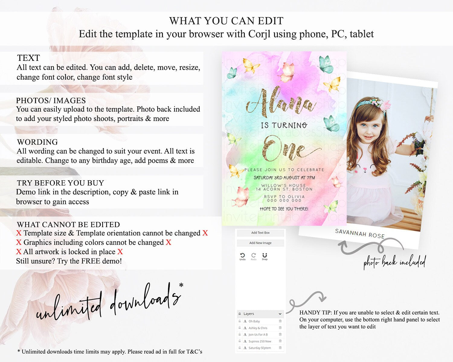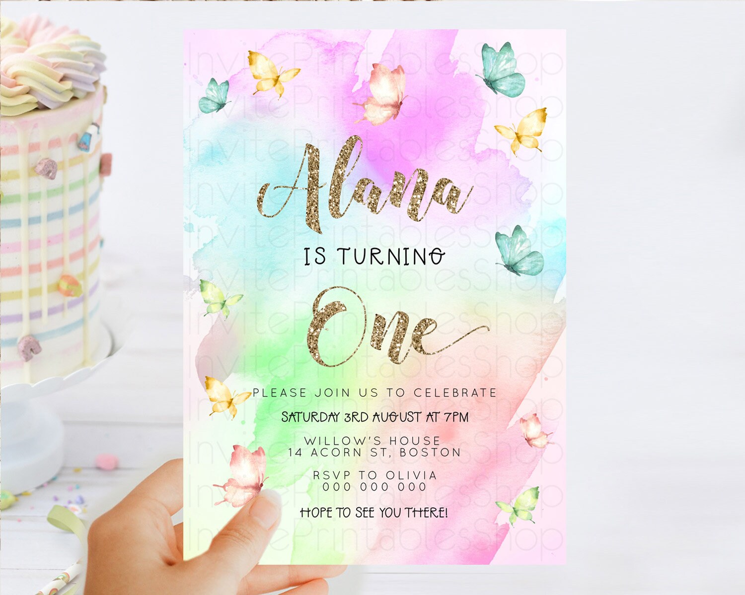 Pastel Butterfly Birthday Invitation Butterfly Birthday Invitation Colorful Splash Glitter Butterfly Garden 1st 2nd Birthday D23256