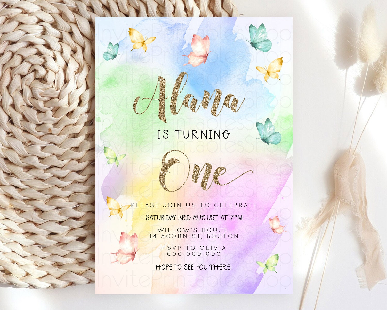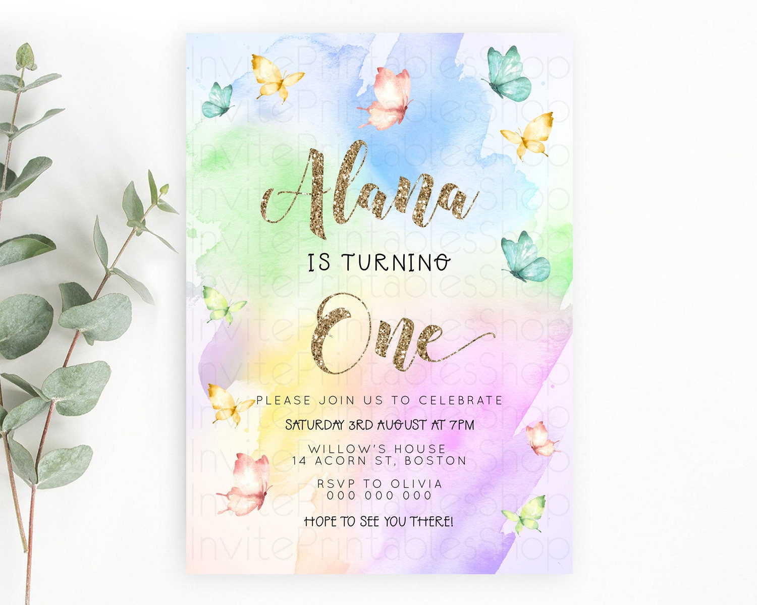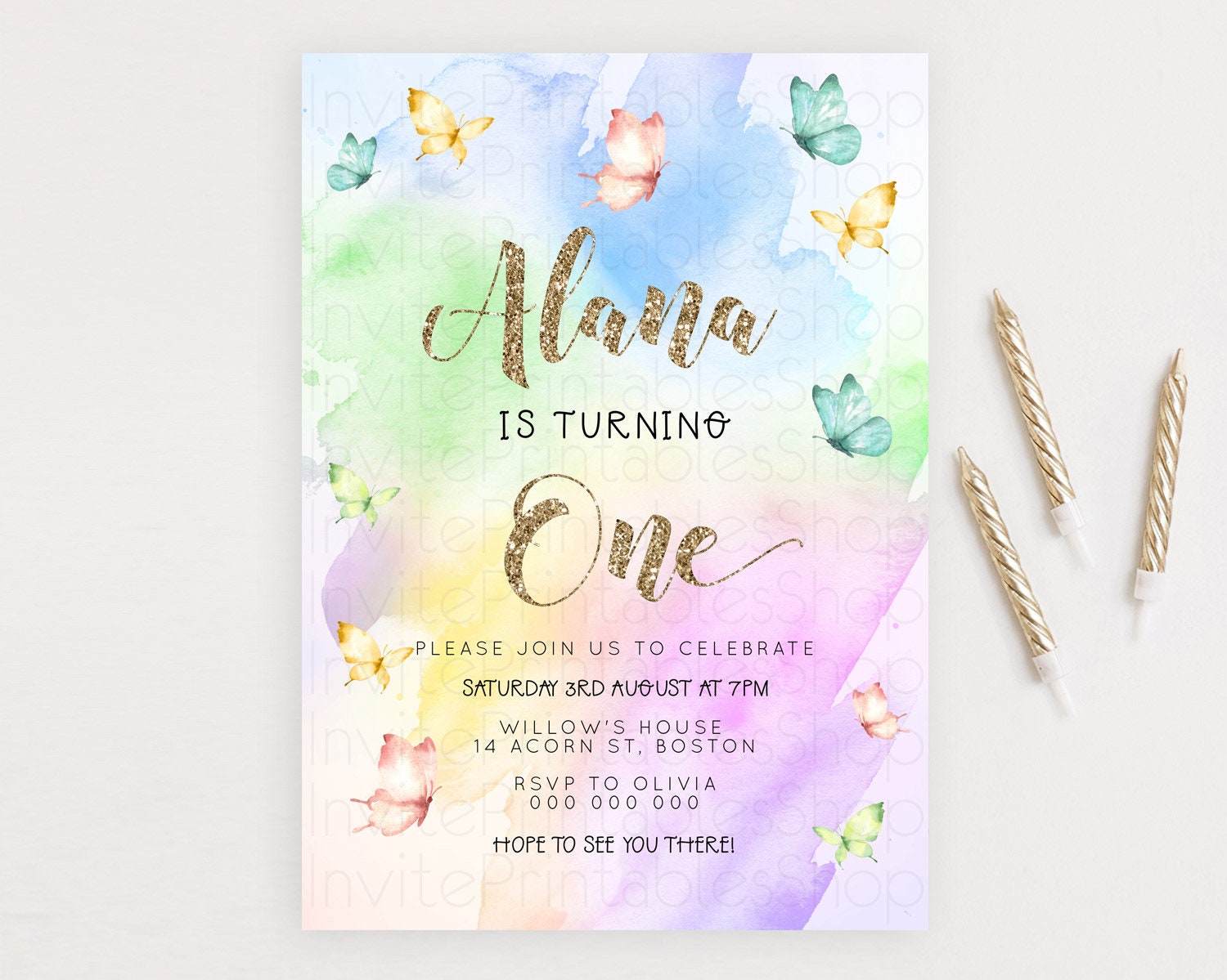 Pastel Butterfly Birthday Invitation Butterfly Birthday Invitation Colorful Splash Glitter Butterfly Garden 1st 2nd Birthday D23257