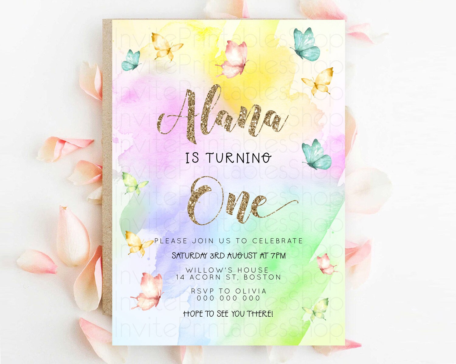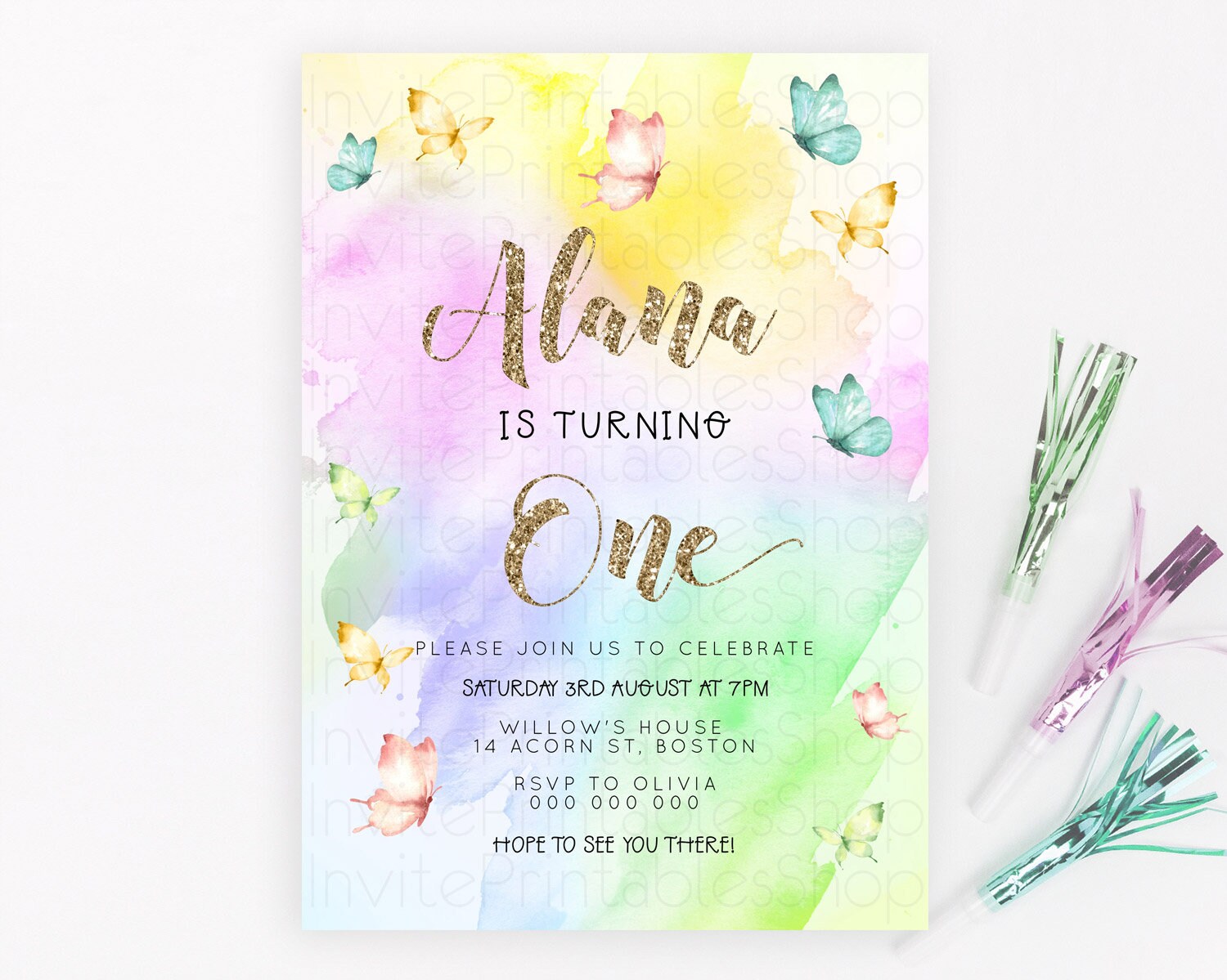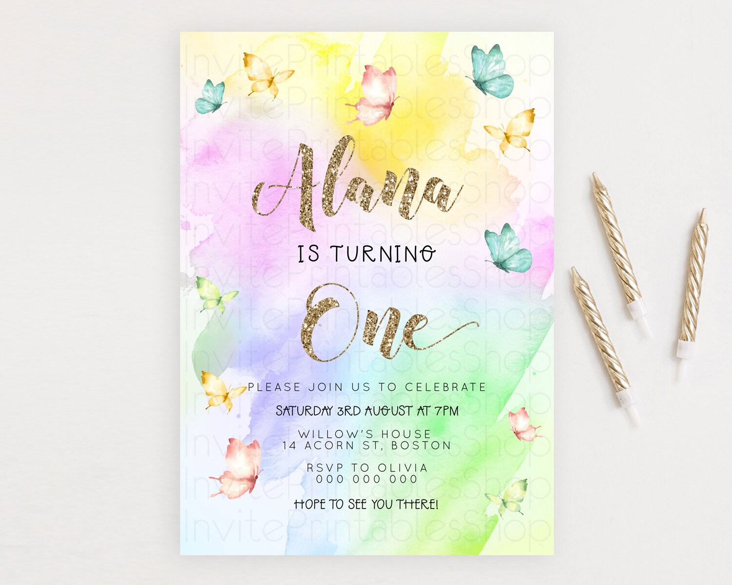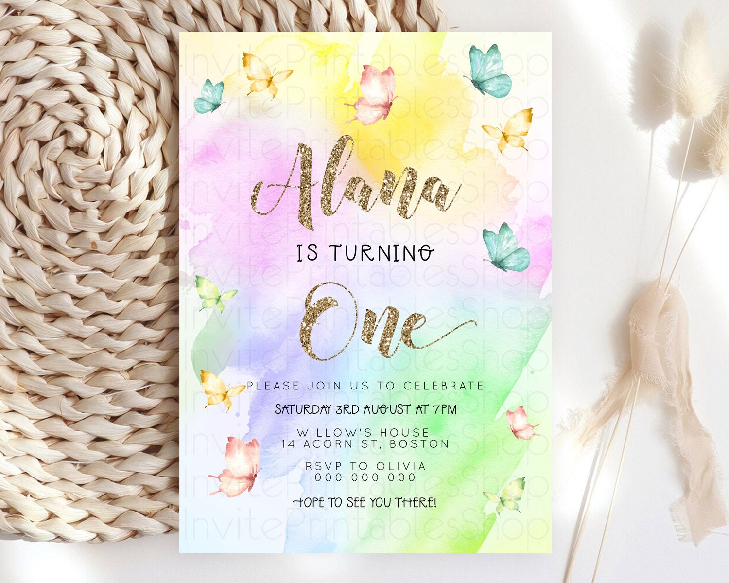 Pastel Butterfly Birthday Invitation Butterfly Birthday Invitation Colorful Splash Glitter Butterfly Garden 1st 2nd Birthday D23258