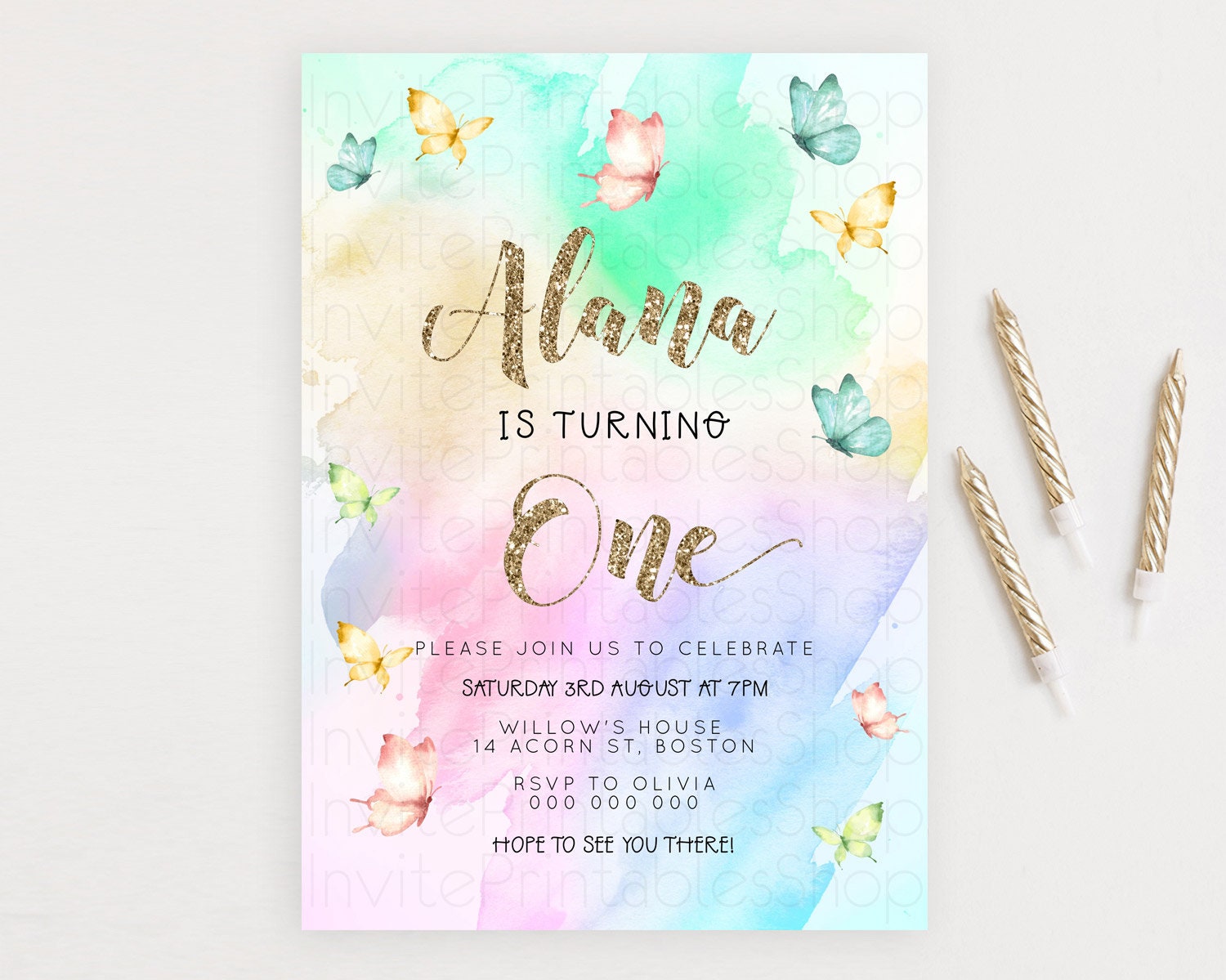 Pastel Butterfly Birthday Invitation Butterfly Birthday Invitation Colorful Splash Glitter Butterfly Garden 1st 2nd Birthday D23259