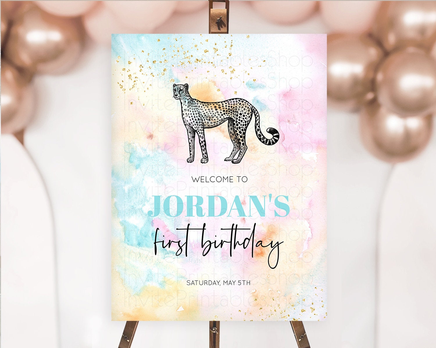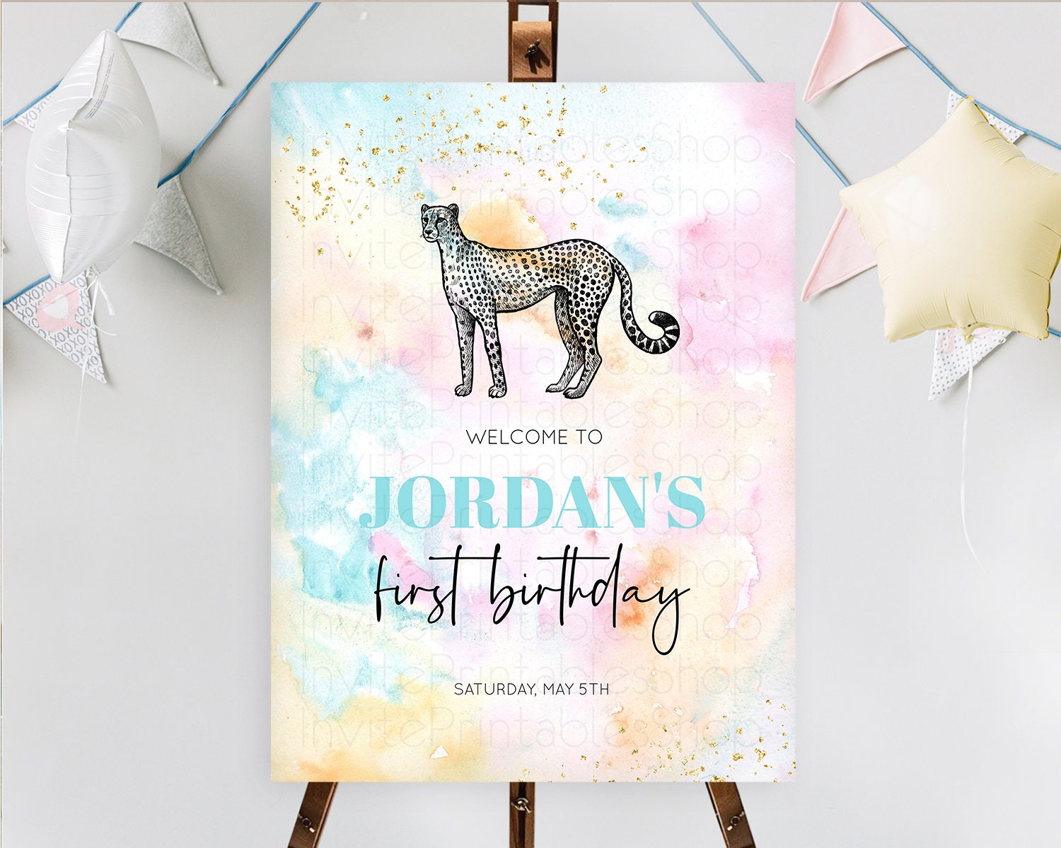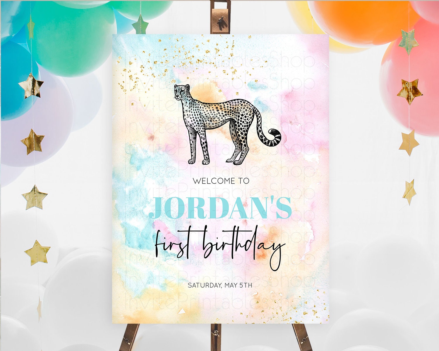 Pastel Cheetah Welcome Sign Rainbow Cheetah Welcome Board Colorful Rainbow Pastel Confetti Watercolor First Birthday Welcome Sign D10289