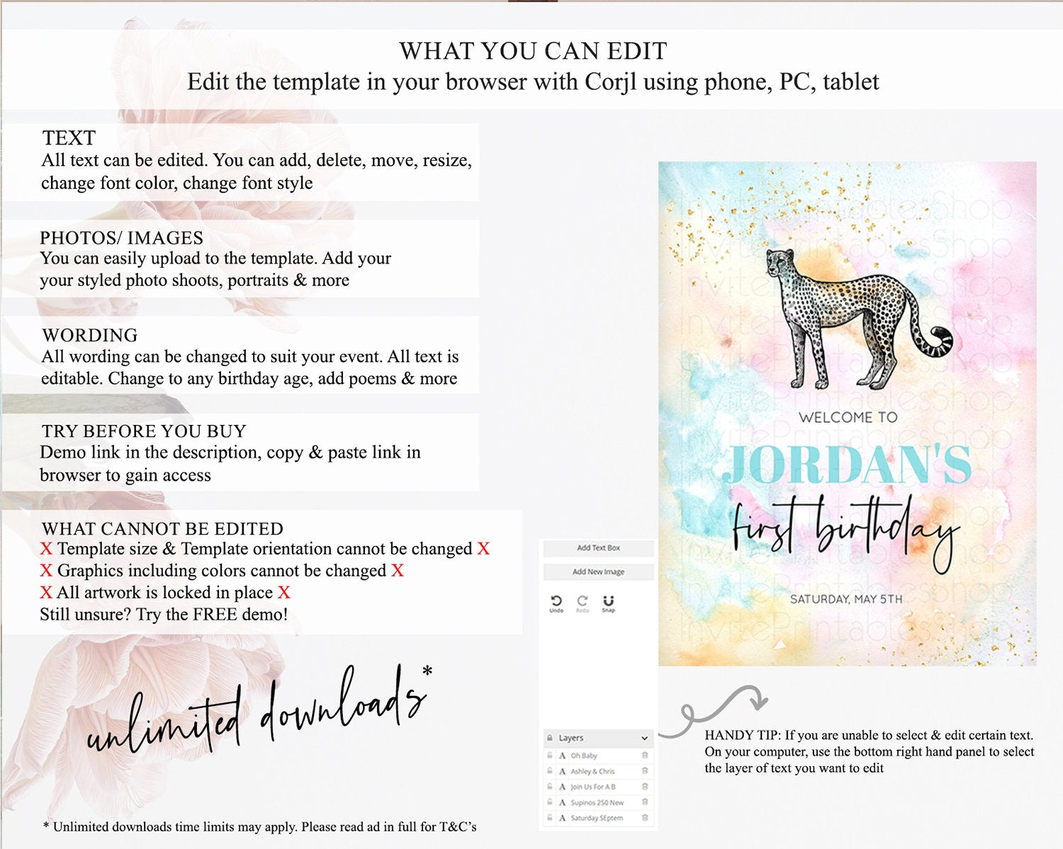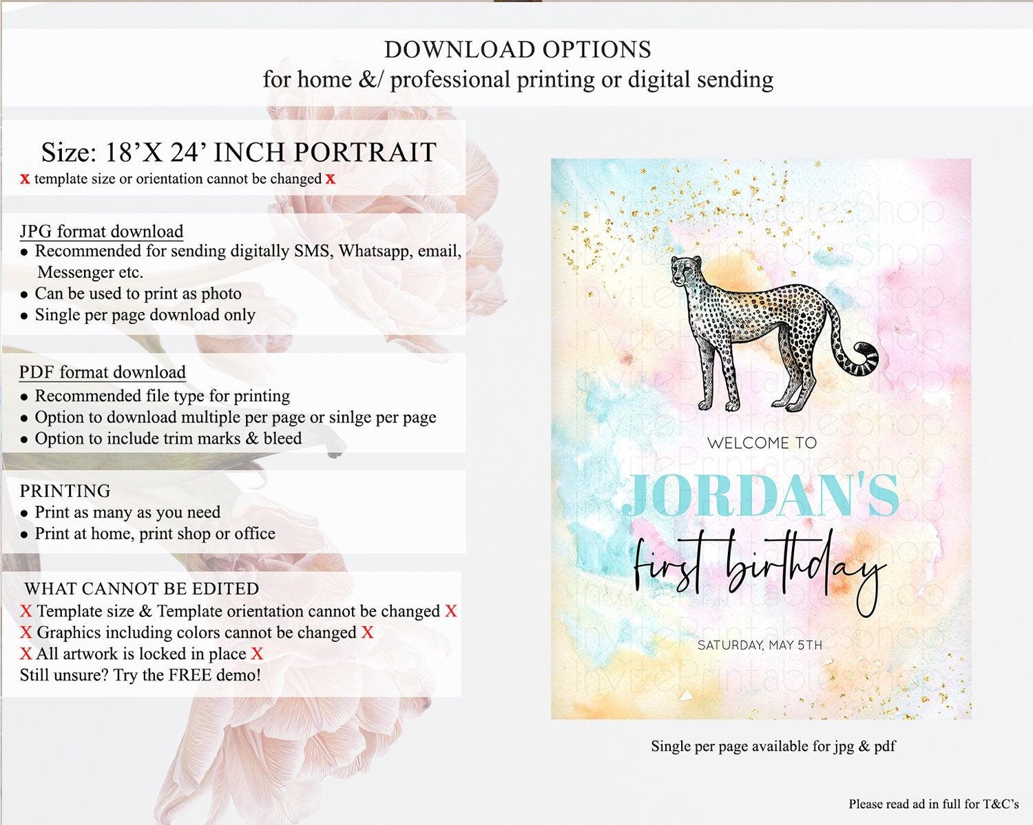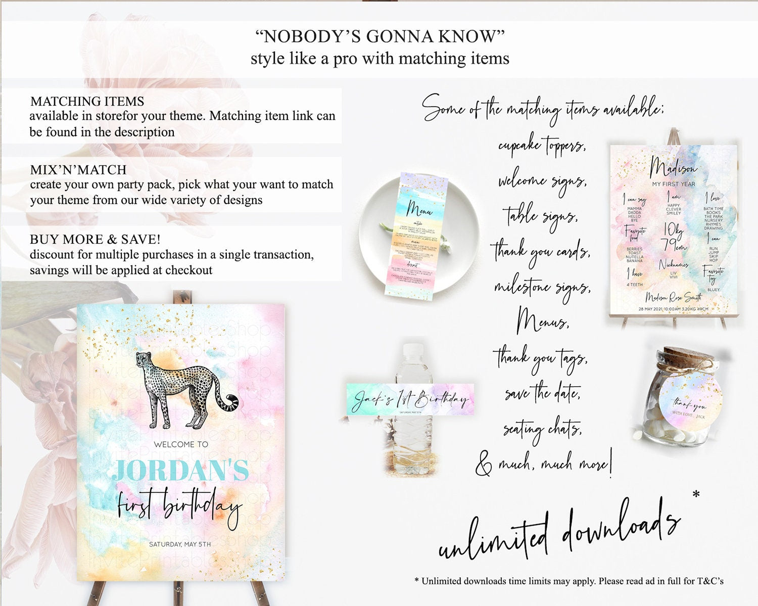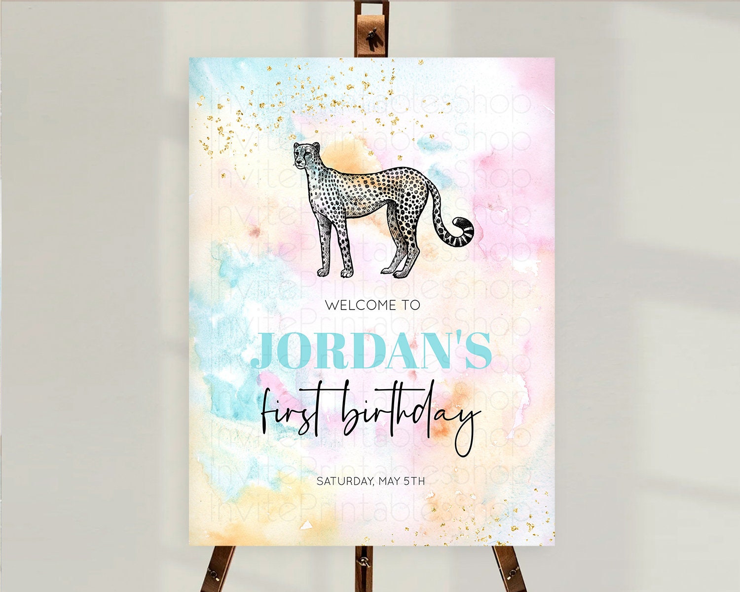 Pastel Cheetah Welcome Sign Rainbow Cheetah Welcome Board Colorful Rainbow Pastel Confetti Watercolor First Birthday Welcome Sign D10289
