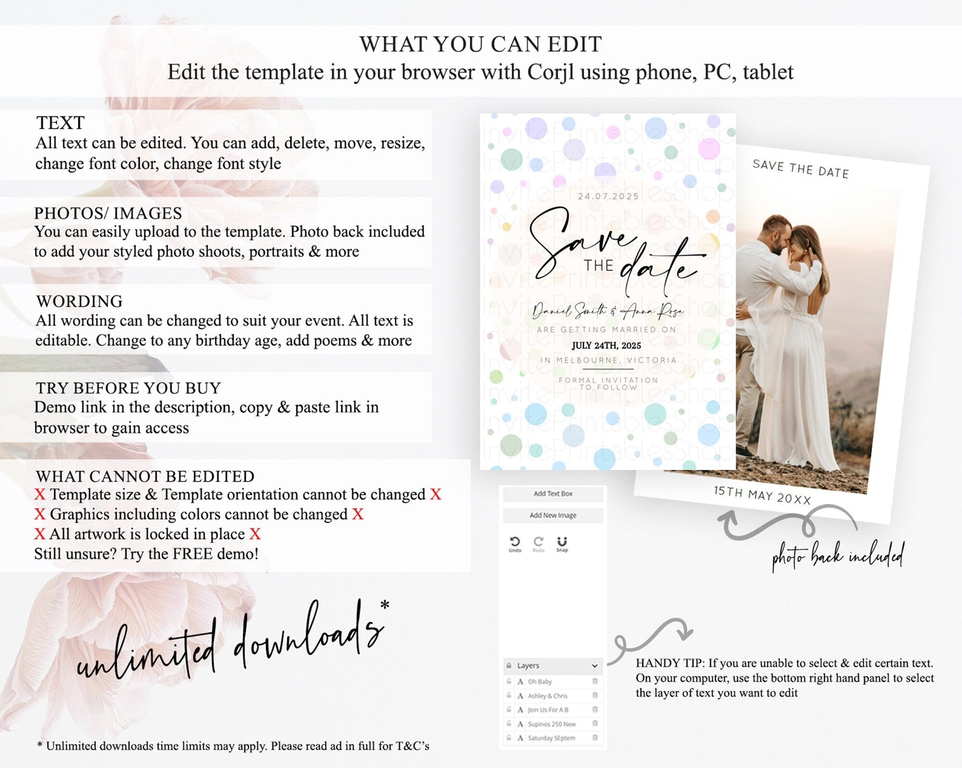 Pastel Confetti Save The Date Template Rainbow Colorful Sprinkles Party For 1st Birthday Baptism Baby Shower Wedding Bridal Shower D10135