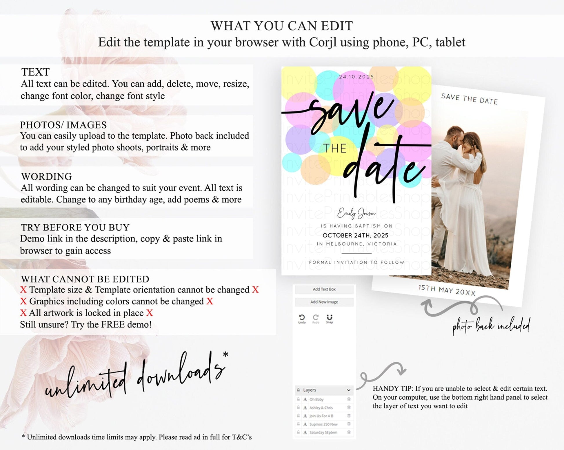 • Template size & orientation cannot be changed. Please use the demo link to confirm this product suits your needs.