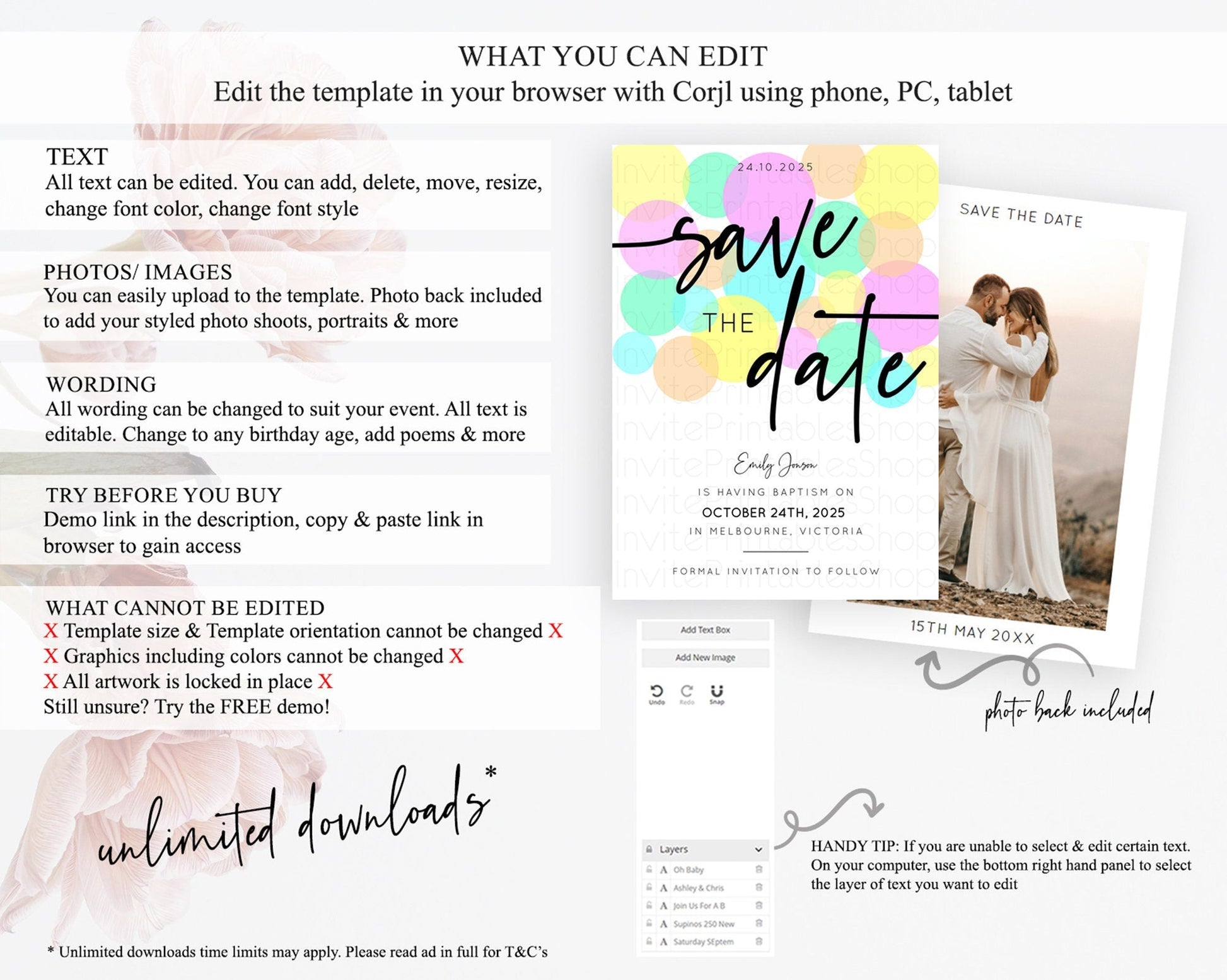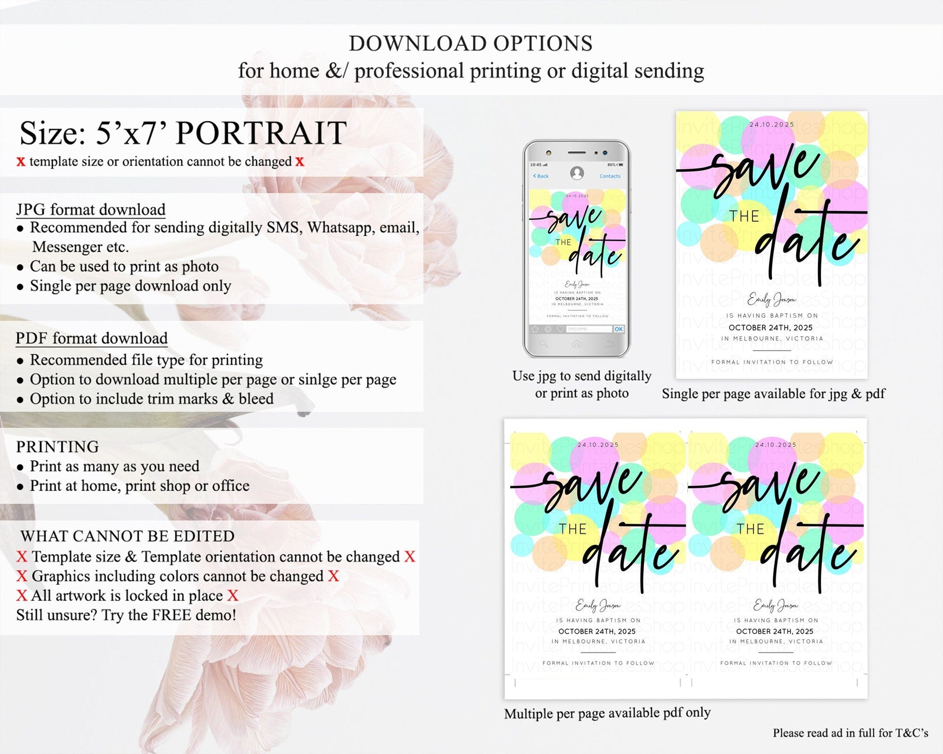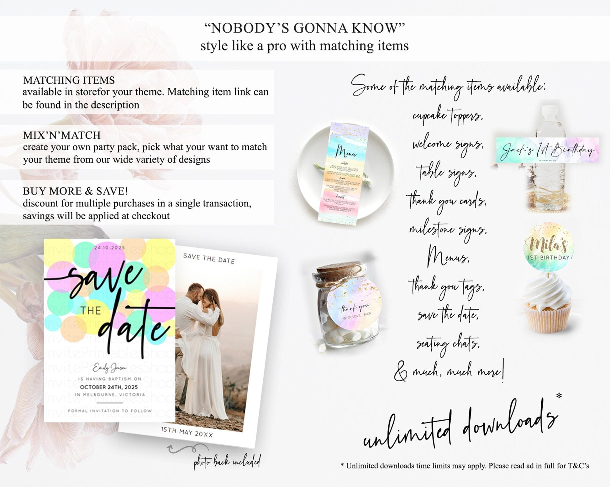 Pastel Confetti Save The Date Template Rainbow Colorful Sprinkles Party For 1st Birthday Baptism Baby Shower Wedding Bridal Shower D10410