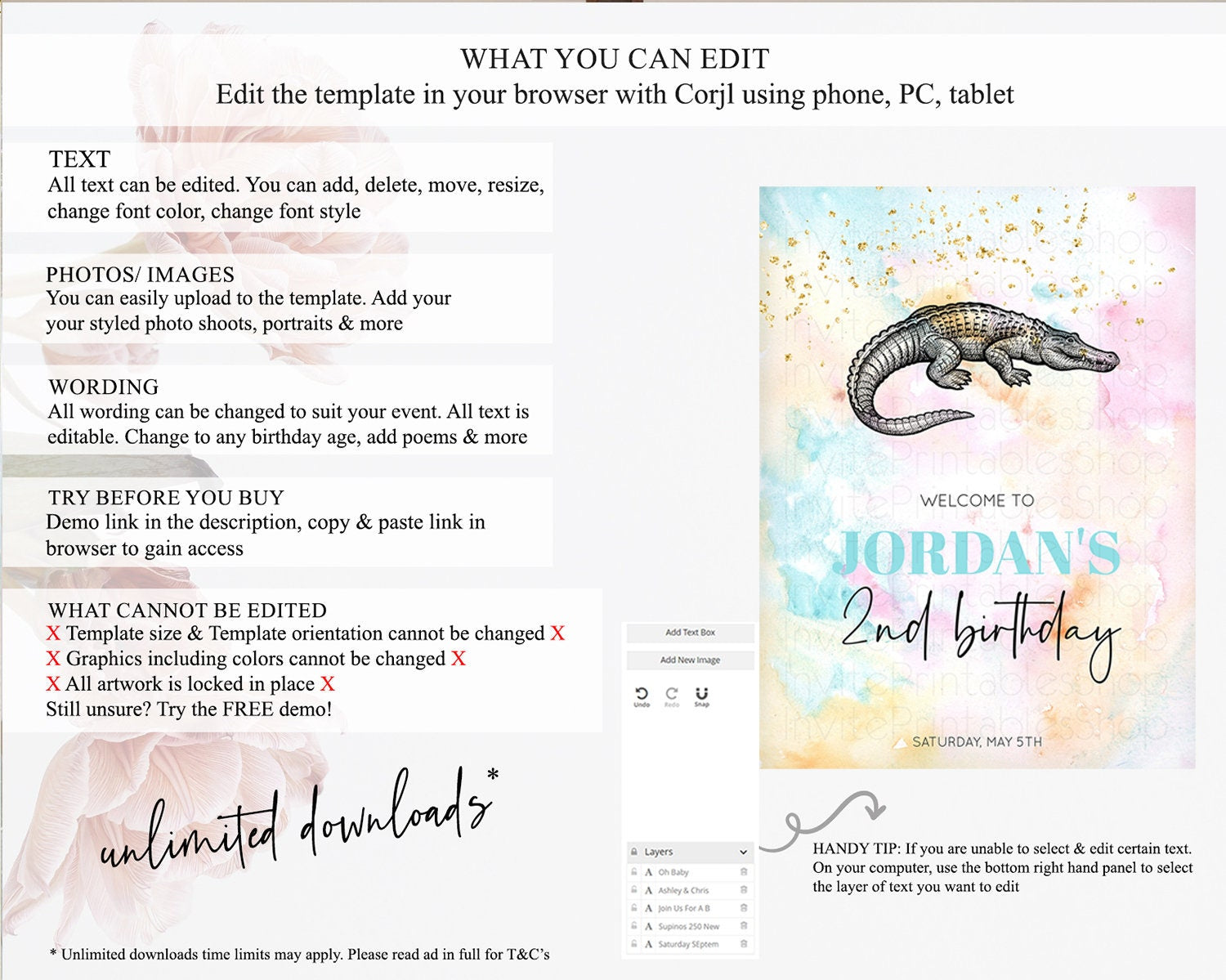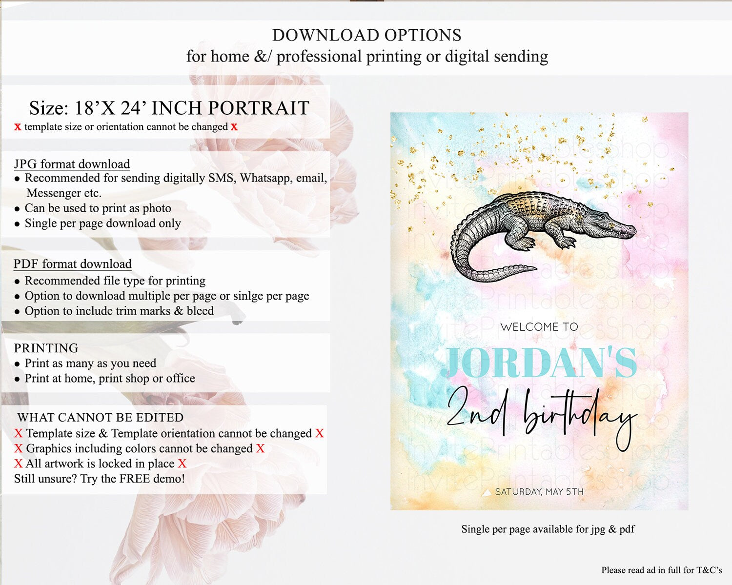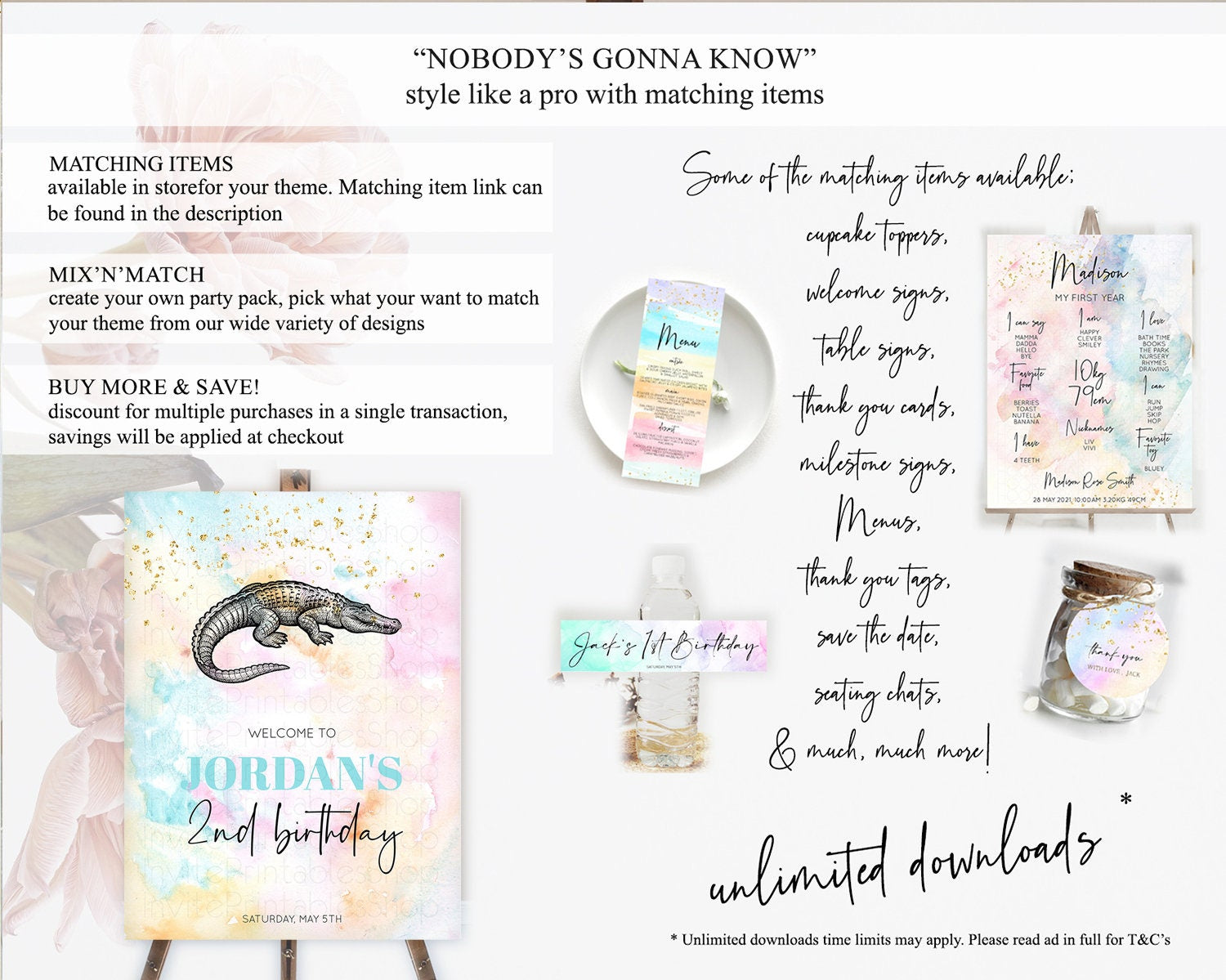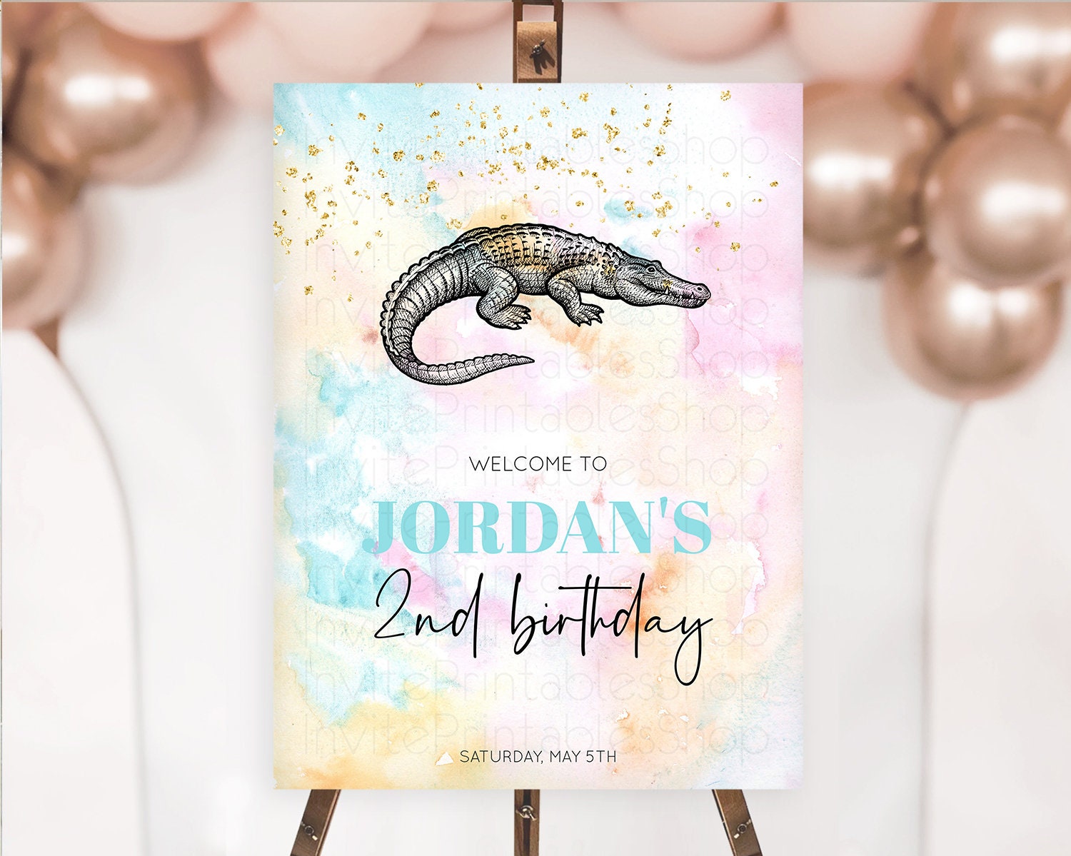 Pastel Crocodile Welcome Sign Pastel Alligator Welcome Board Safari Colorful Watercolor Rainbow First Birthday Welcome Sign D10285
