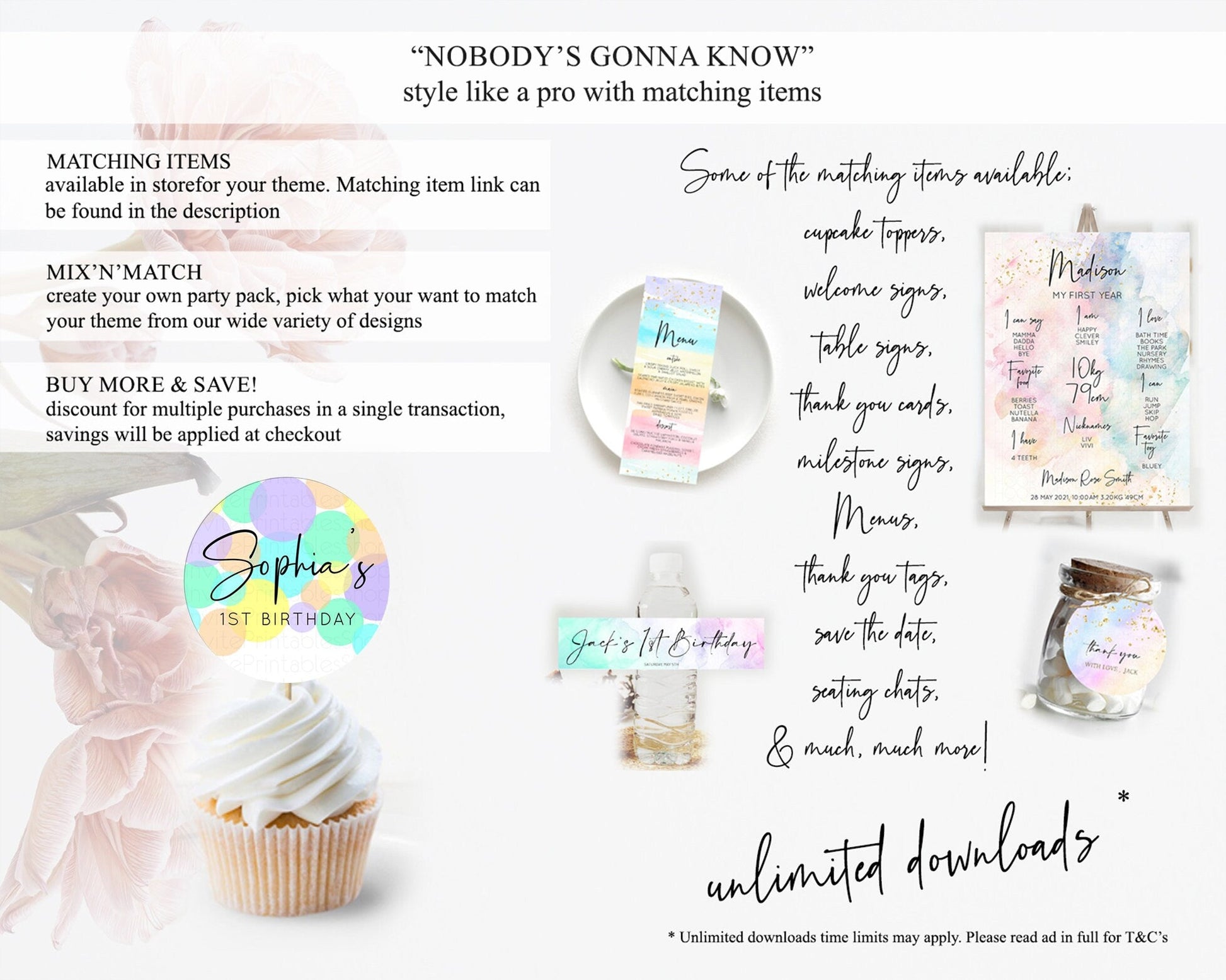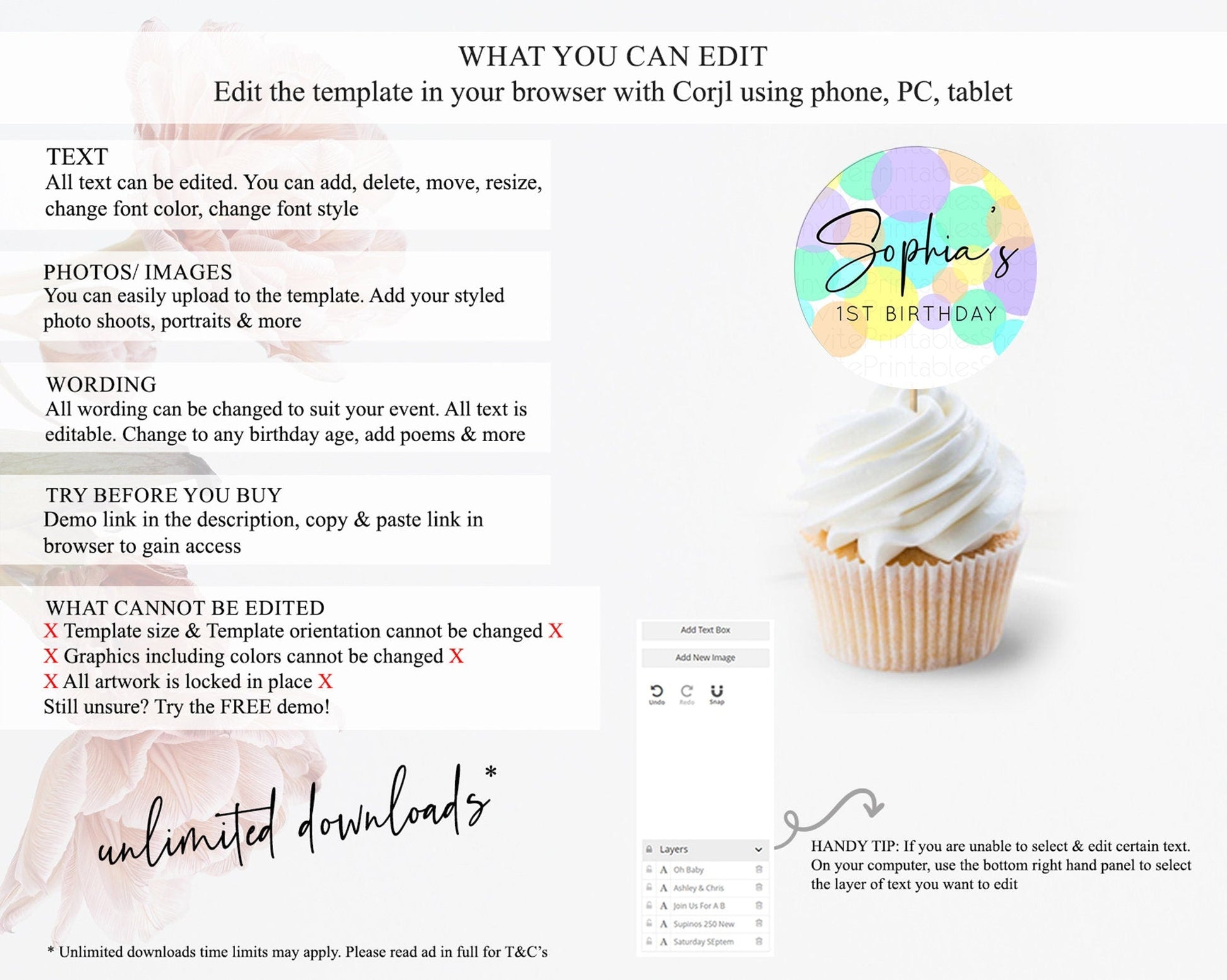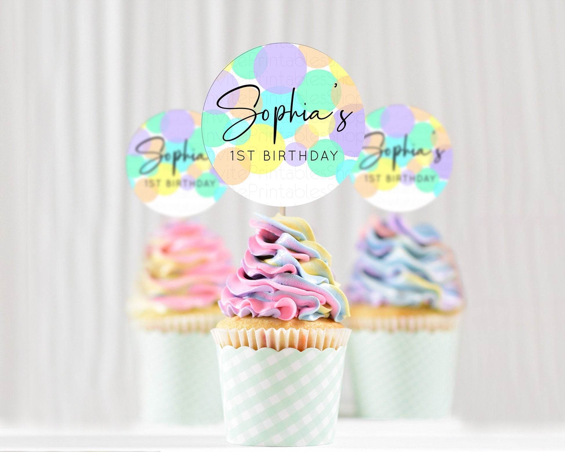 Pastel Cupcake Toppers Pastel Confetti Cupcake Topper Bubbles Sprinkles Colorful Rainbow Confetti Cupcake First Birthday Party Decor D10412