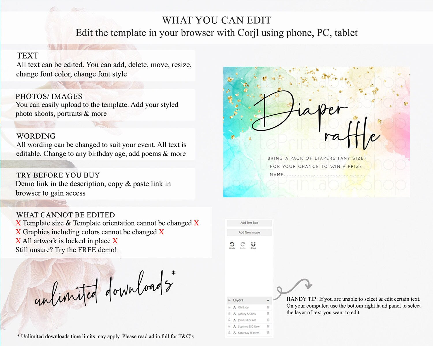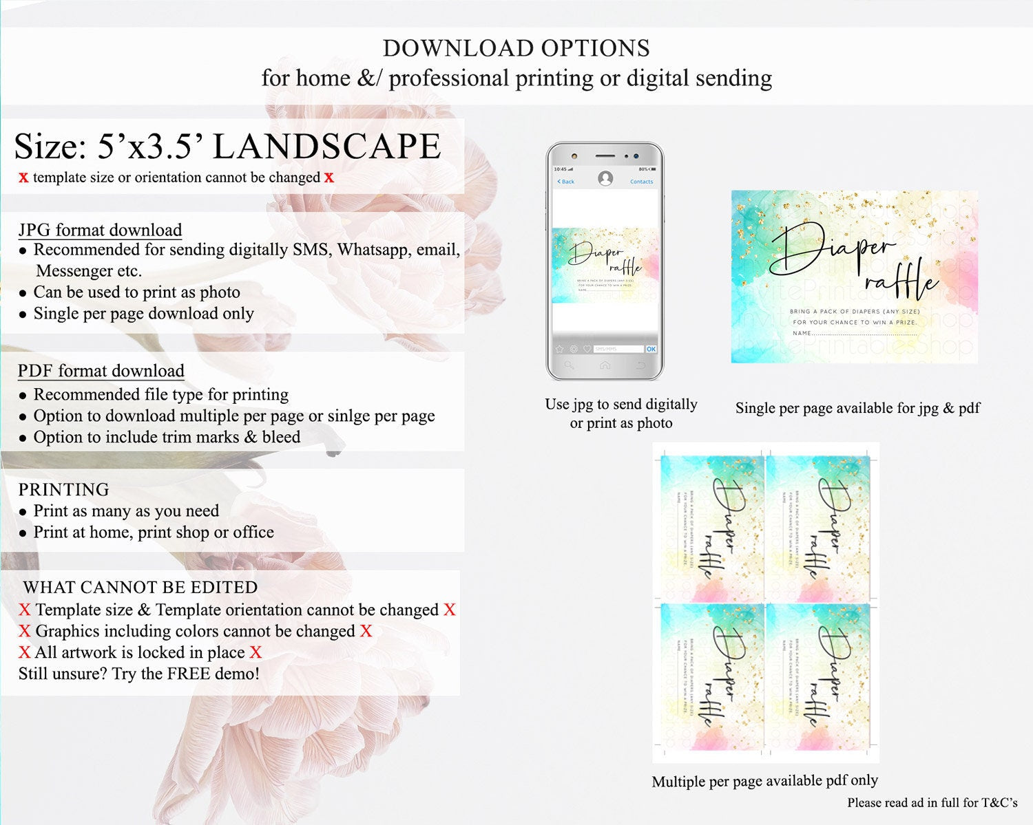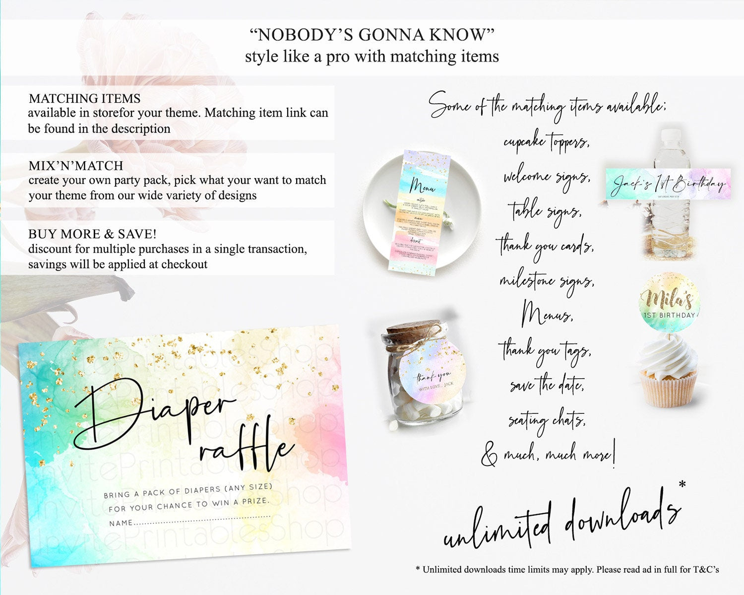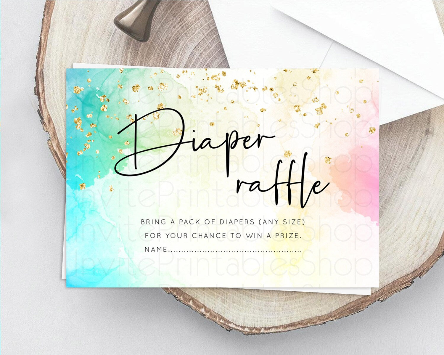 Pastel Diaper Raffle Card Pastel Rainbow Diaper Raffle Insert Colorful Ombre Watercolor Diaper Ticket Confetti Glitter Raffle Game D10151