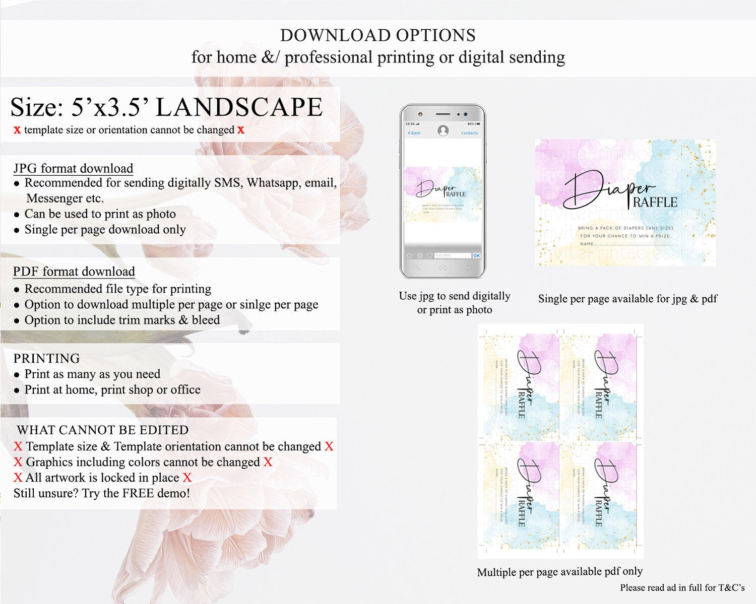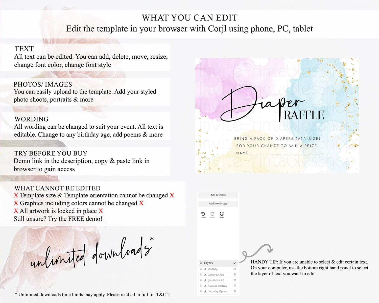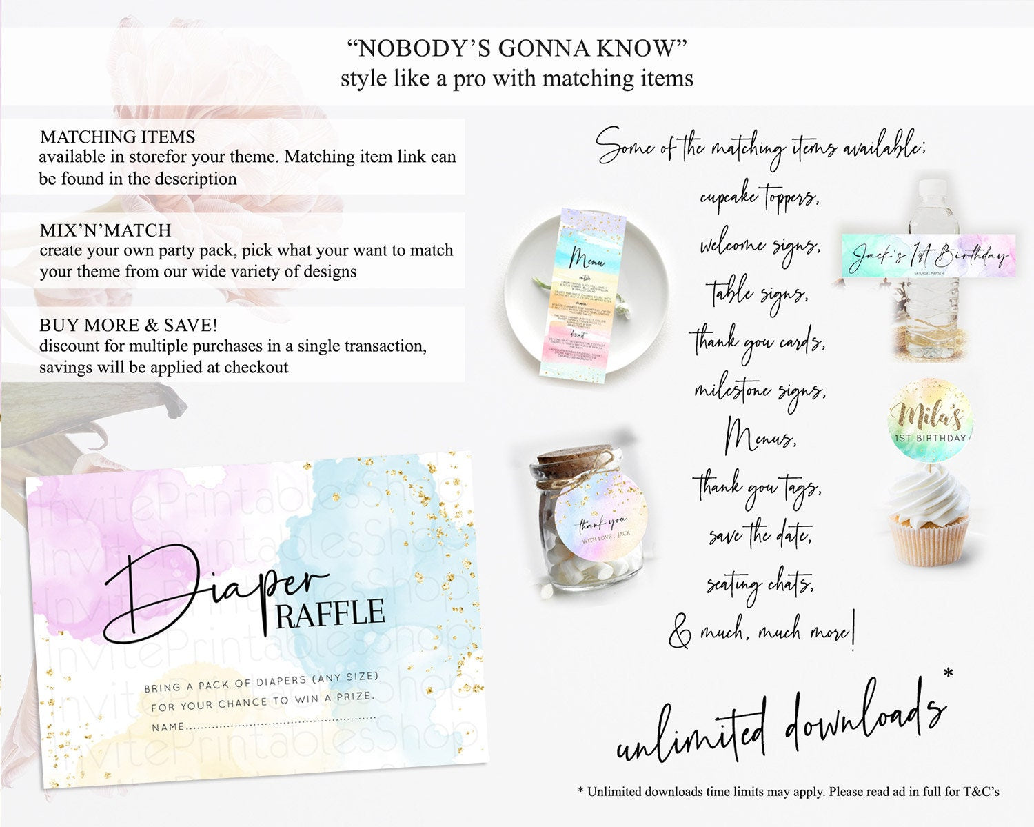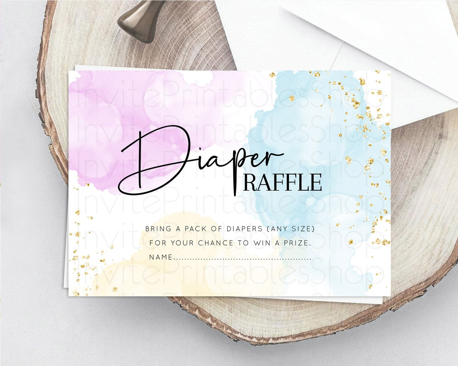 Pastel Diaper Raffle Card Pastel Rainbow Diaper Raffle Insert Colorful Ombre Watercolor Diaper Ticket Confetti Glitter Raffle Game D10155