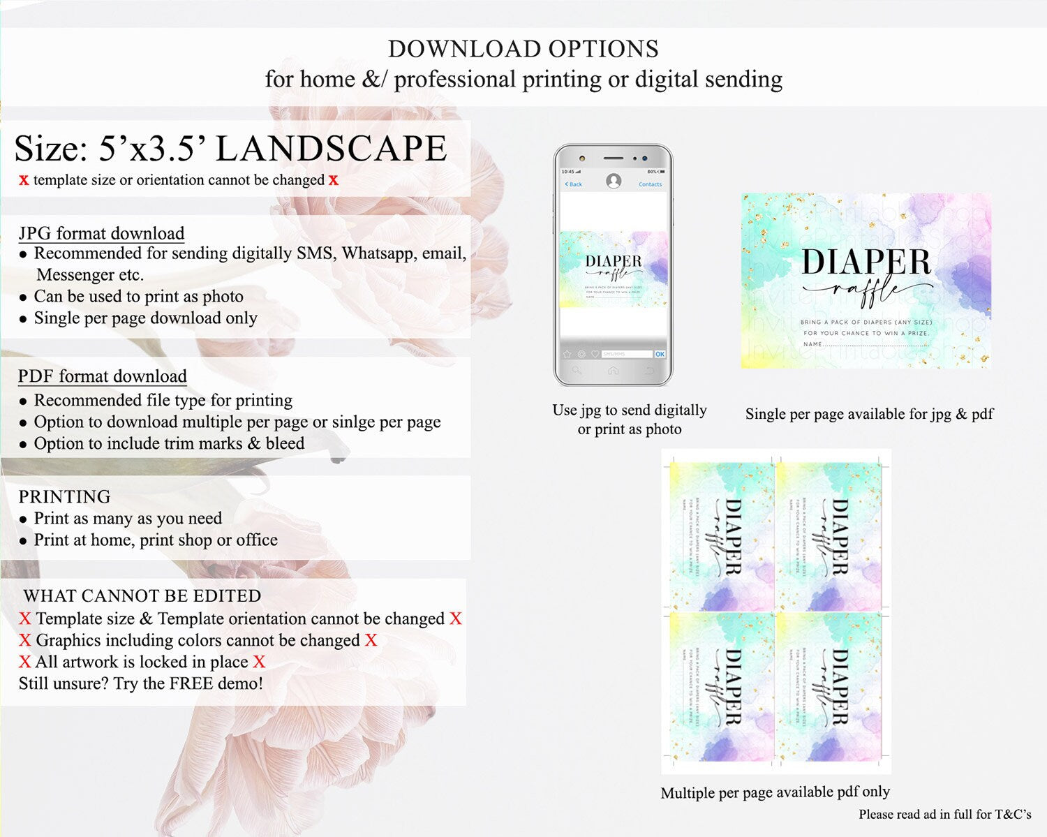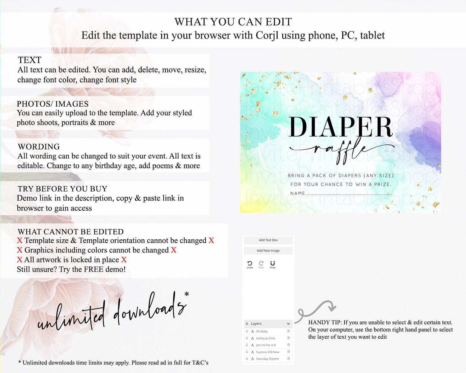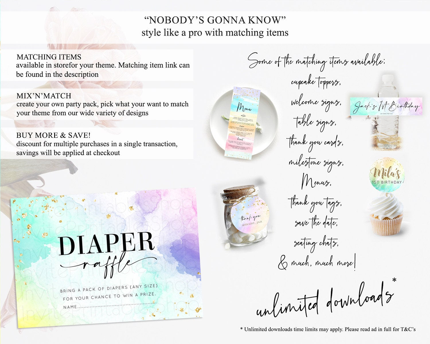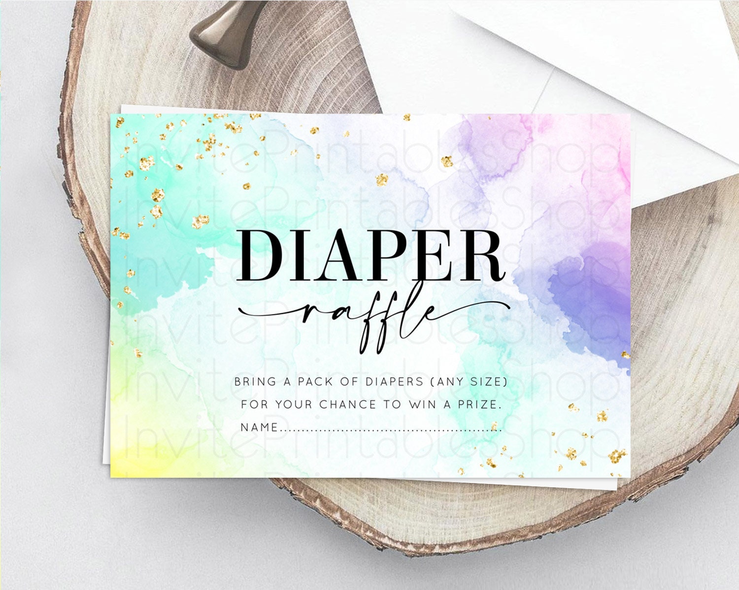 Pastel Diaper Raffle Card Pastel Rainbow Diaper Raffle Insert Colorful Ombre Watercolor Diaper Ticket Confetti Glitter Raffle Game D10157