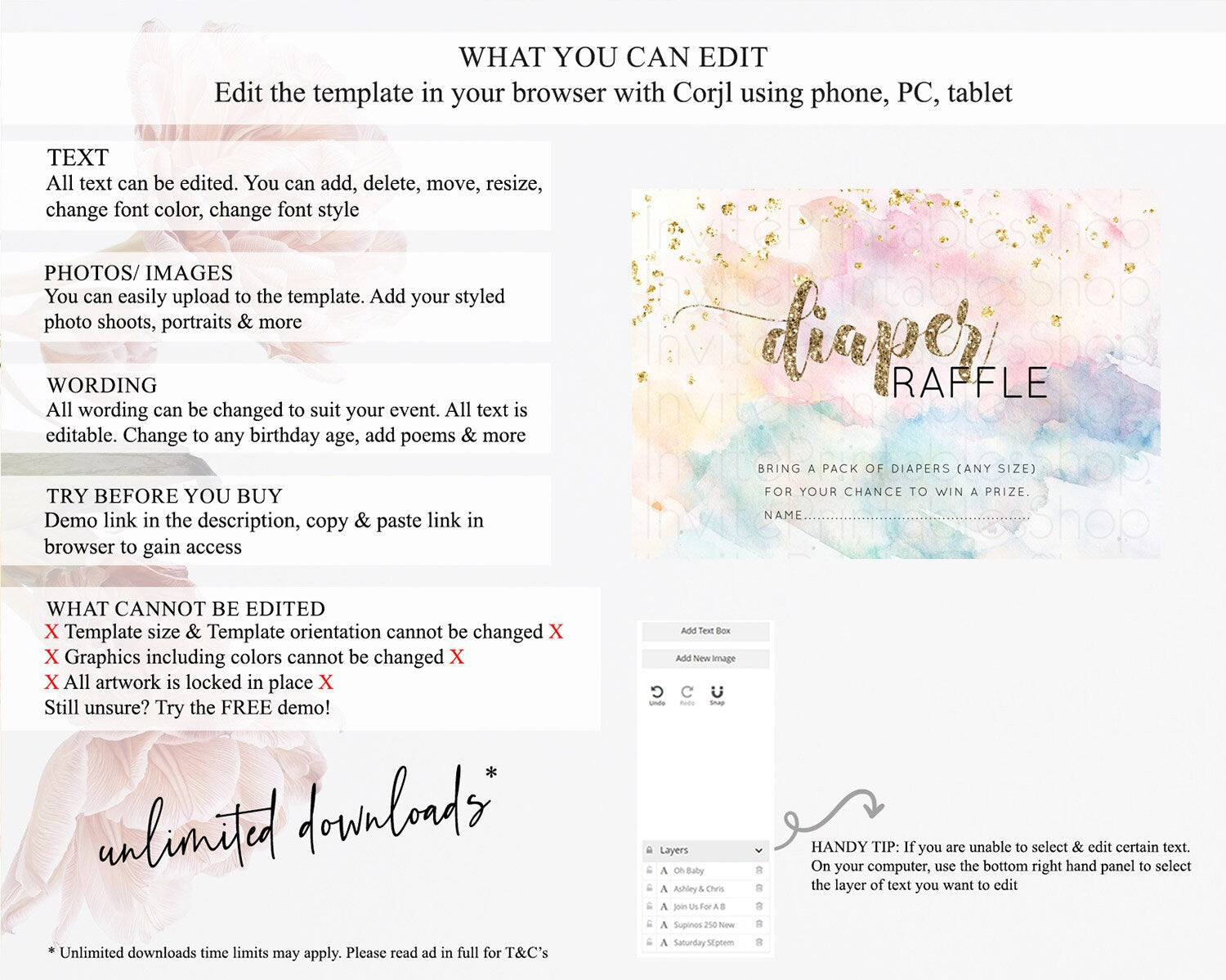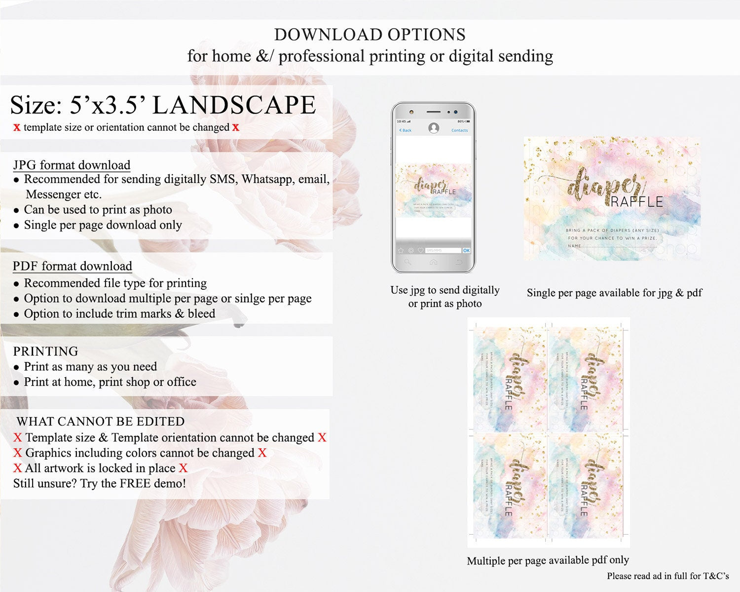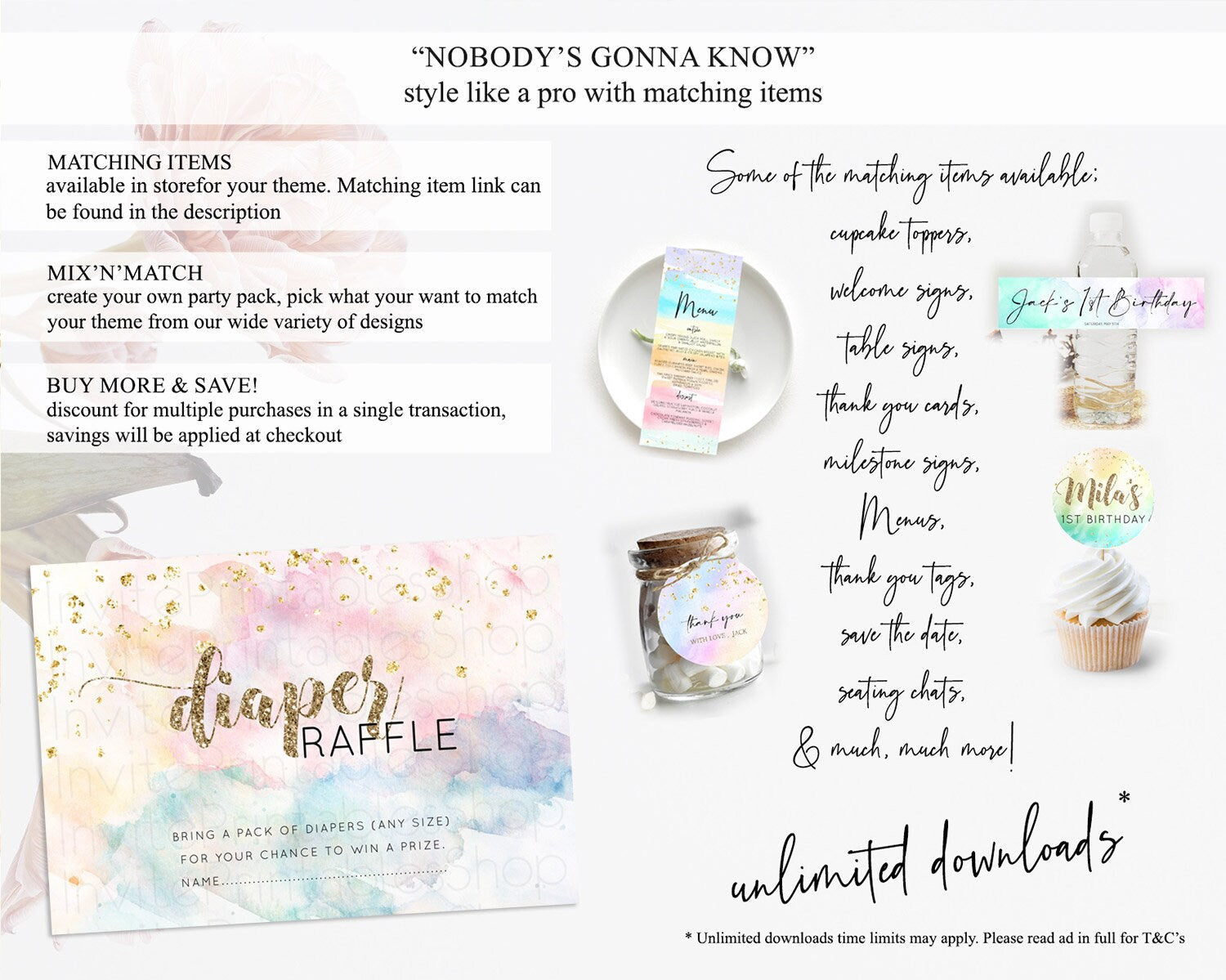 Pastel Diaper Raffle Card Pastel Rainbow Diaper Raffle Insert Colorful Ombre Watercolor Diaper Ticket Confetti Glitter Raffle Game D10264