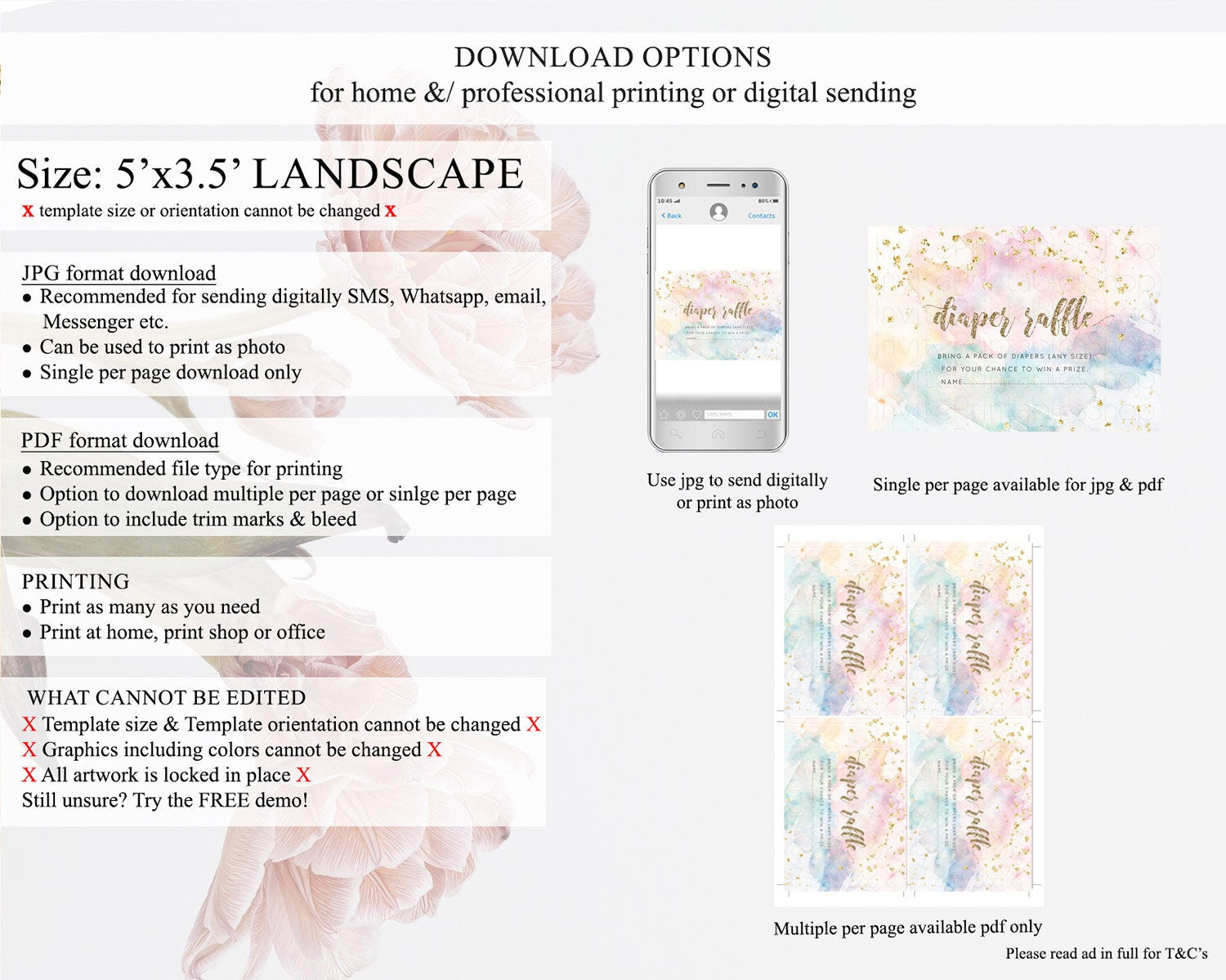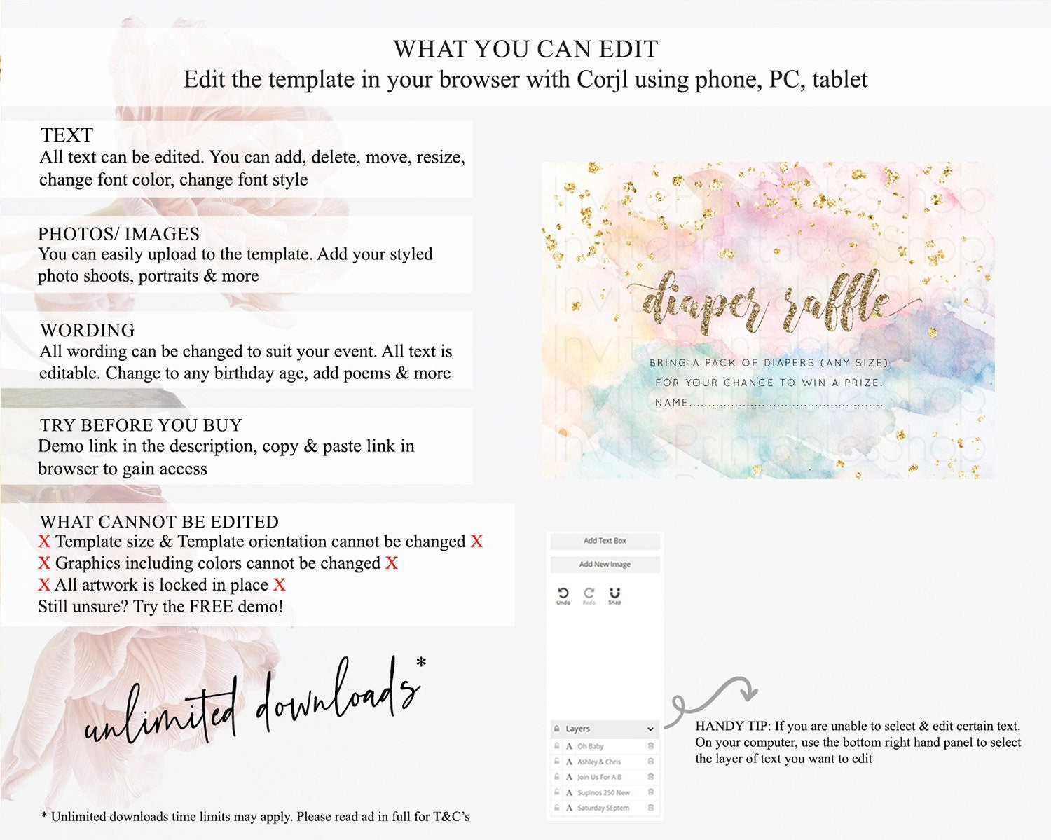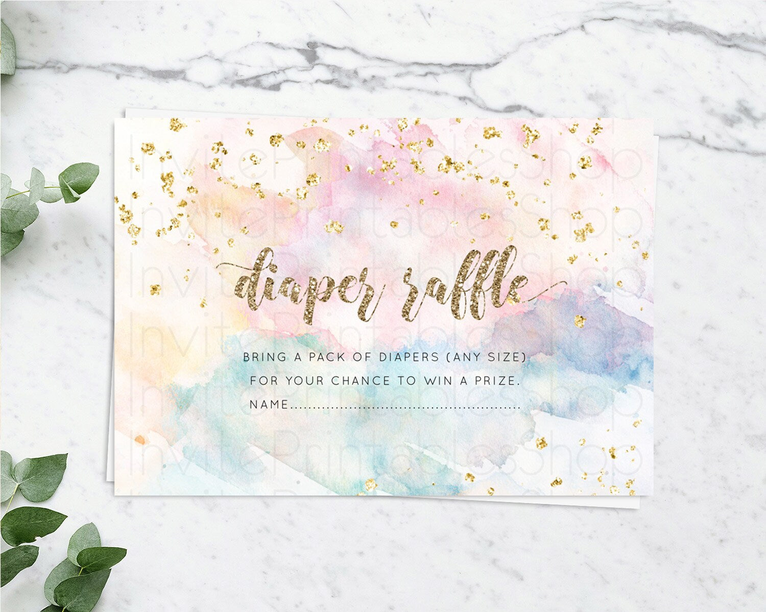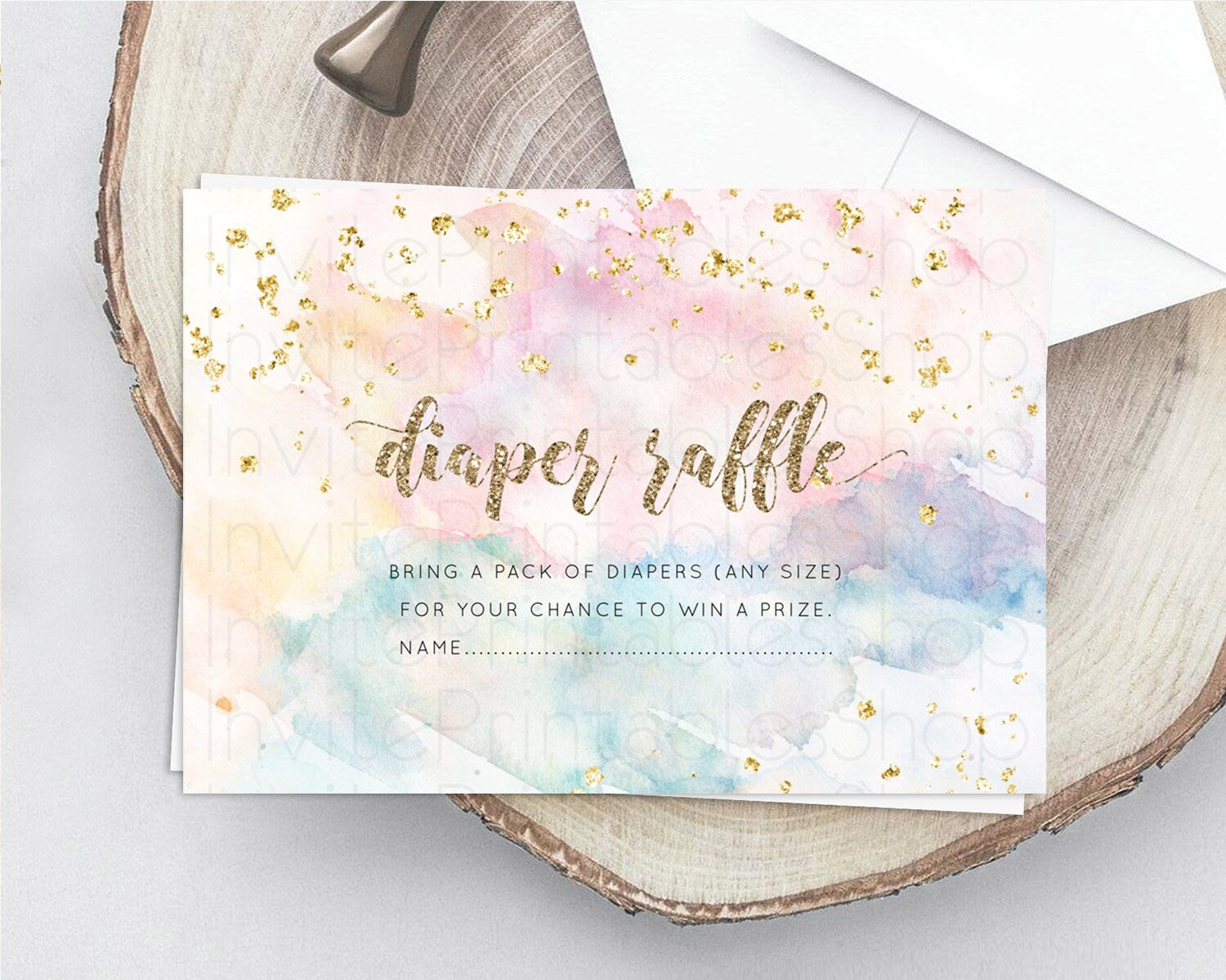 Pastel Diaper Raffle Card Pastel Rainbow Diaper Raffle Insert Colorful Ombre Watercolor Diaper Ticket Confetti Glitter Raffle Game D10264