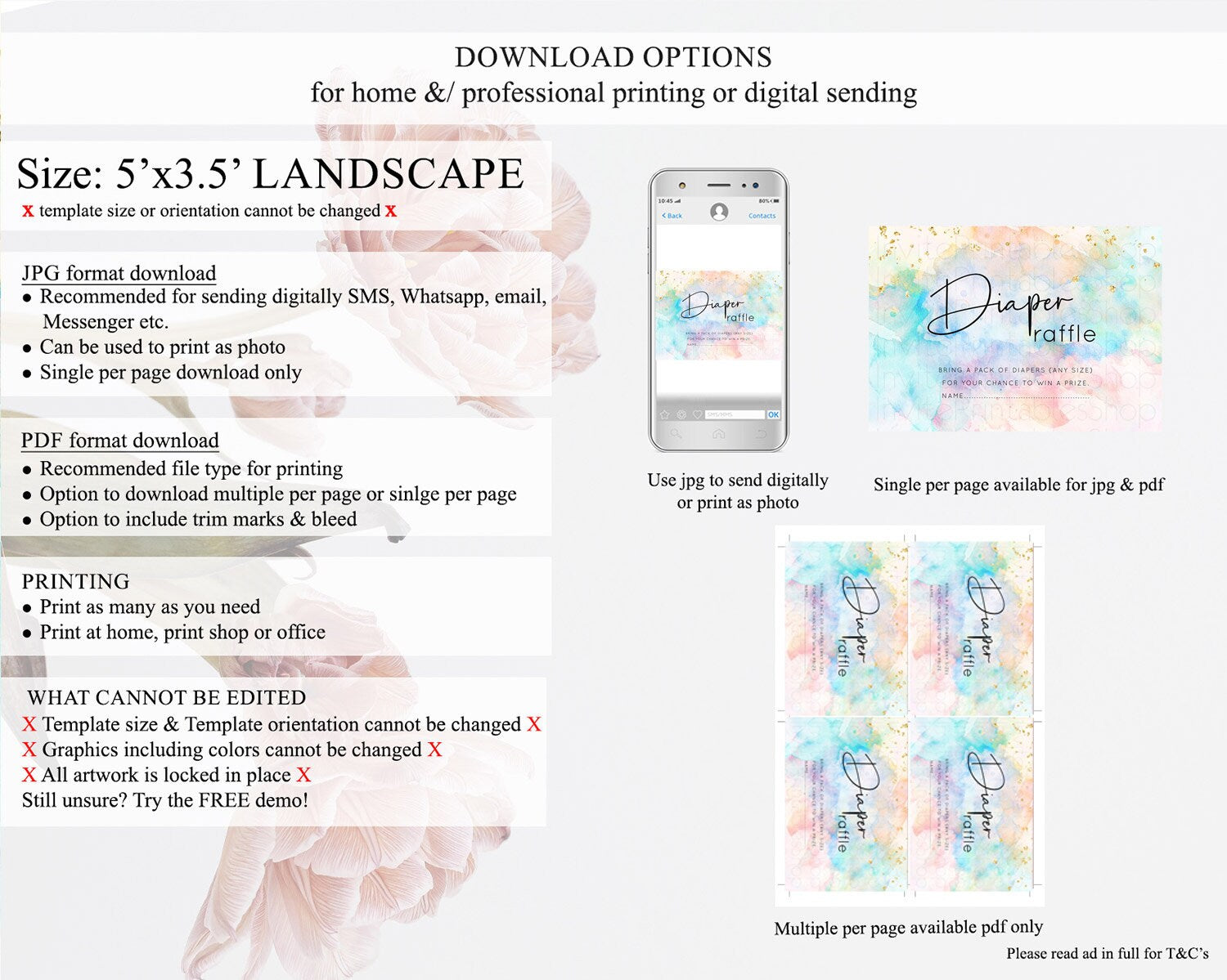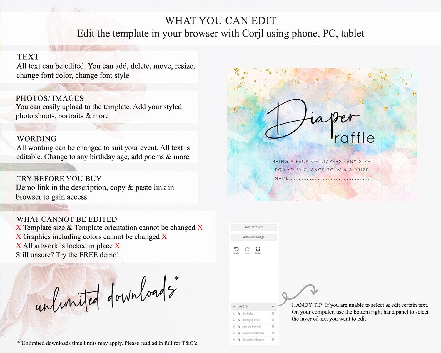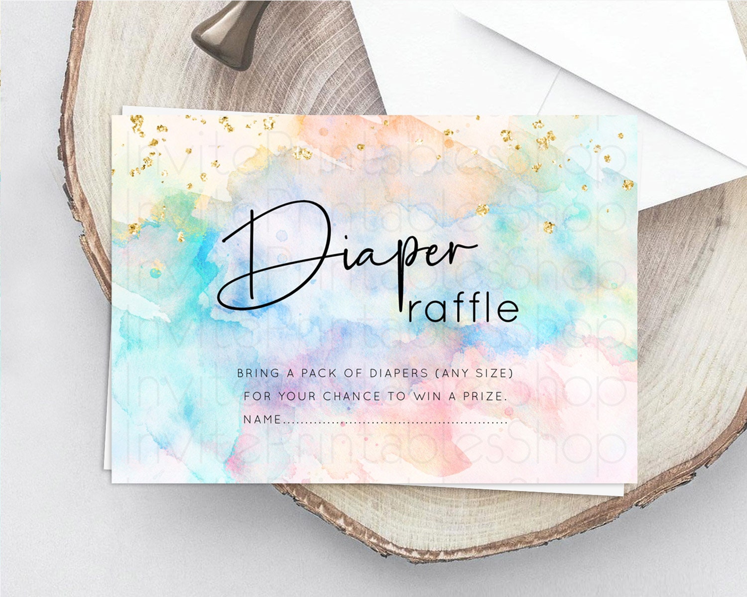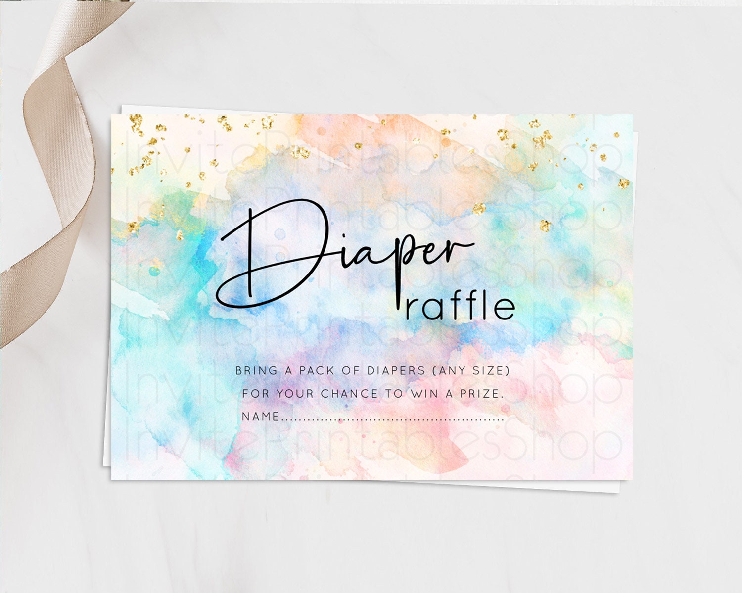Pastel Diaper Raffle Card Pastel Rainbow Diaper Raffle Insert Colorful Ombre Watercolor Diaper Ticket Confetti Glitter Raffle Game D10266