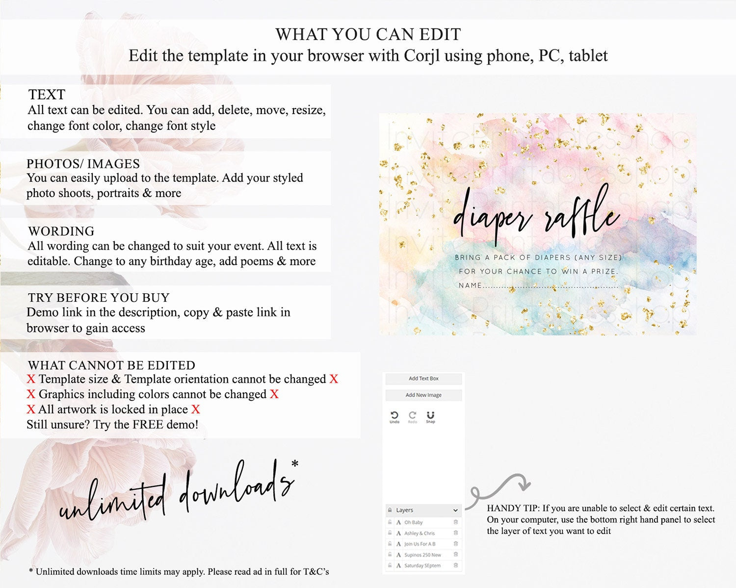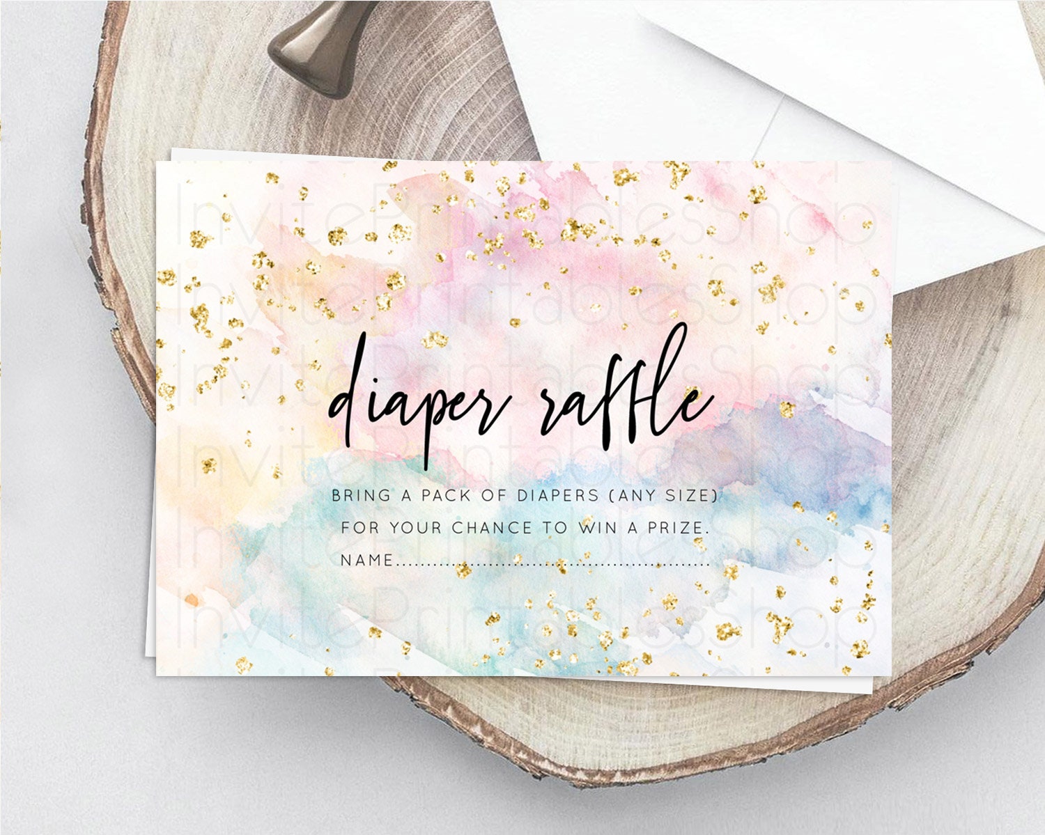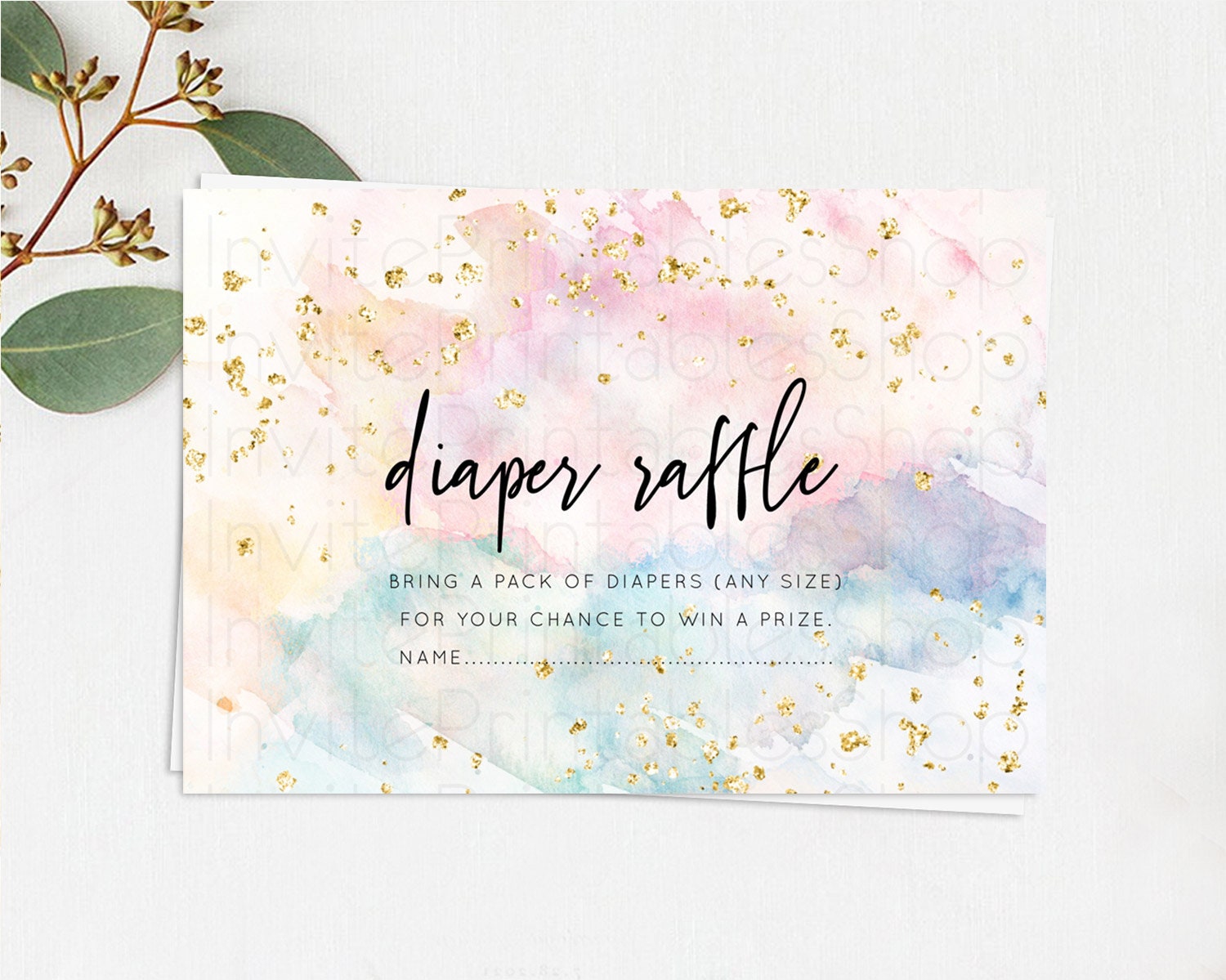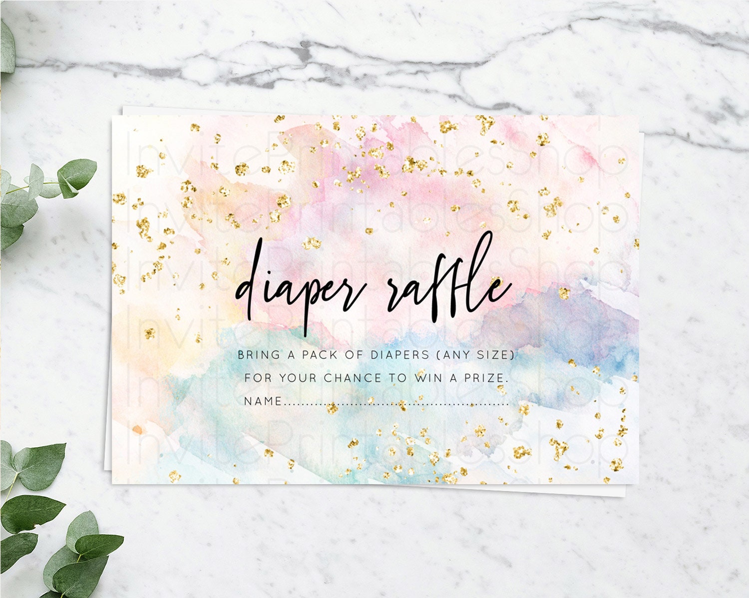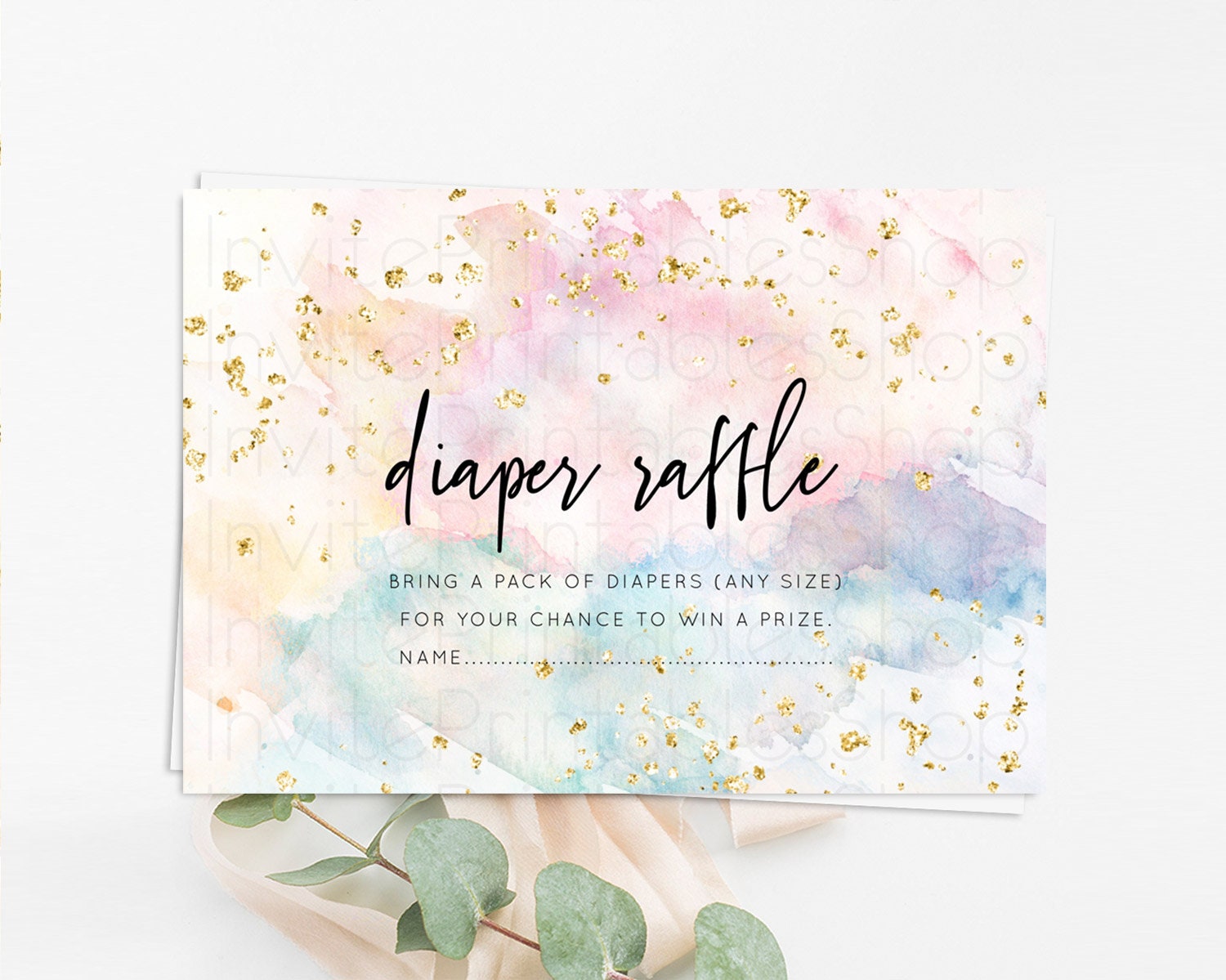 Pastel Diaper Raffle Card Pastel Rainbow Diaper Raffle Insert Colorful Ombre Watercolor Diaper Ticket Confetti Glitter Raffle Game D10276