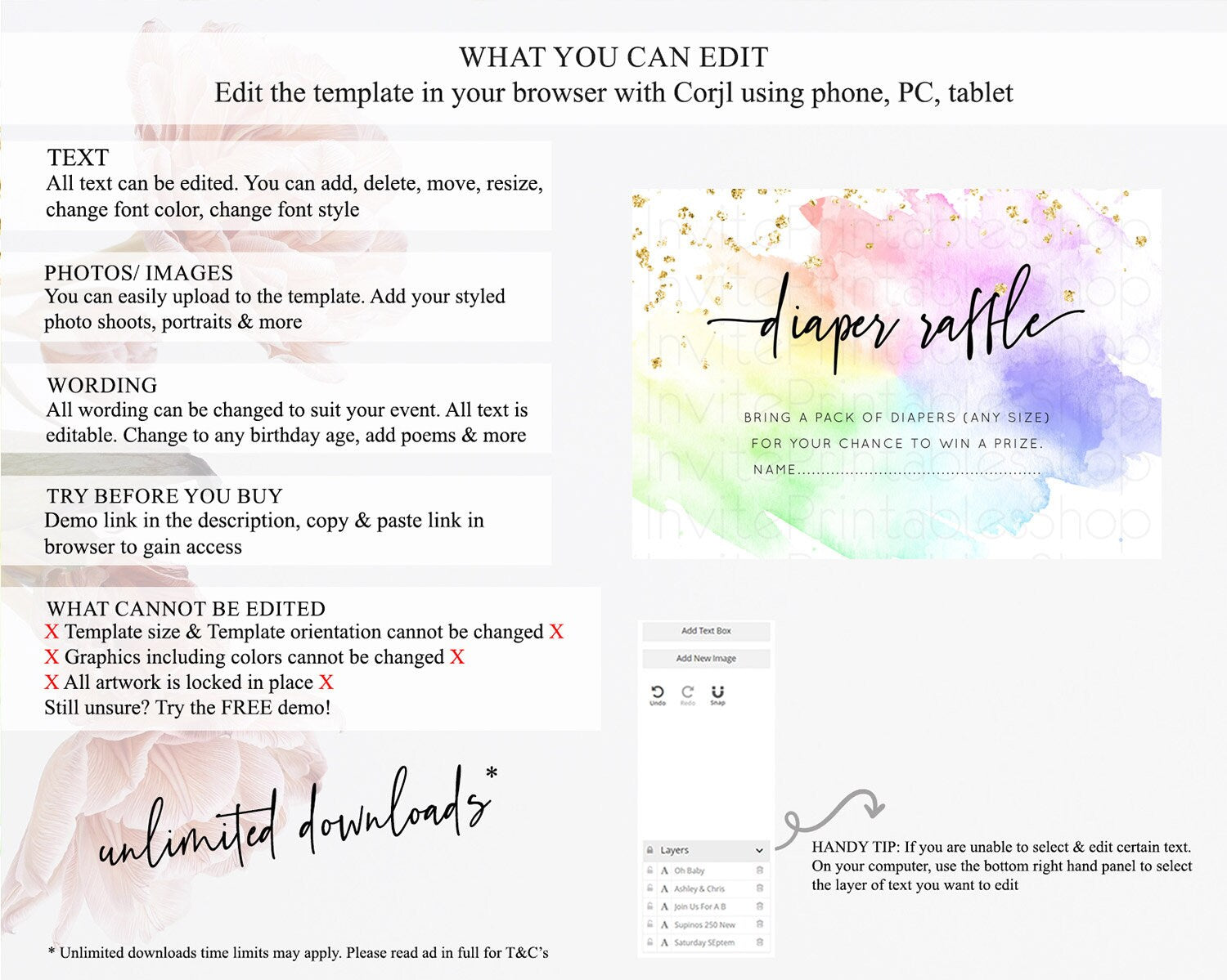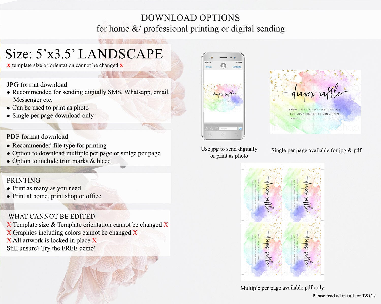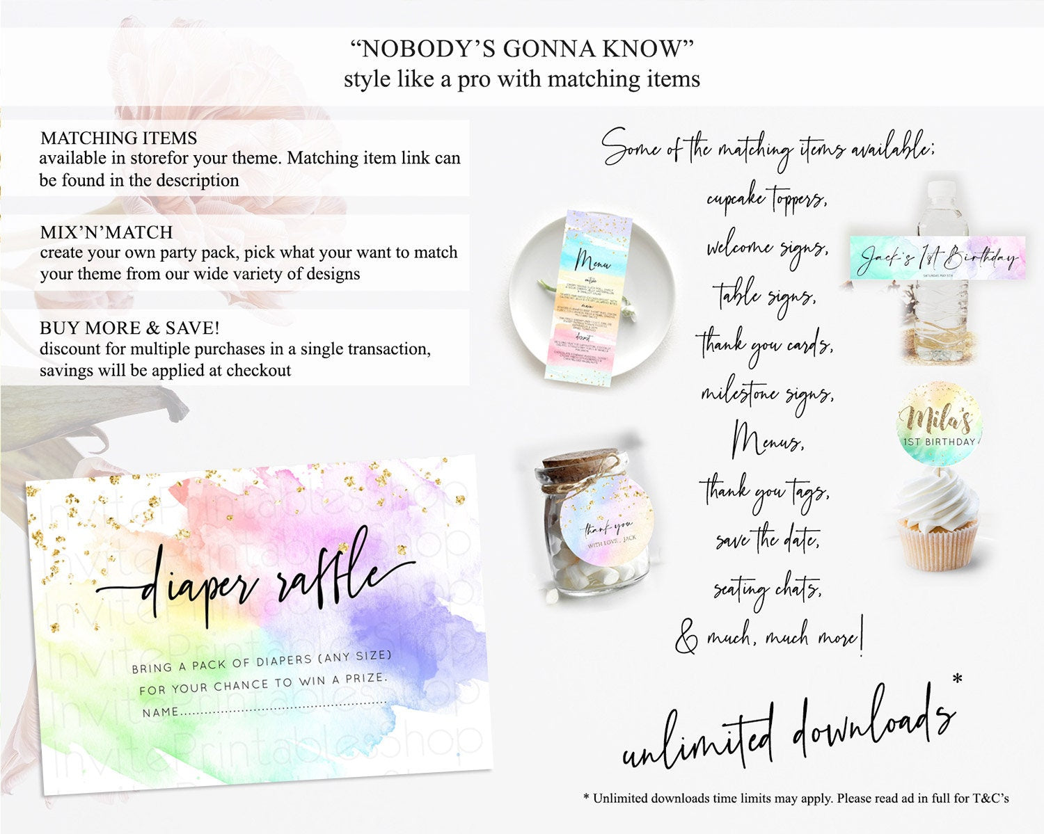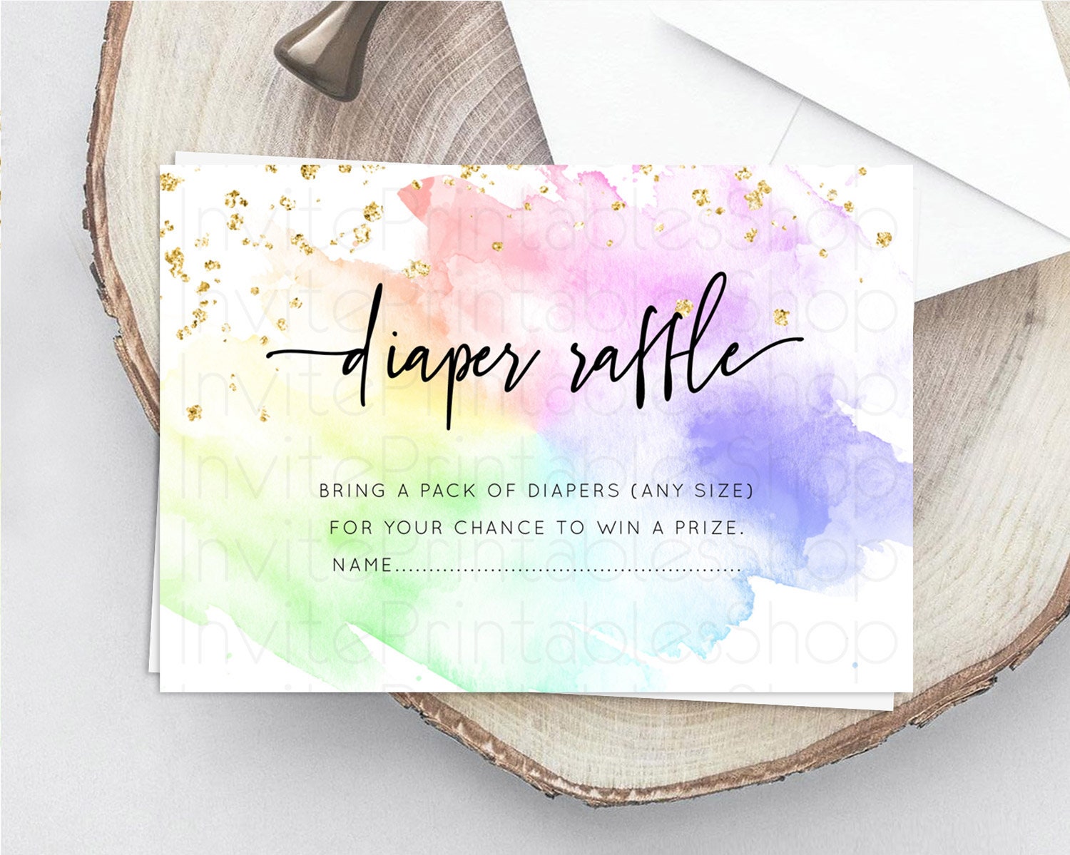 Pastel Diaper Raffle Card Pastel Rainbow Diaper Raffle Insert Colorful Ombre Watercolor Diaper Ticket Confetti Glitter Raffle Game D10316