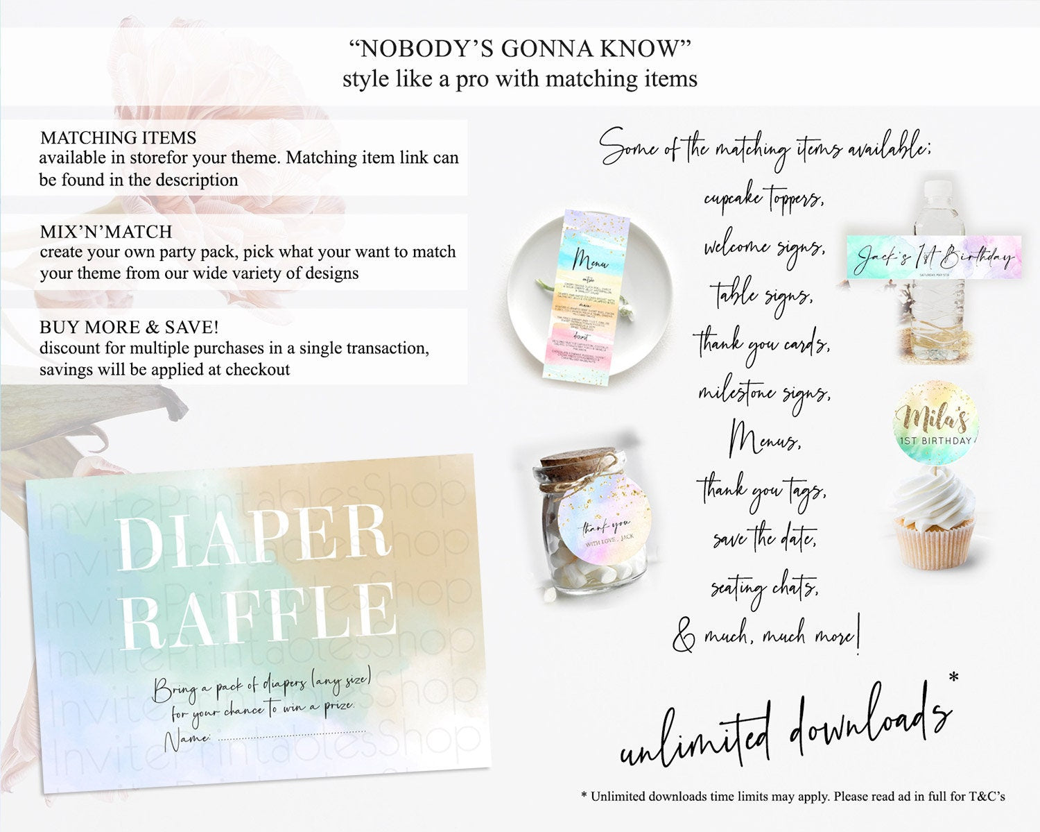 Pastel Diaper Raffle Card Pastel Rainbow Diaper Raffle Insert Colorful Ombre Watercolor Diaper Ticket Confetti Glitter Raffle Game D10370
