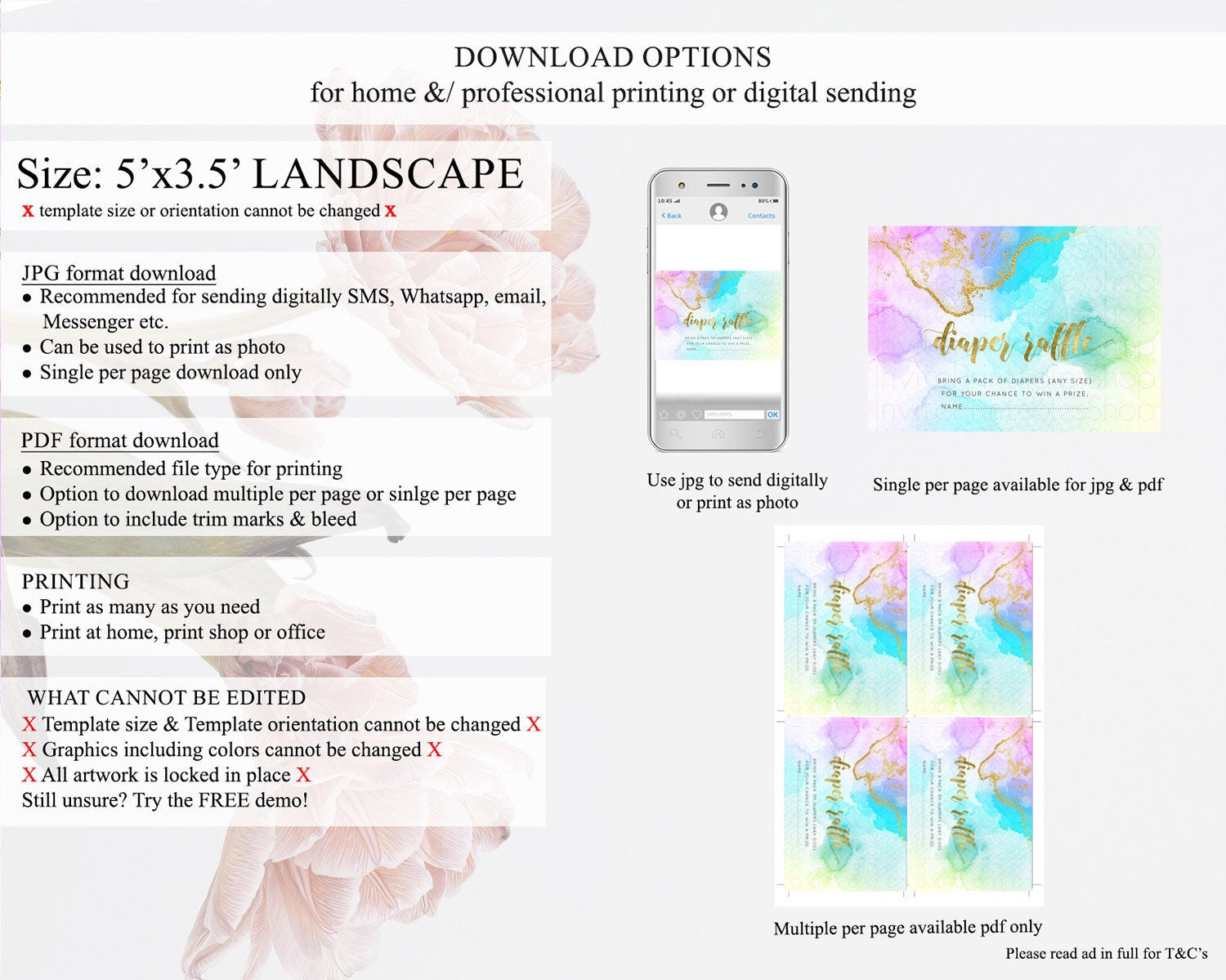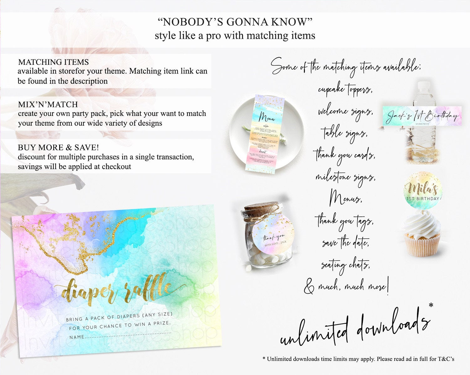Pastel Diaper Raffle Card Pastel Rainbow Diaper Raffle Insert Colorful Ombre Watercolor Diaper Ticket Confetti Glitter Raffle Game D10392