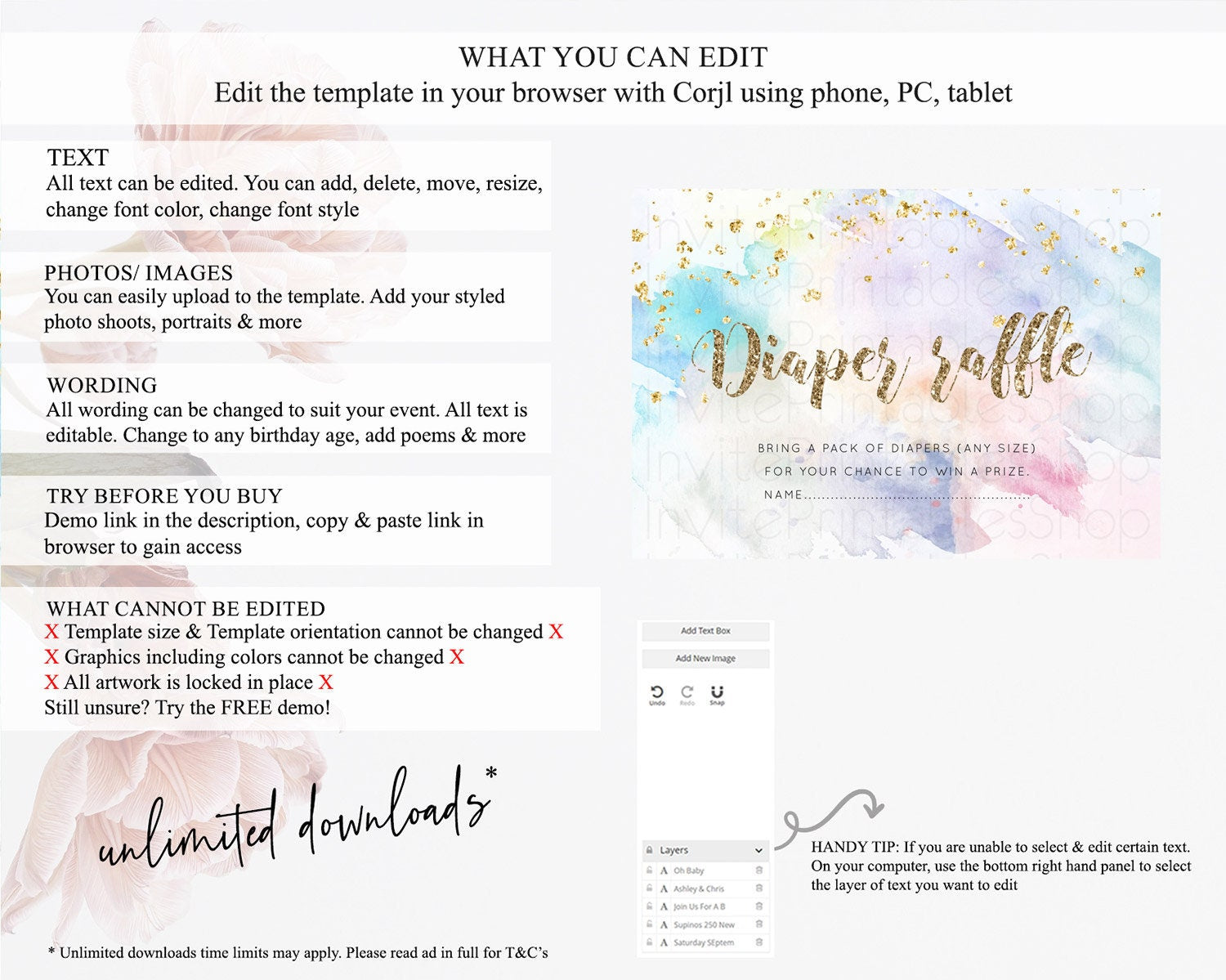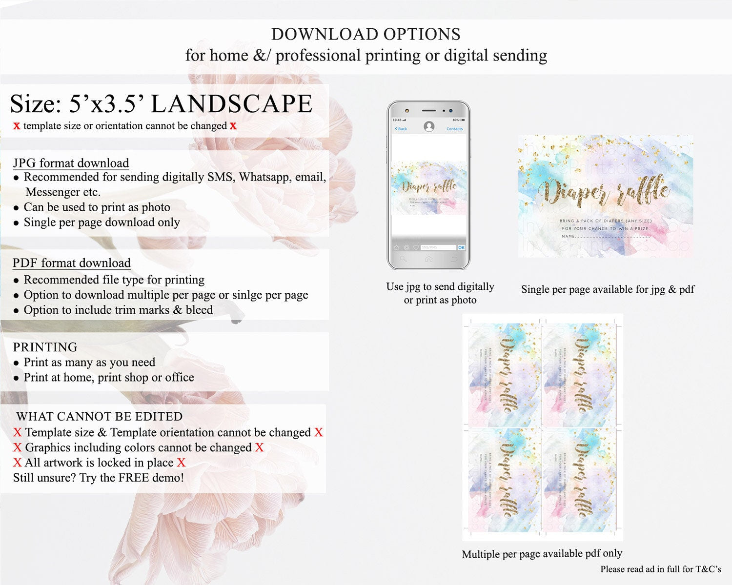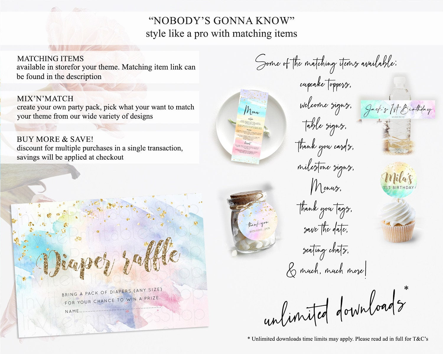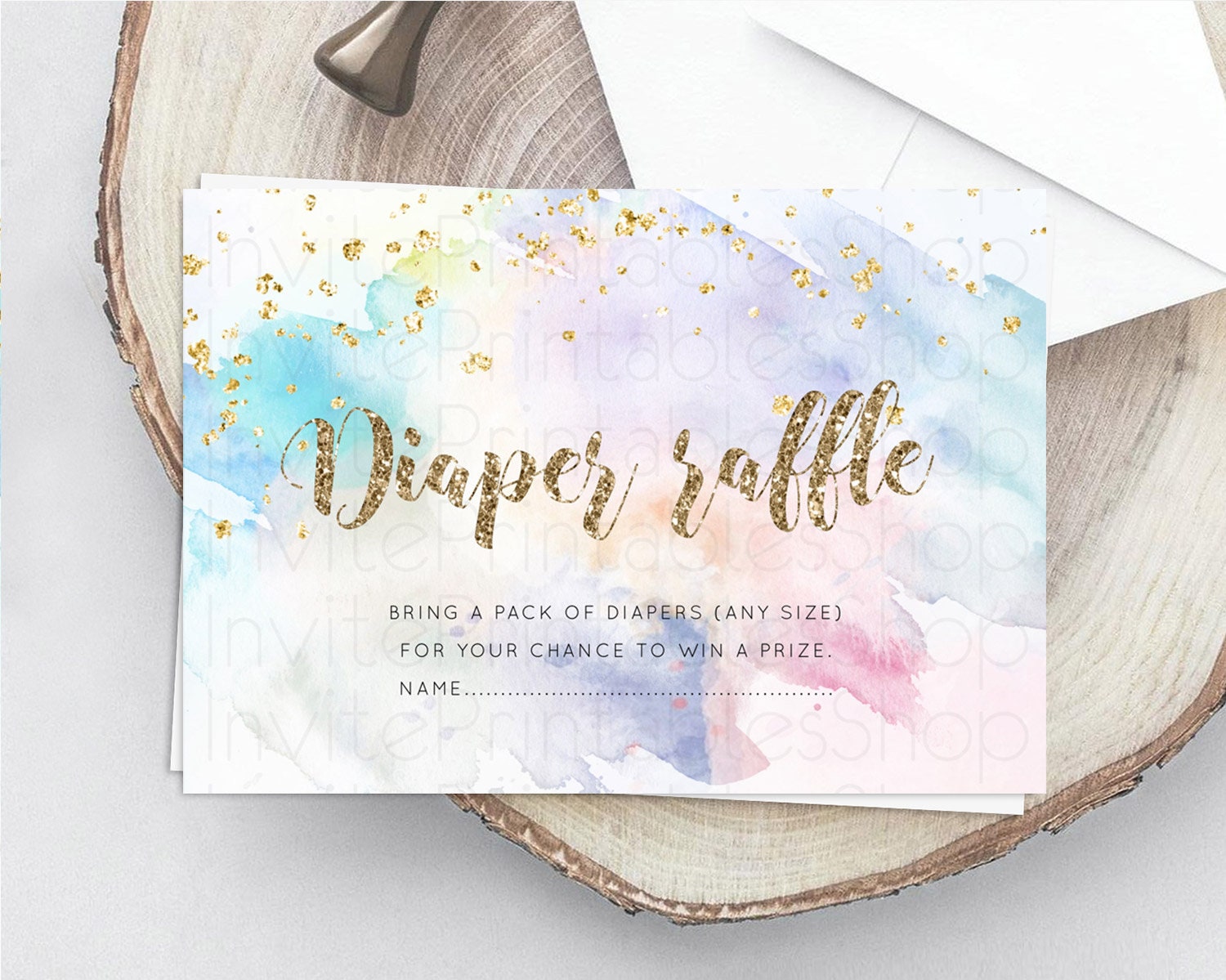 Pastel Diaper Raffle Card Pastel Rainbow Diaper Raffle Insert Colorful Ombre Watercolor Diaper Ticket Confetti Glitter Raffle Game D10421
