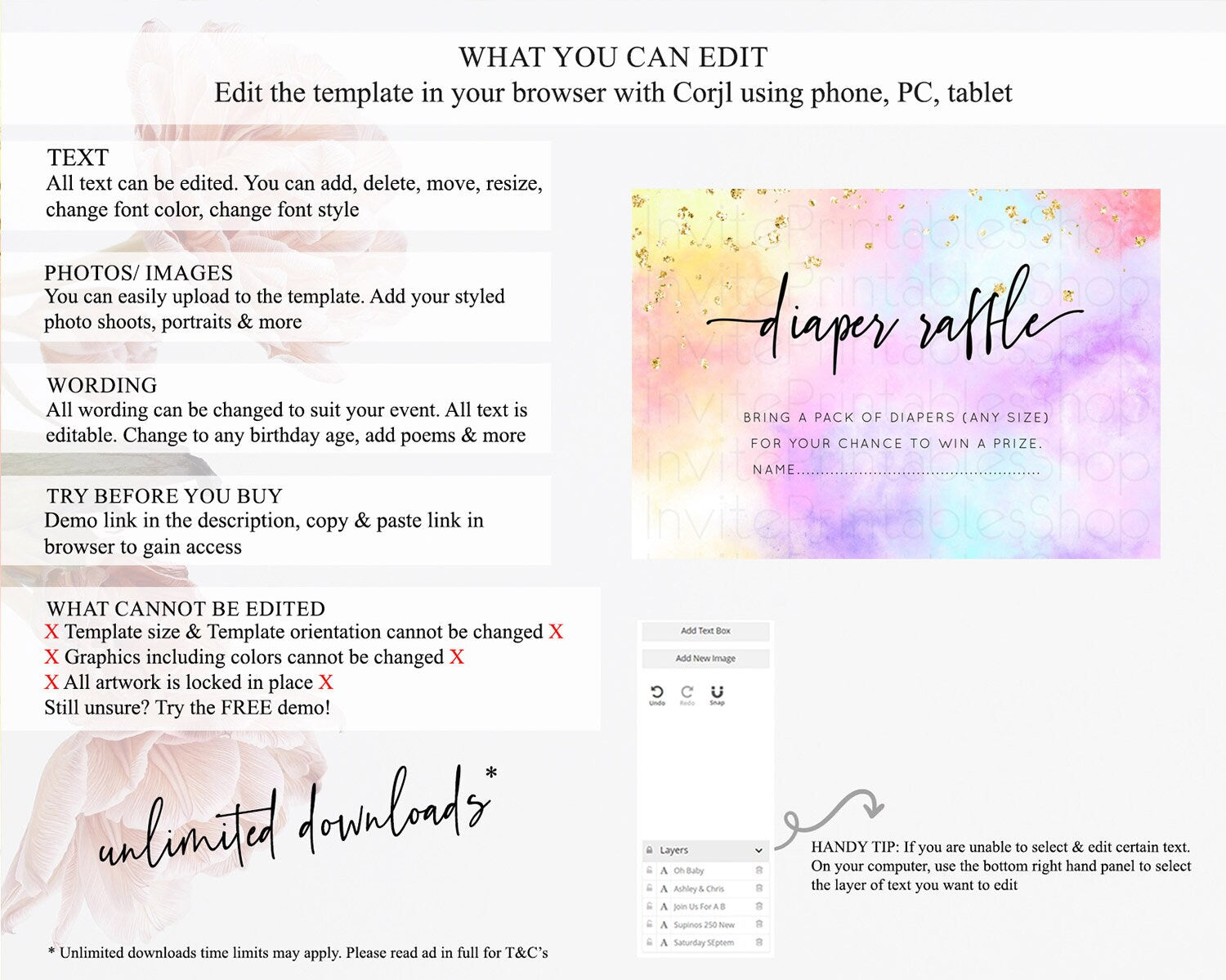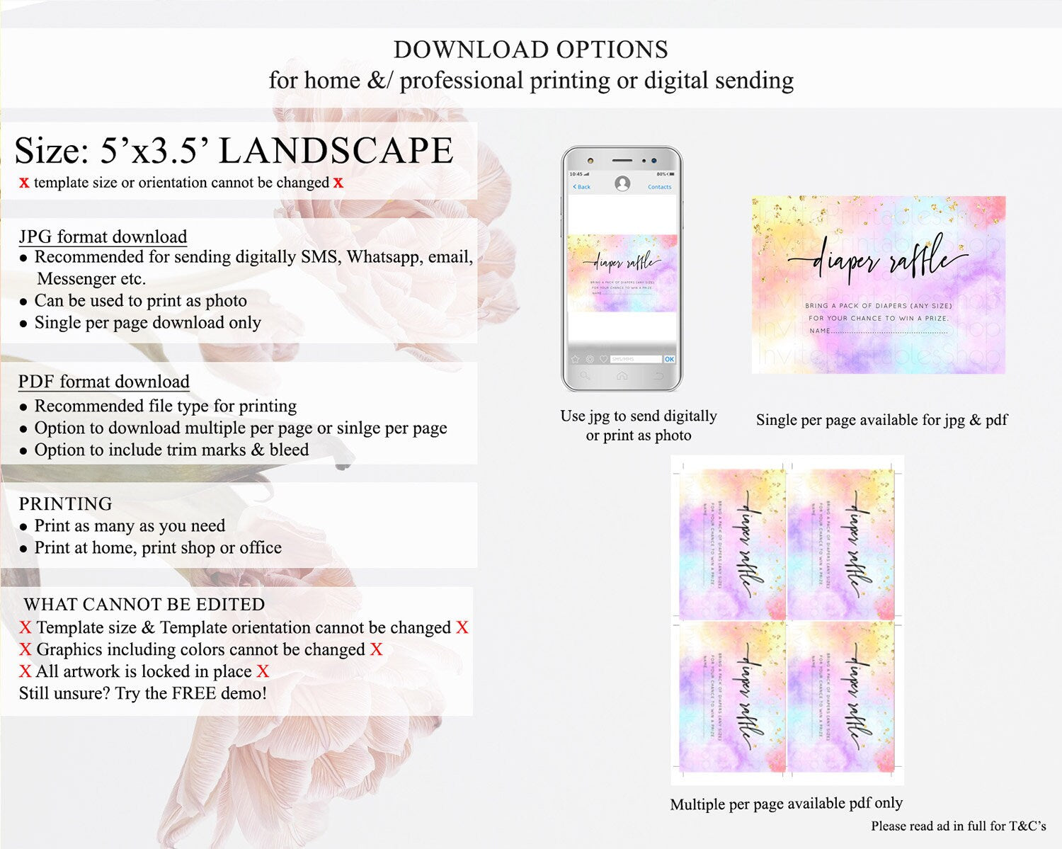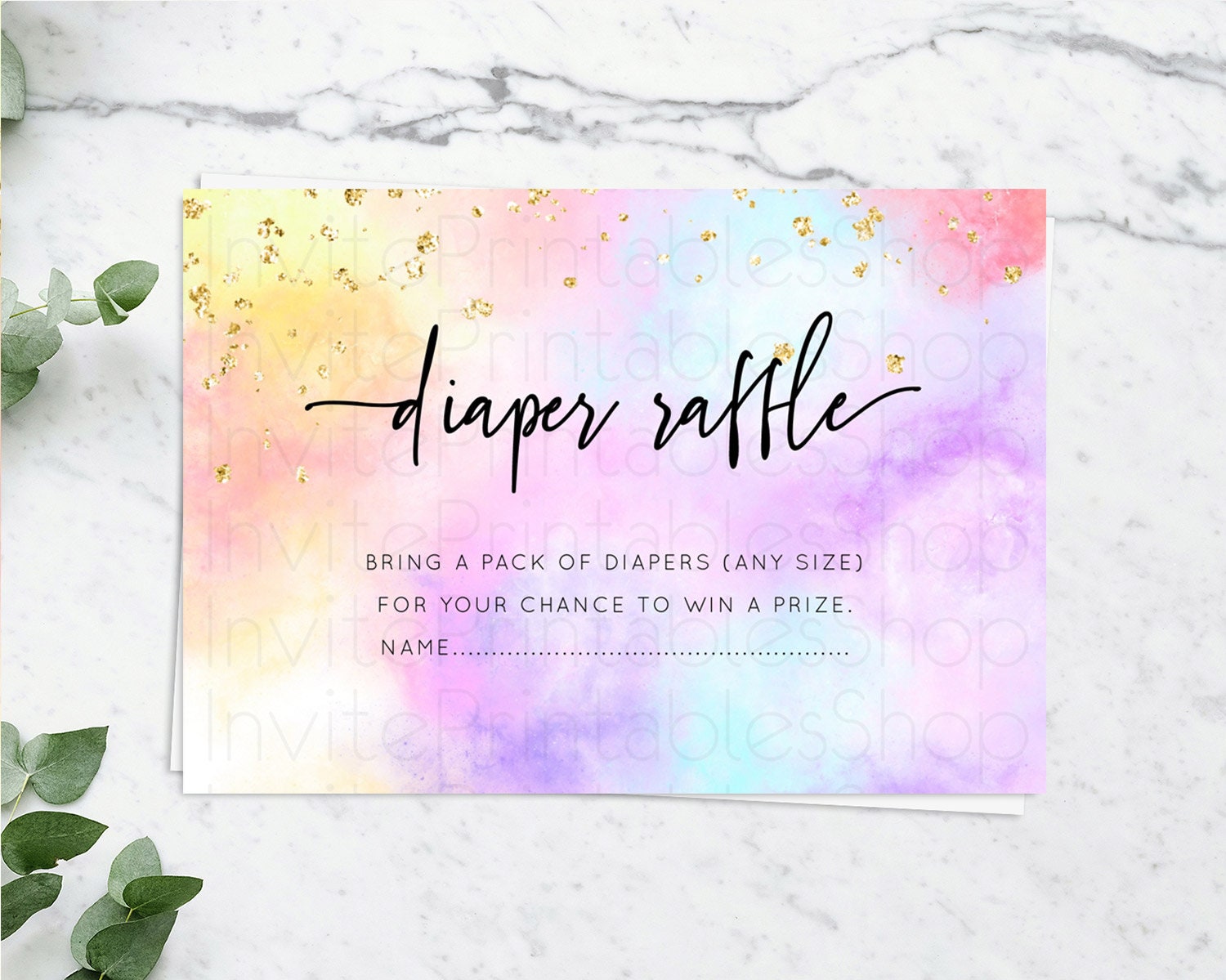 Pastel Diaper Raffle Card Pastel Rainbow Diaper Raffle Insert Colorful Ombre Watercolor Diaper Ticket Confetti Glitter Raffle Game D10437