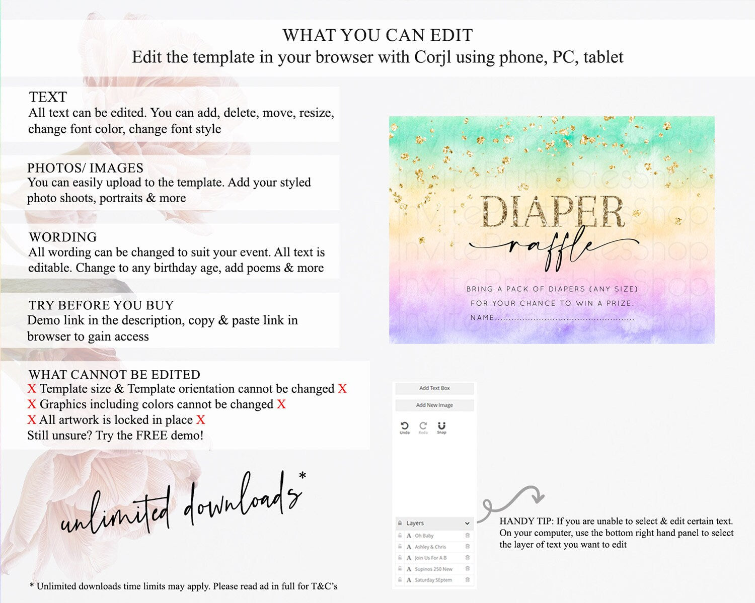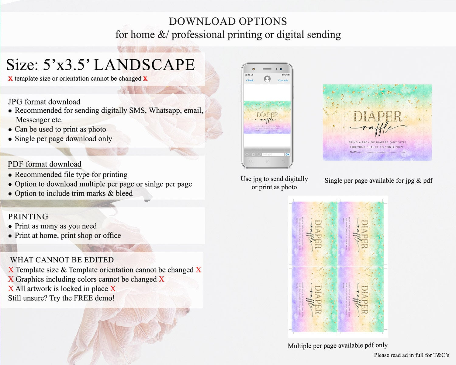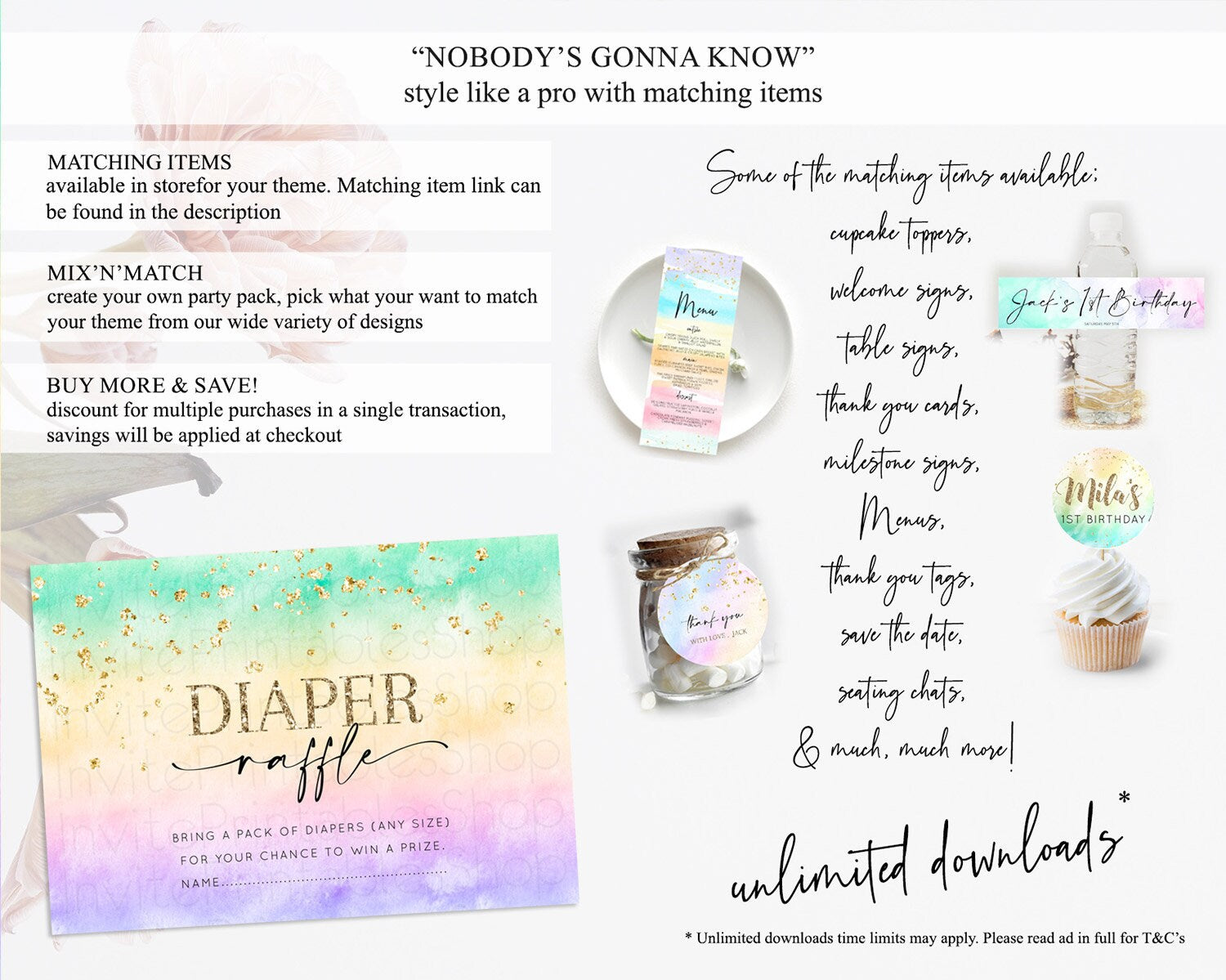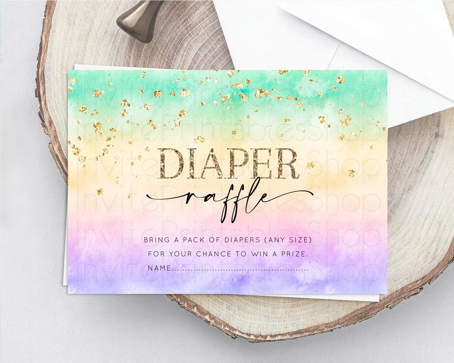 Pastel Diaper Raffle Card Pastel Rainbow Diaper Raffle Insert Colorful Ombre Watercolor Diaper Ticket Confetti Glitter Raffle Game D10481