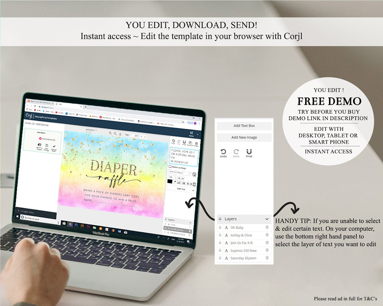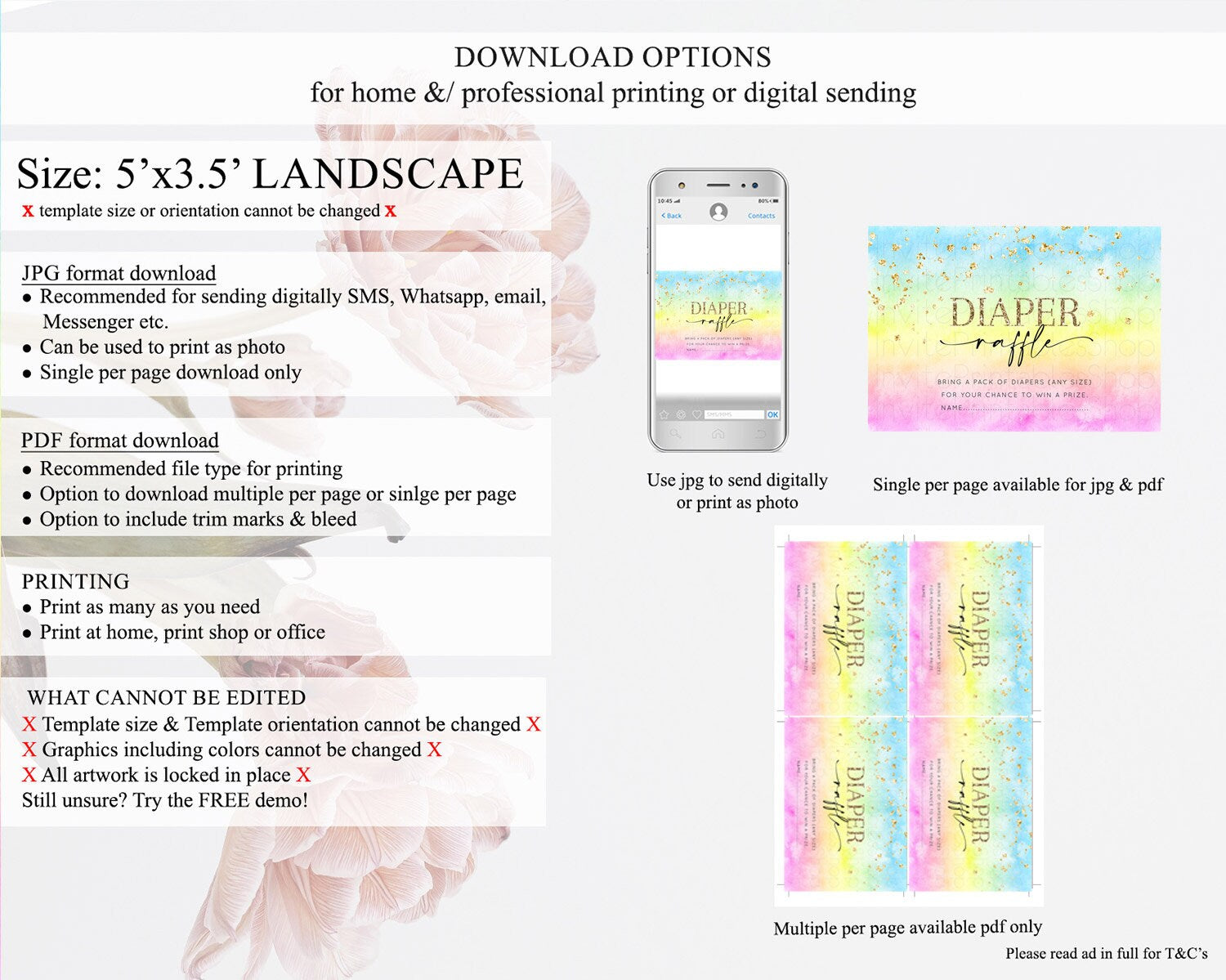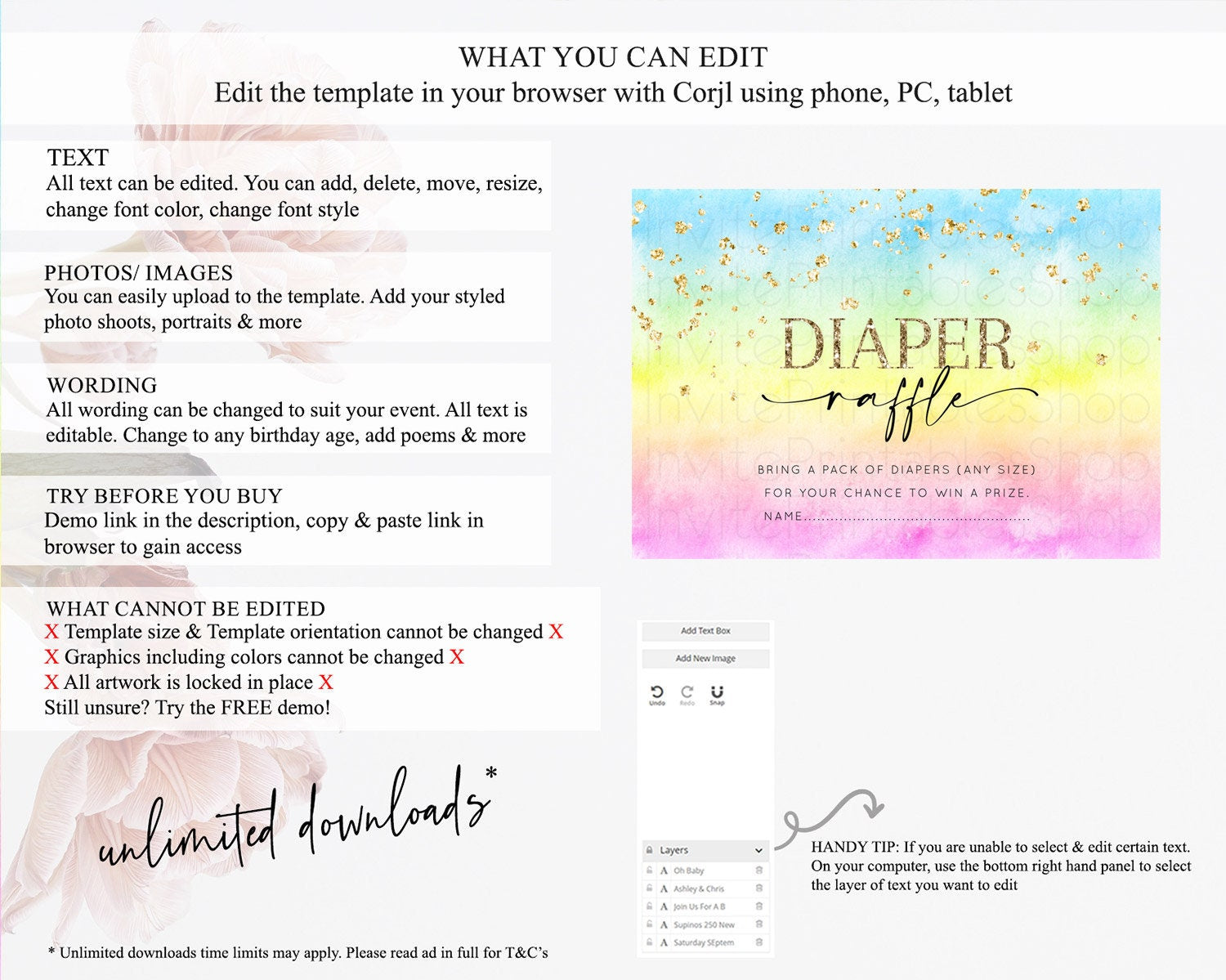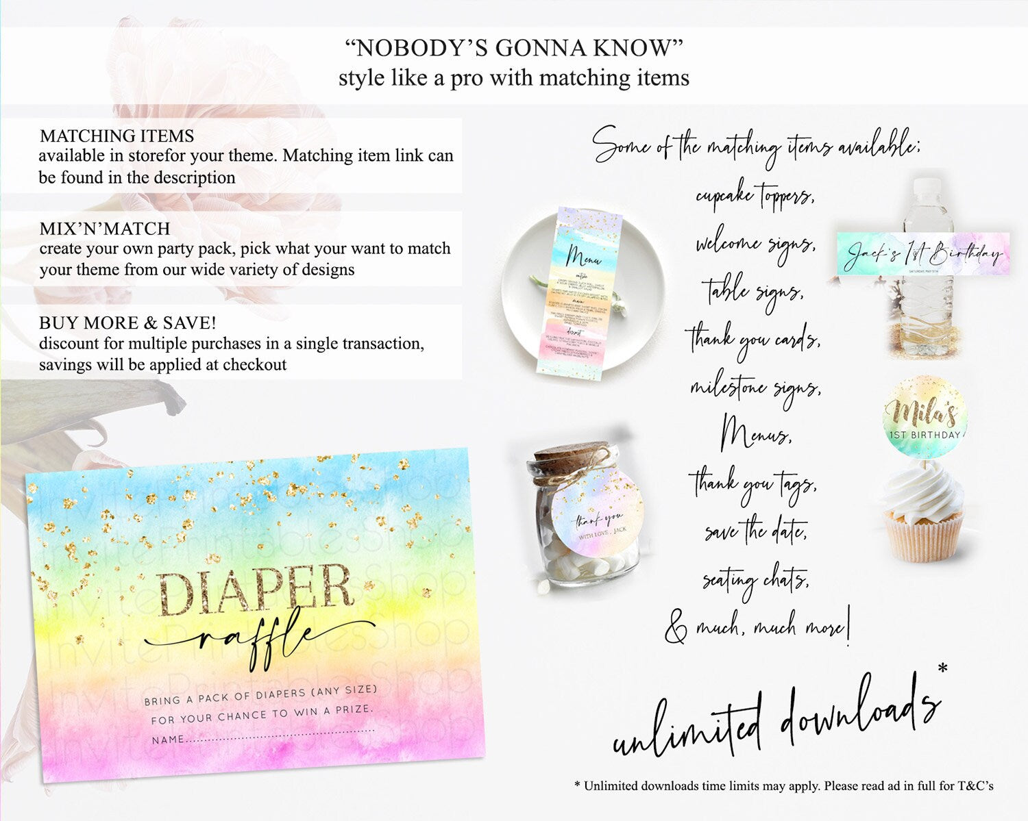 Pastel Diaper Raffle Card Pastel Rainbow Diaper Raffle Insert Colorful Ombre Watercolor Diaper Ticket Confetti Glitter Raffle Game D10483