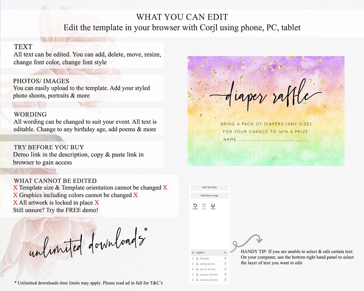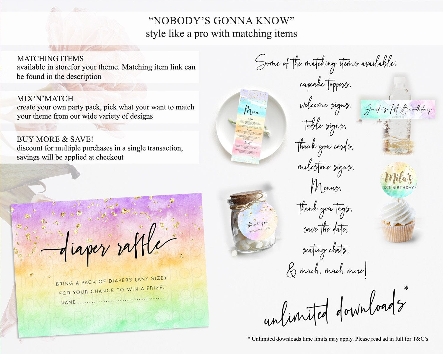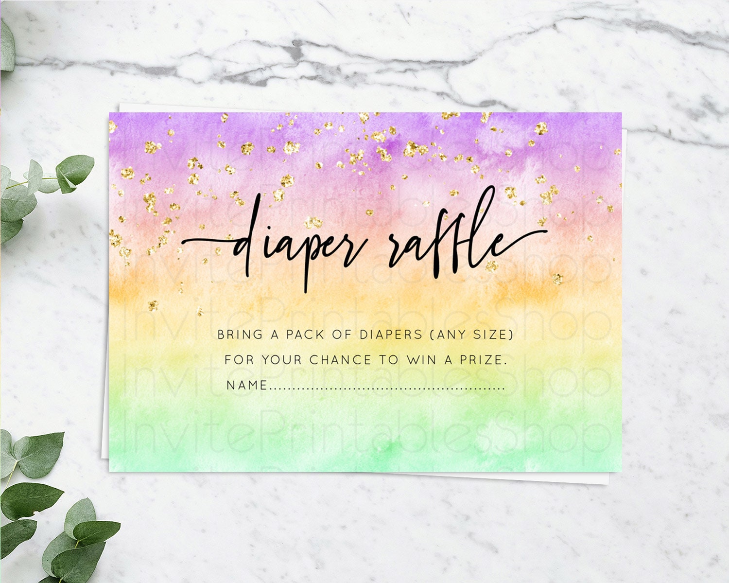 Pastel Diaper Raffle Card Pastel Rainbow Diaper Raffle Insert Colorful Ombre Watercolor Diaper Ticket Confetti Glitter Raffle Game D10514