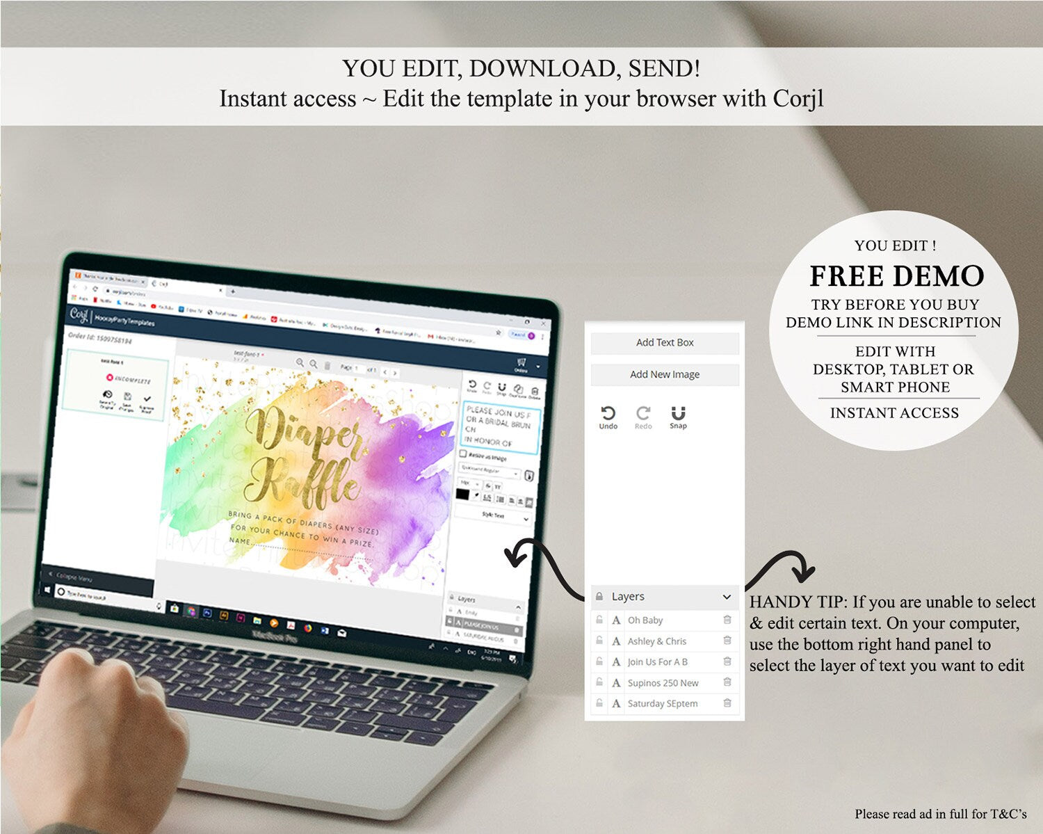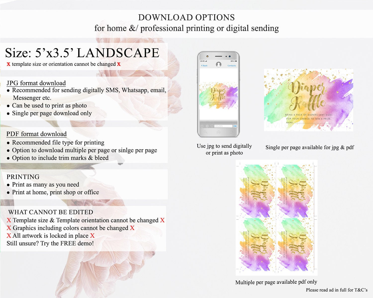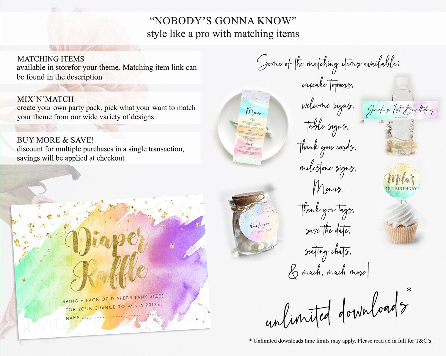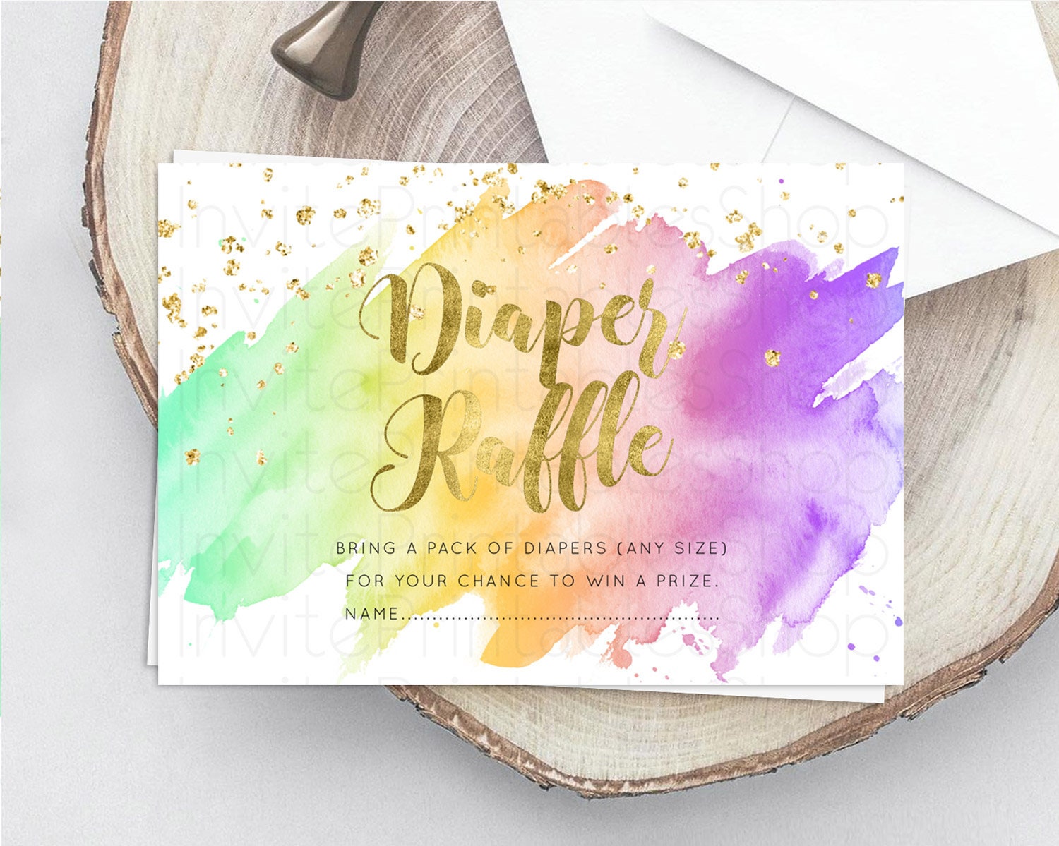 Pastel Diaper Raffle Card Pastel Rainbow Diaper Raffle Insert Colorful Ombre Watercolor Diaper Ticket Confetti Glitter Raffle Game D10517