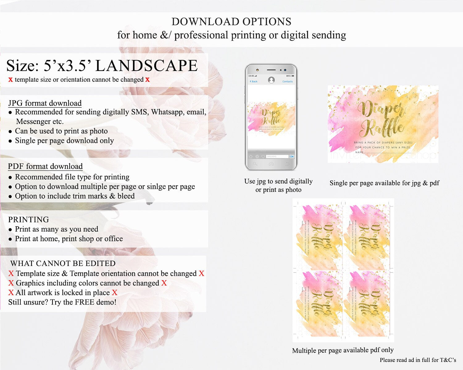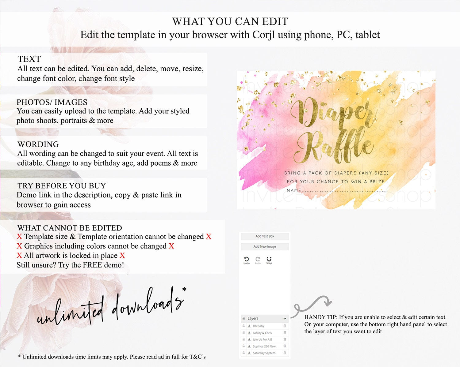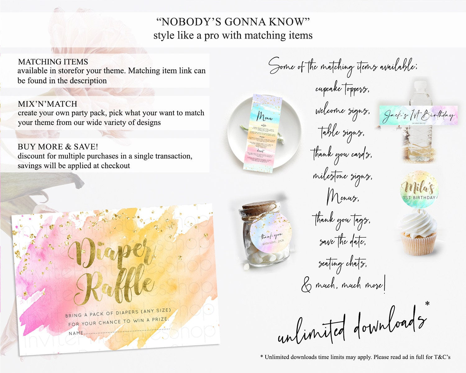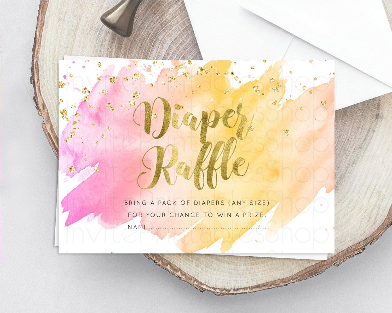 Pastel Diaper Raffle Card Pastel Rainbow Diaper Raffle Insert Colorful Ombre Watercolor Diaper Ticket Confetti Glitter Raffle Game D10526