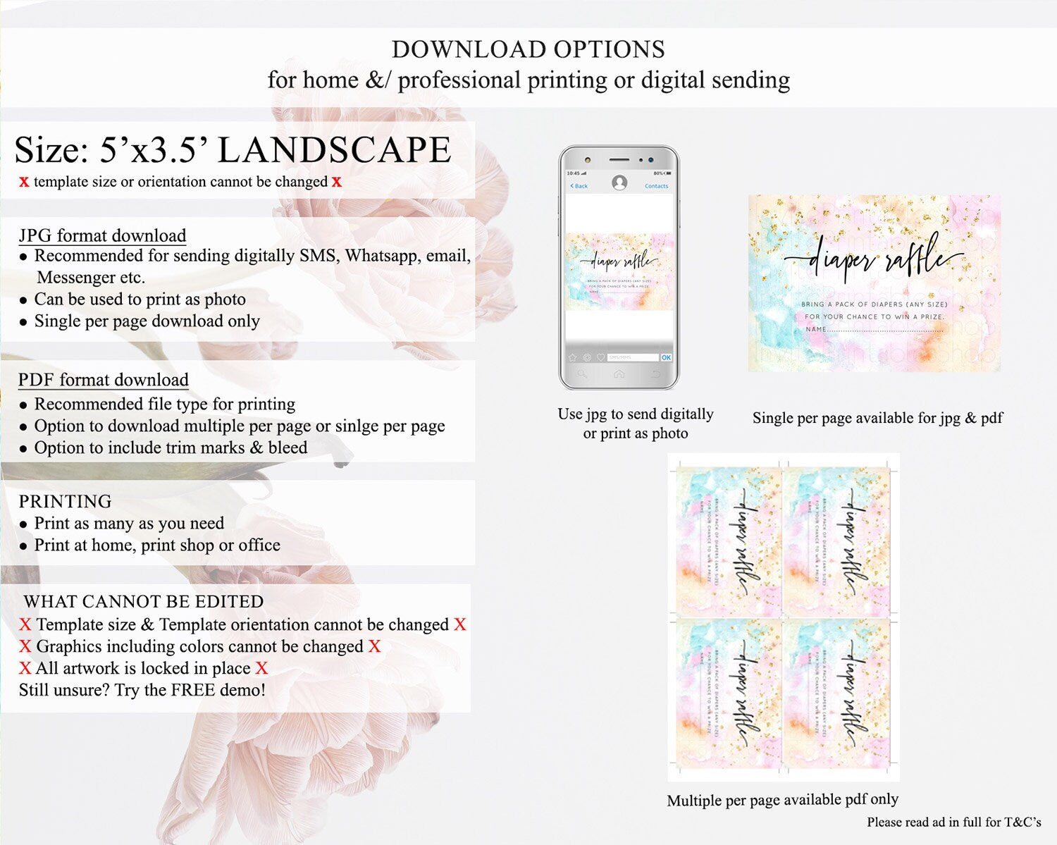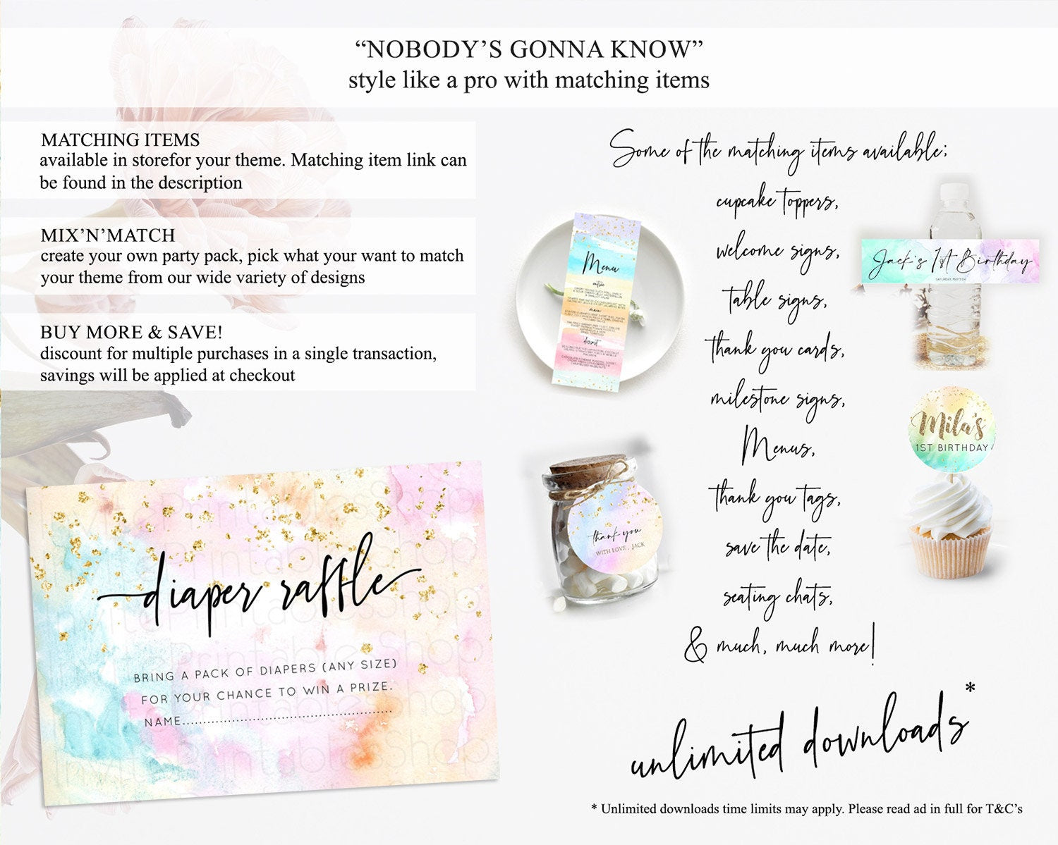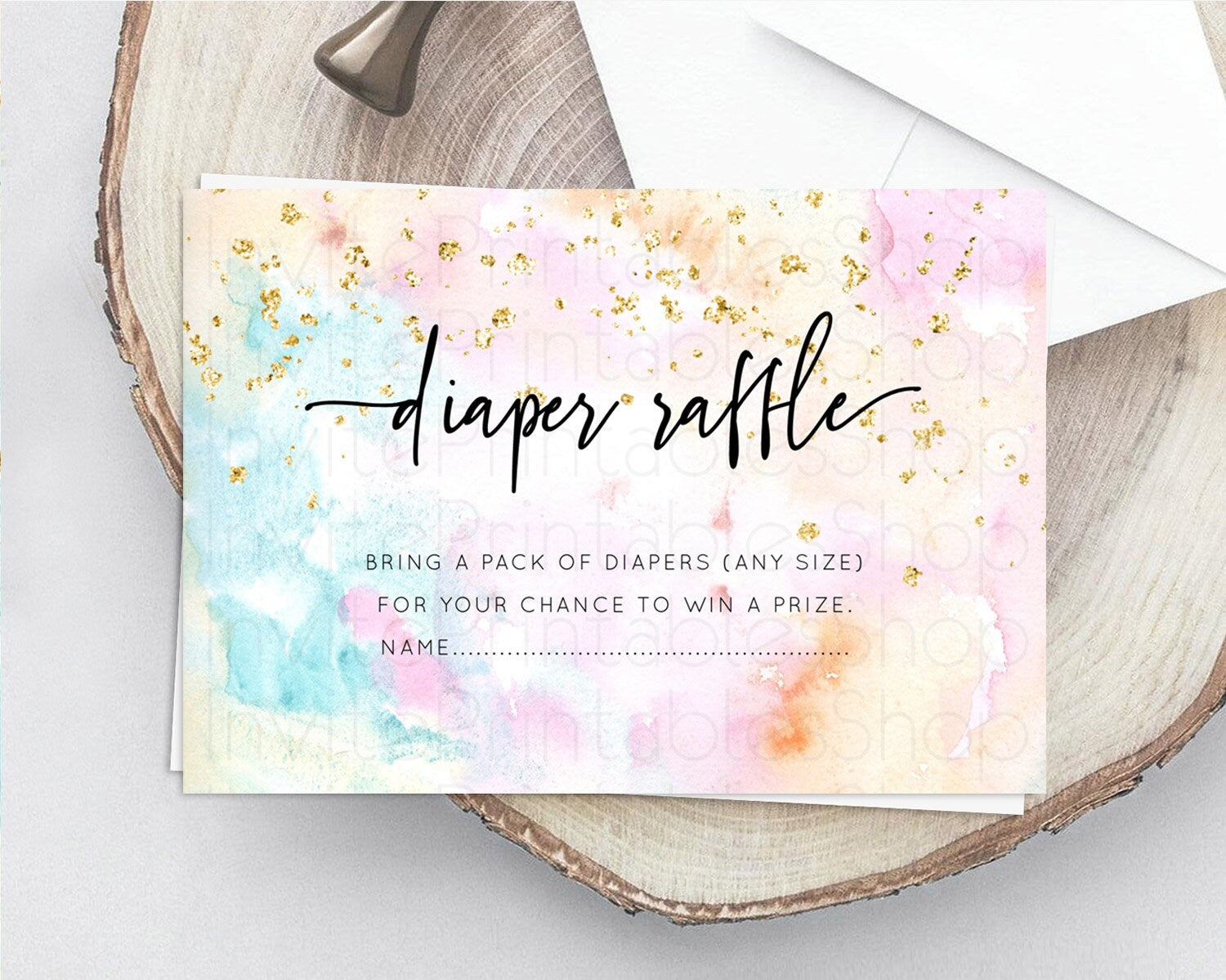 Pastel Diaper Raffle Card Pastel Rainbow Diaper Raffle Insert Colorful Ombre Watercolor Diaper Ticket Confetti Glitter Raffle Game D10548