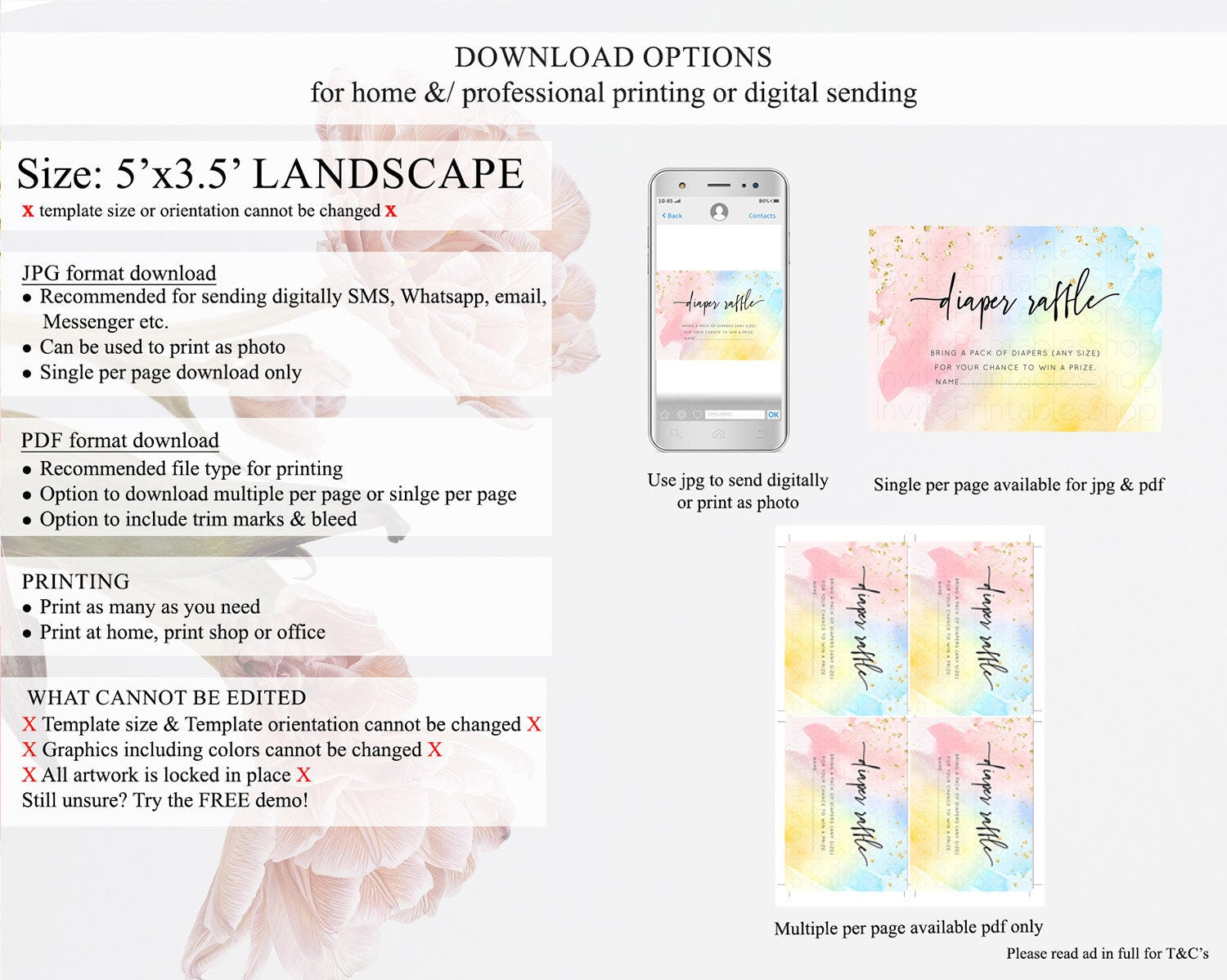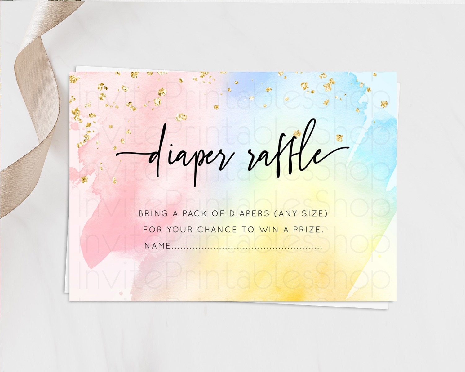Pastel Diaper Raffle Card Pastel Rainbow Diaper Raffle Insert Colorful Ombre Watercolor Diaper Ticket Confetti Glitter Raffle Game D10557