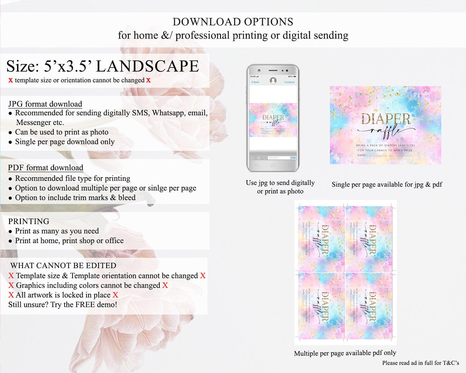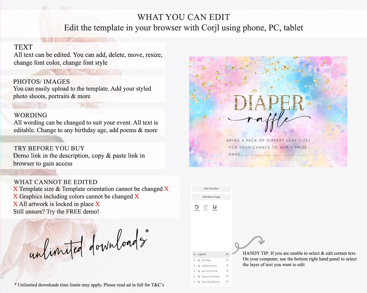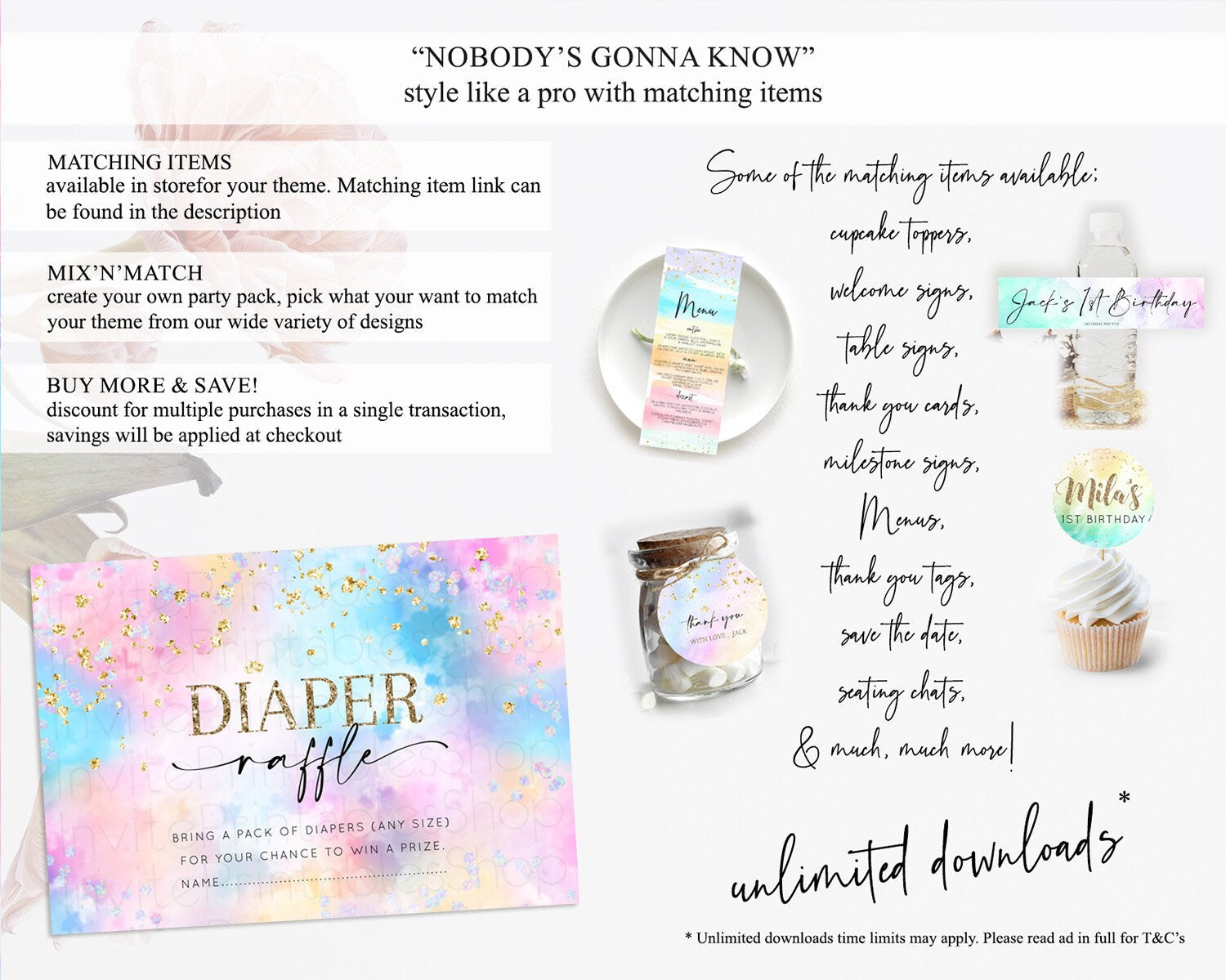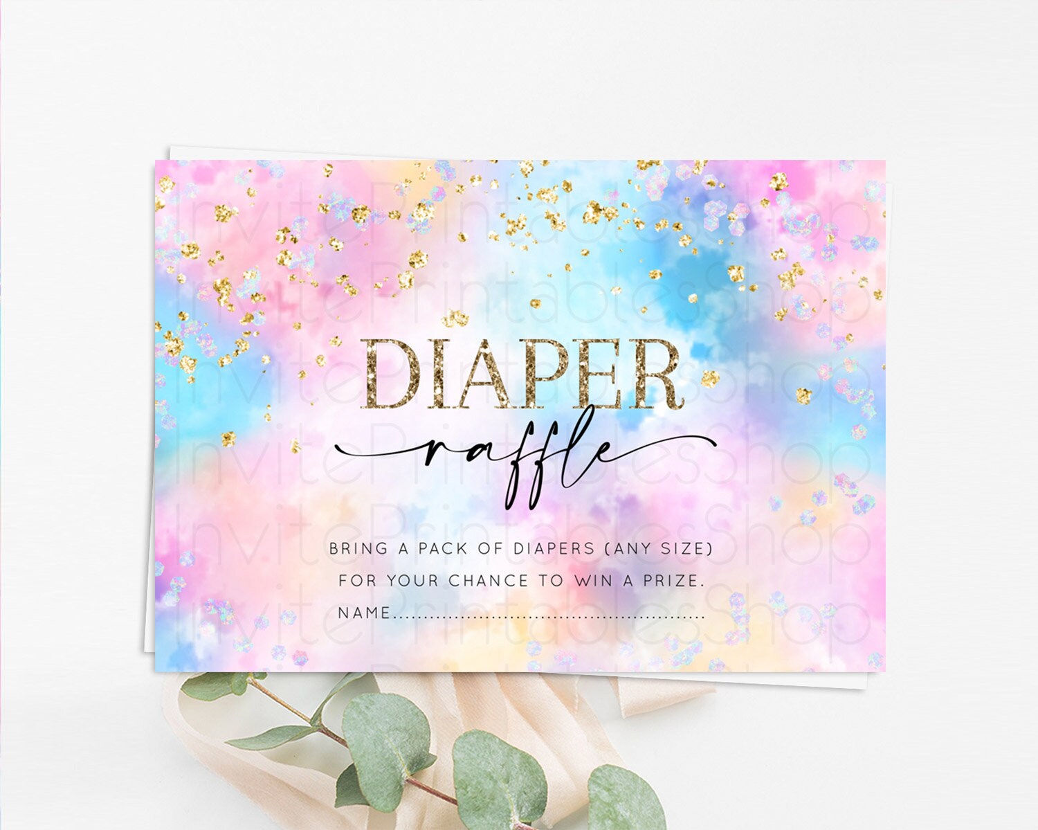 Pastel Diaper Raffle Card Pastel Rainbow Diaper Raffle Insert Colorful Ombre Watercolor Diaper Ticket Confetti Glitter Raffle Game D10607